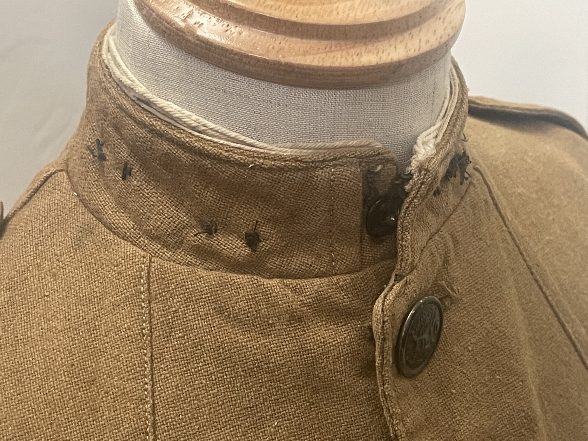 The tunic has a piece of piping around the top of the collar, possibly as a shirt-collar. There are also several strings which appear to be a part of this, but are now loose. There are thread remnants at the collar and epaulets, possibly from sewn-on insignia, which is no longer present.