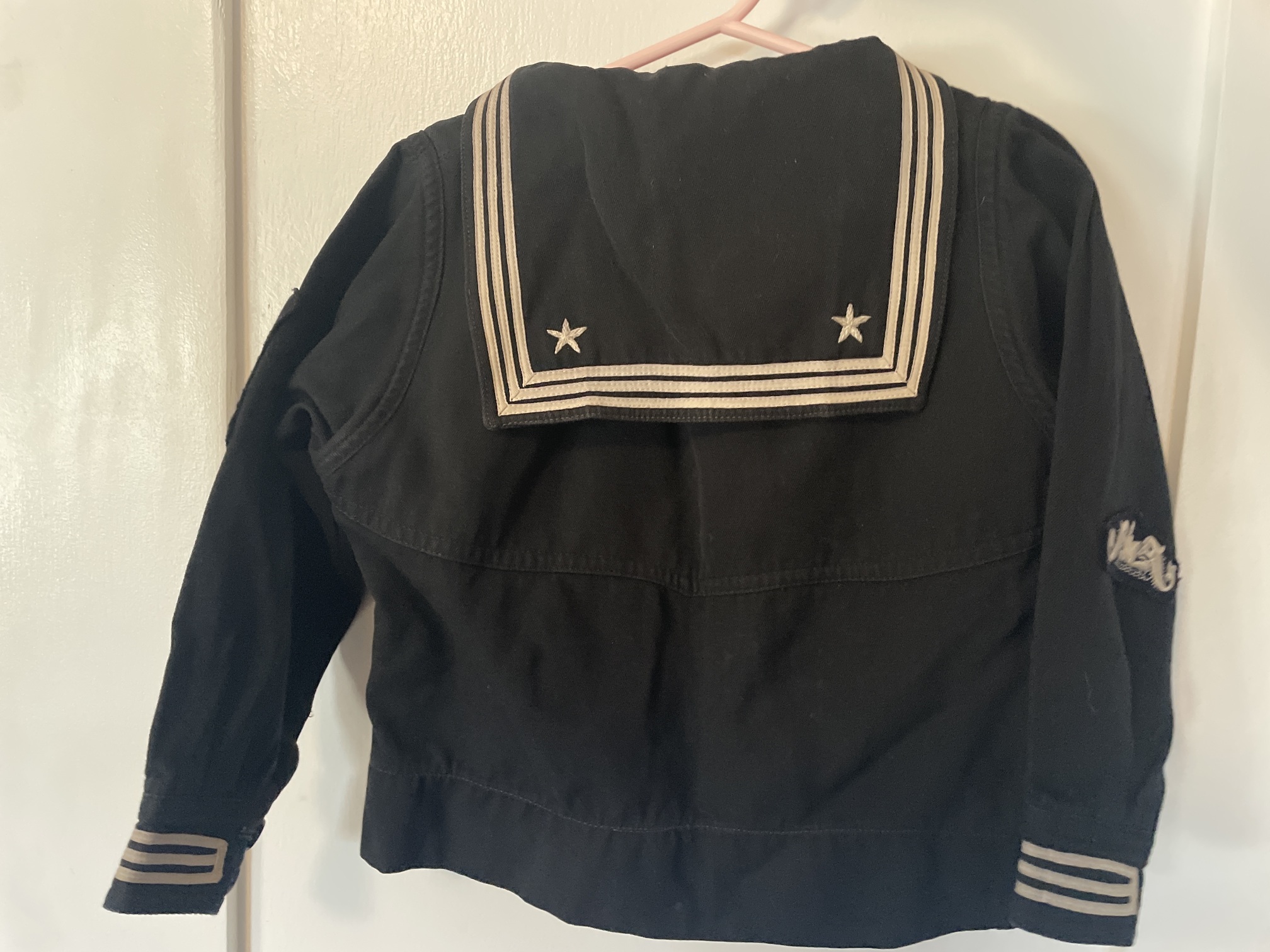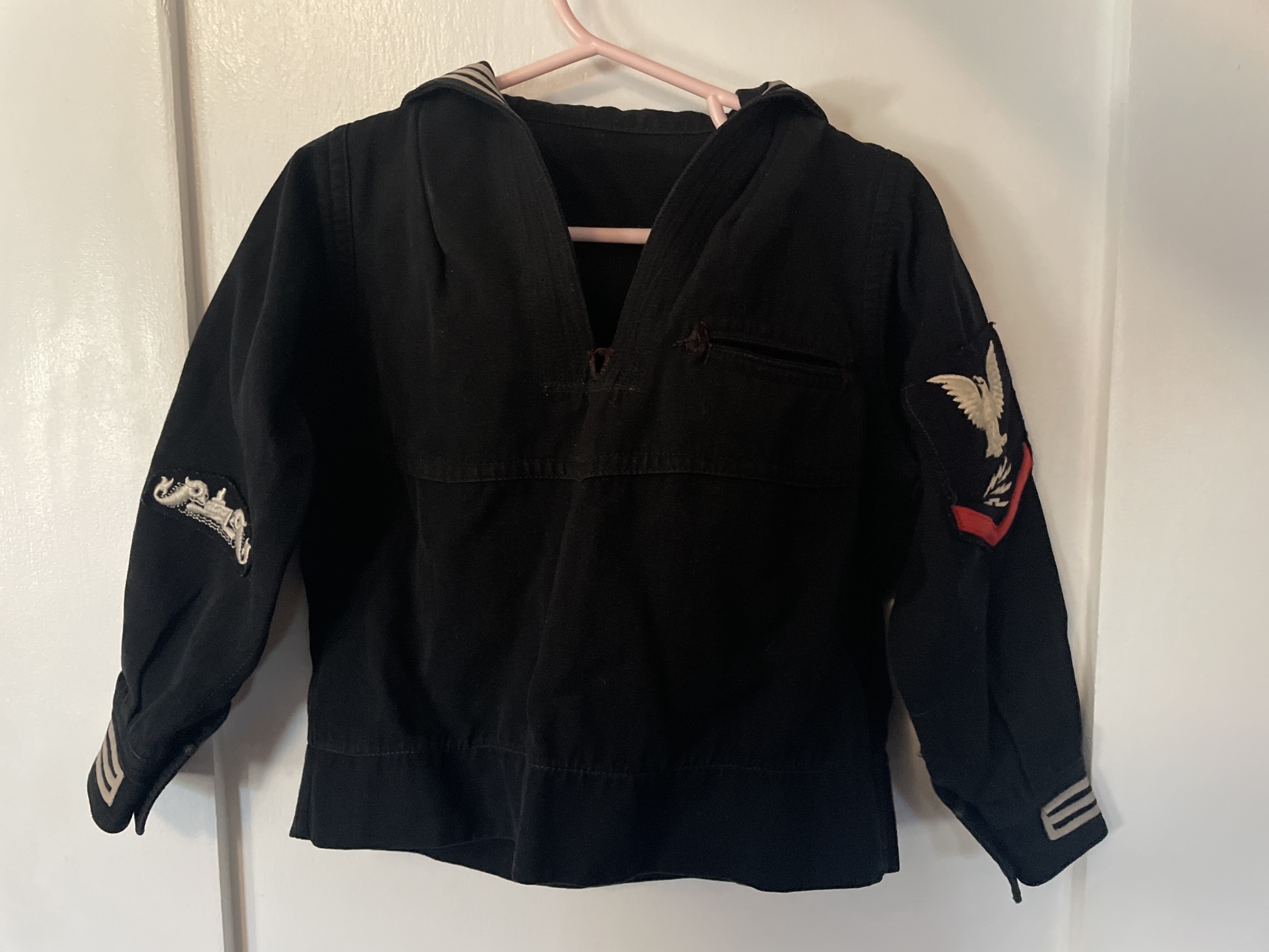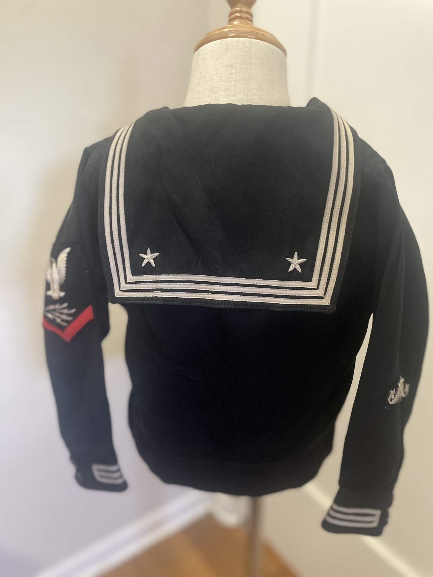Blue jumper, for a 3-4 year old. Embroidered Submarine Warfare badge correctly placed on the lower right sleeve. Radioman 3rd Class (RM3c) rating on the left sleeve. Hand-sewn stars on the collar. Two small plastic anchor buttons at each cuff. Machine-sewn, very well made, with some hand-sewn details.
