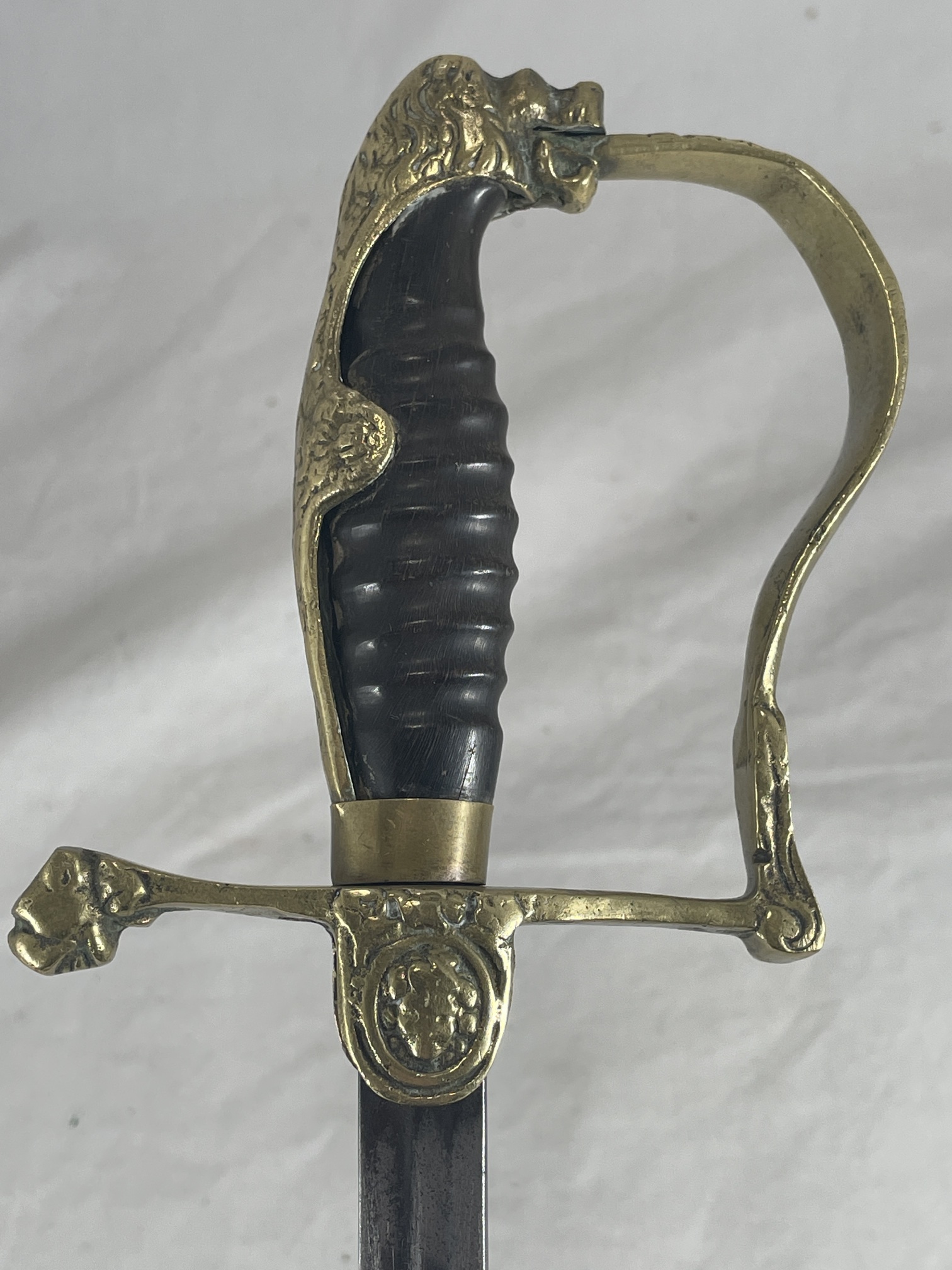 A German Army child's saber, with 20 1/2" curved steel blade with two fullers on each side, running just over half the length. Brass-hilted, with lion's head pommel, a leopard's head on the cross guard, and two crossed swords. Handle of unknown brown material, possibly horn, with cracks and visible grain.