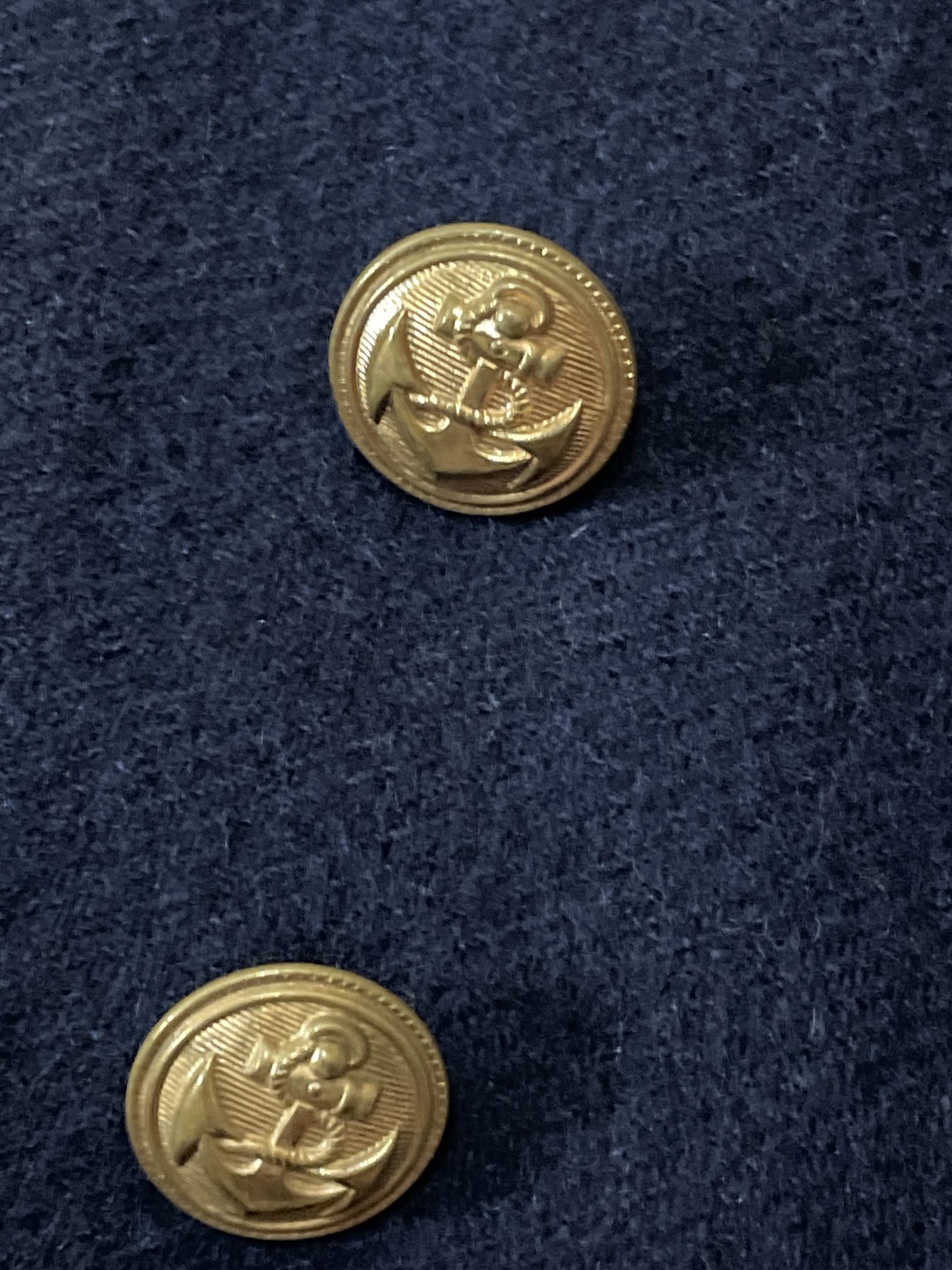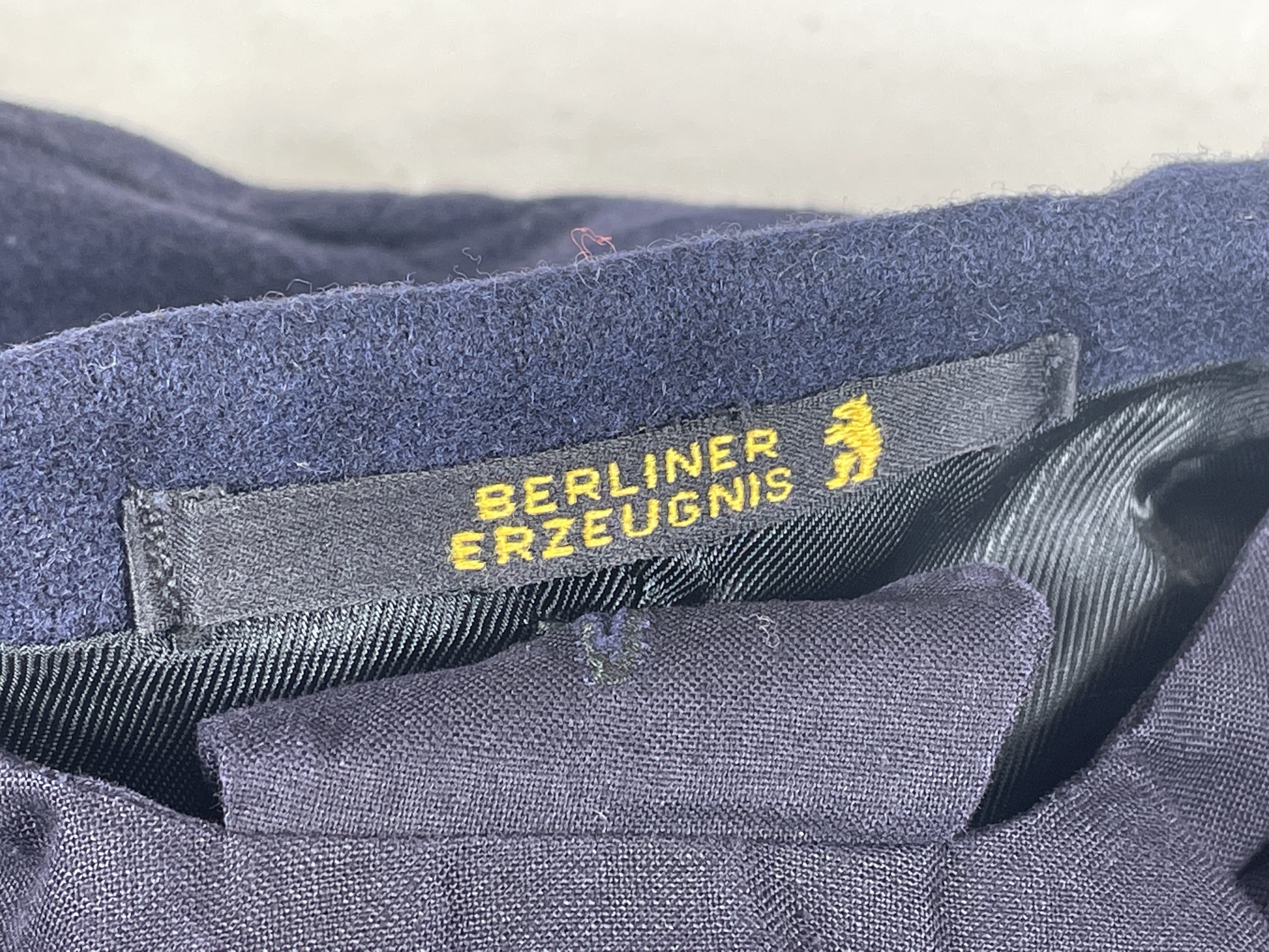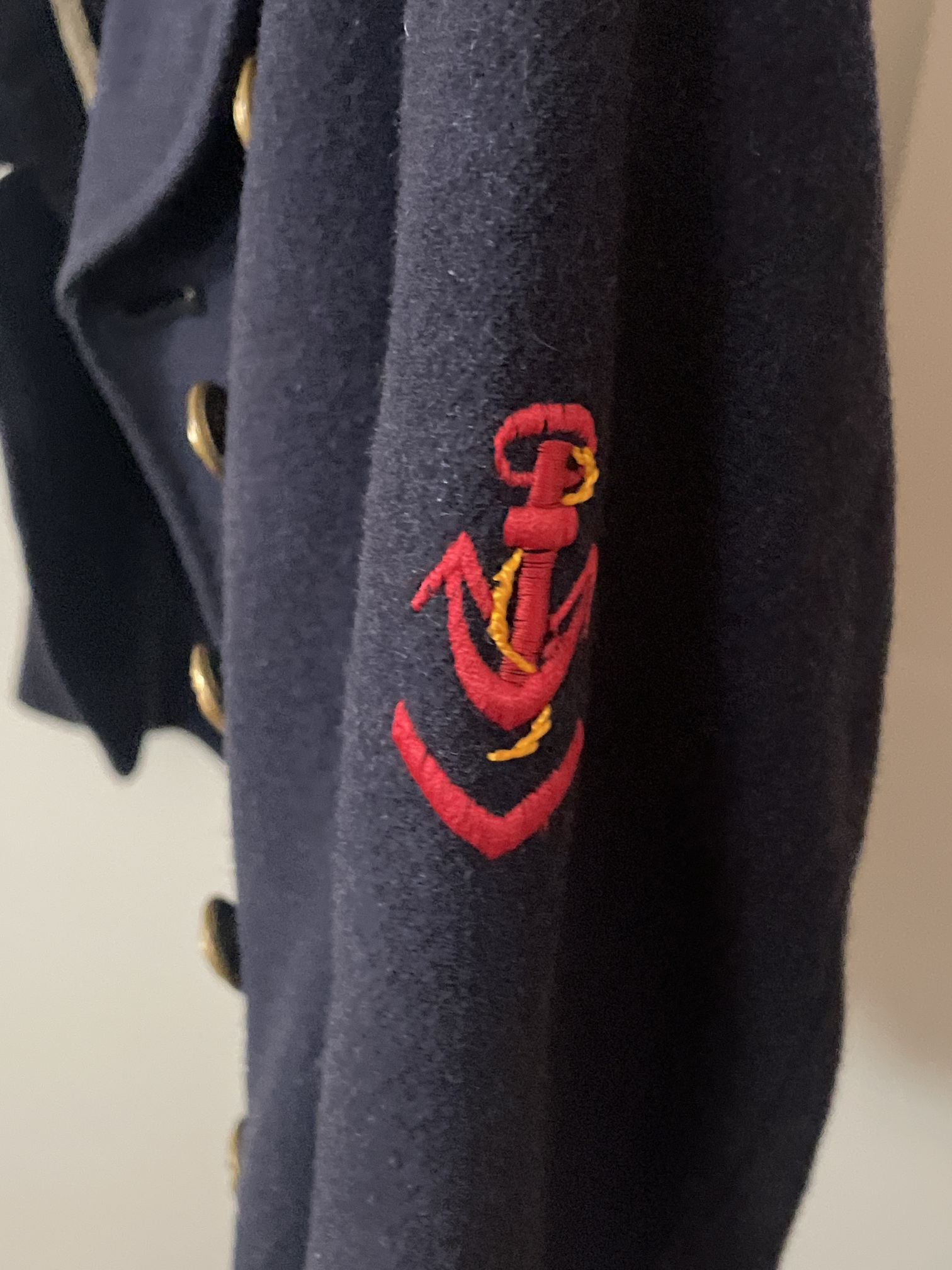 The Jacket is open-front, with two rows of 5 brass buttons. The center button-link is missing. The cuffs have a thin gold stripe, and three small buttons. It is lined in black twill rayon (?), with striped sleeve lining. A vertical red anchor, fouled with a golden rope, over a single red chevron, is directly embroidered on the left sleeve. There is a woven label inside the collar, with "BERLINER | ERZEUGNIS", followed by a standing bear facing left.