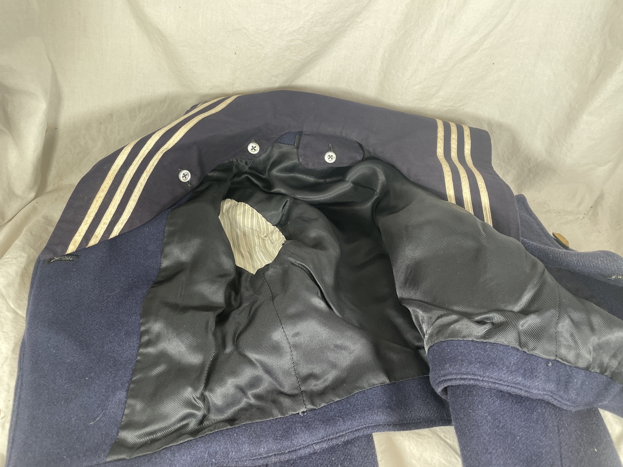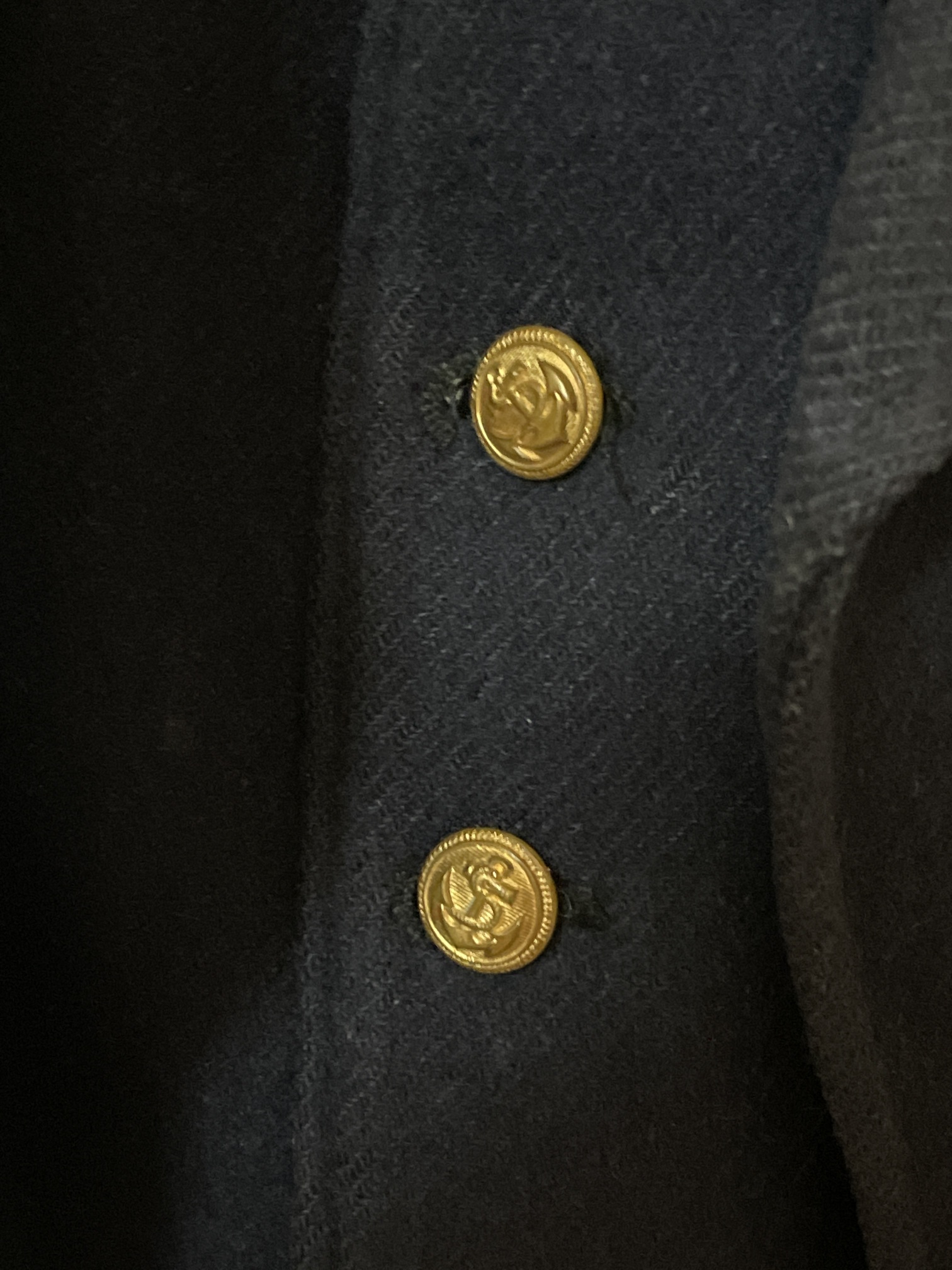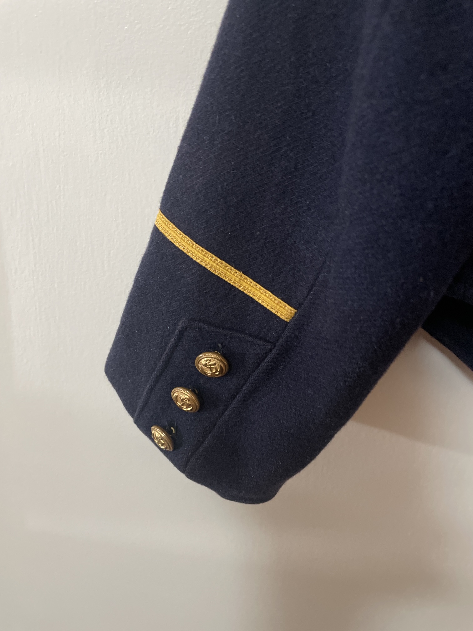 The Jacket is open-front, with two rows of 5 brass buttons. The center button-link is missing. The cuffs have a thin gold stripe, and three small buttons. It is lined in black twill rayon (?), with striped sleeve lining. A vertical red anchor, fouled with a golden rope, over a single red chevron, is directly embroidered on the left sleeve. There is a woven label inside the collar, with "BERLINER | ERZEUGNIS", followed by a standing bear facing left.
