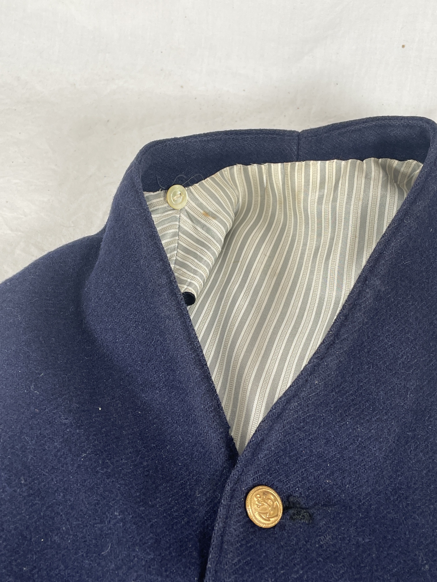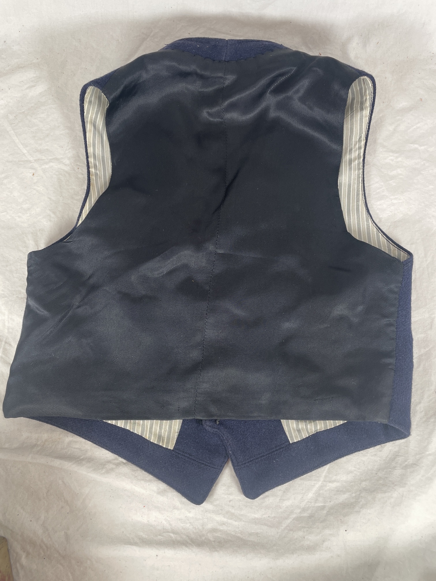 The waistcoat is a similar blue wool, with four sleeve-sized buttons. The back is black rayon, and the inside and pockets are lined in the same silver/white striped lining as the sleeves of the jacket. There is a single mother-of-pearl button on the inside of each shoulder.