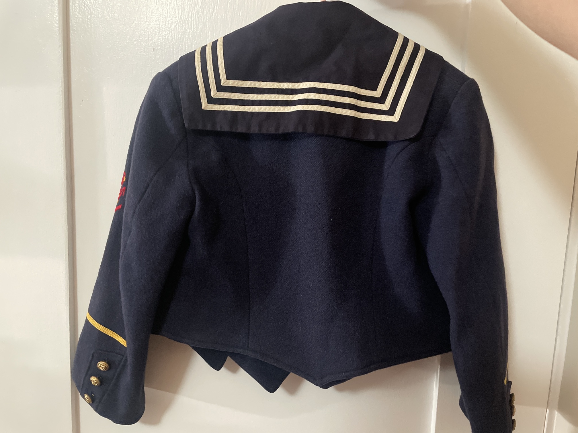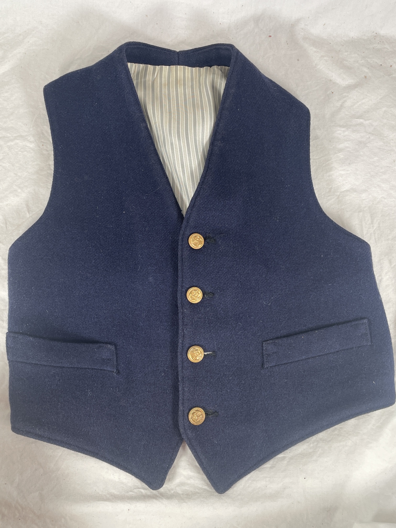 A blue wool Kriegsmarine uniform, made for a child of around four years of age. It consists of a wool waistcoat and Paradejacke (Affenjacke), and a cotton striped collar.
