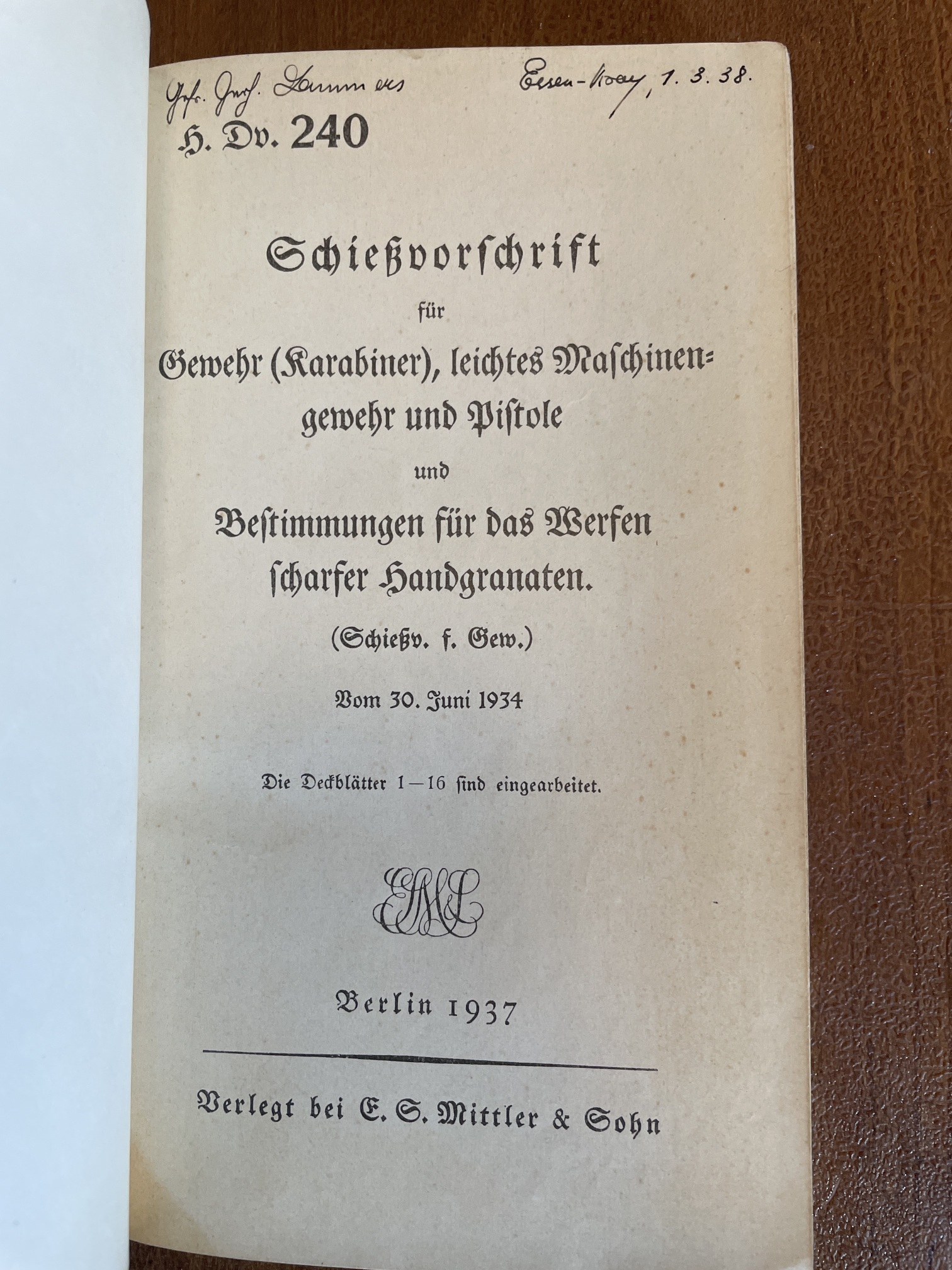 "Schießvorschrift für Gewehr (Karabiner), leichtes Maschinenengewehr, Pistole usw." H.Dv.240. Inscribed with date, 1.3.38. Hardcover. Spine loose.