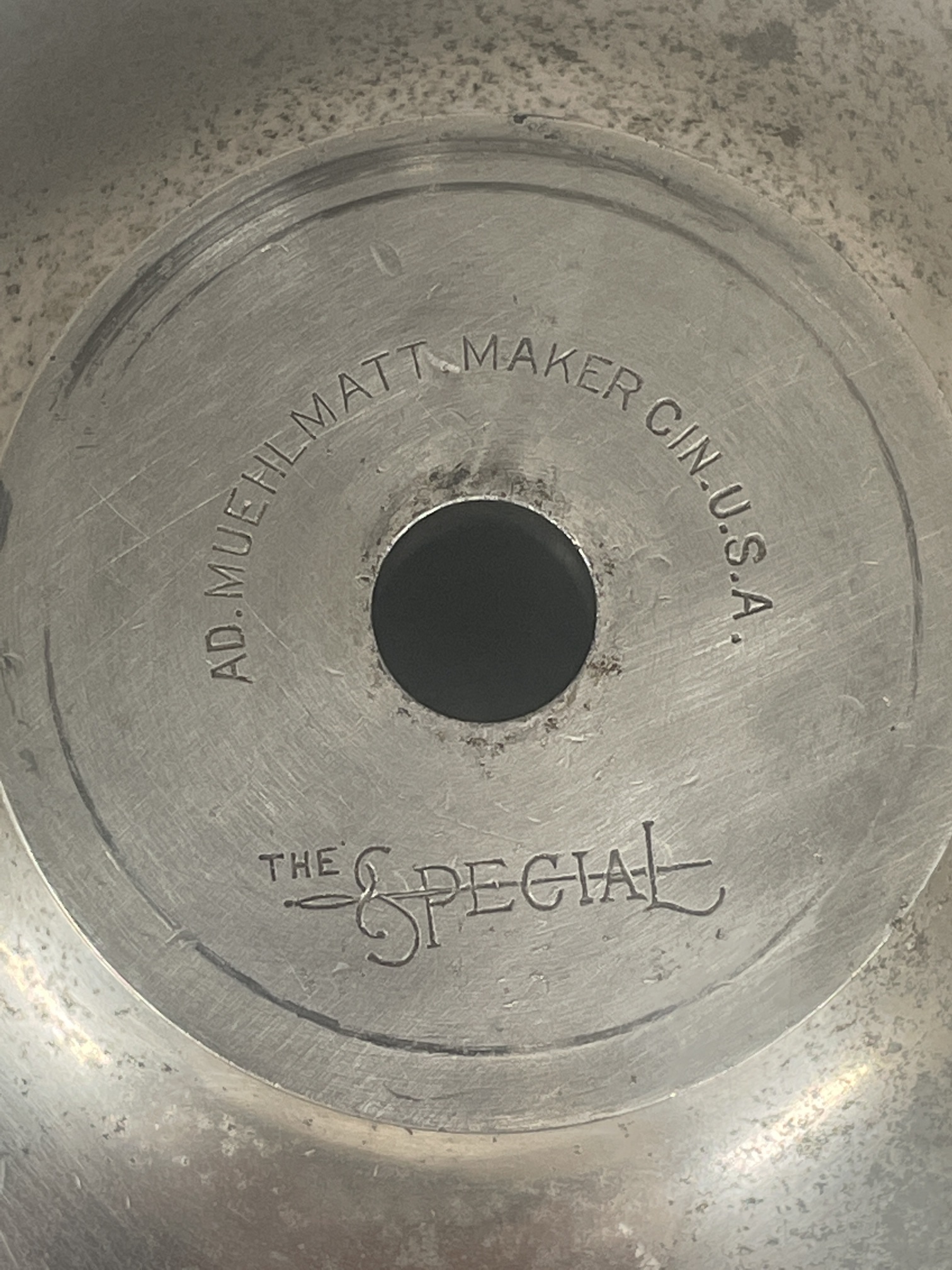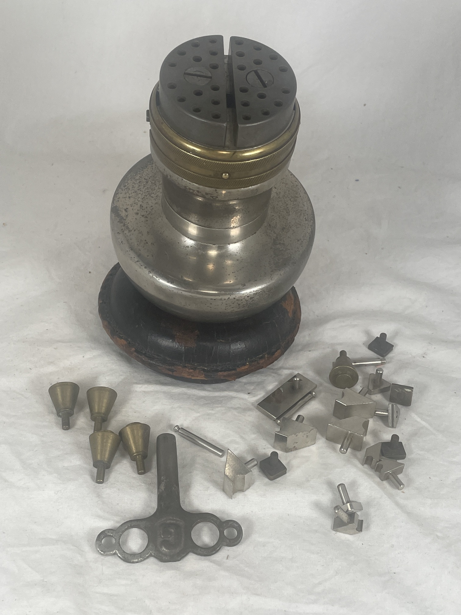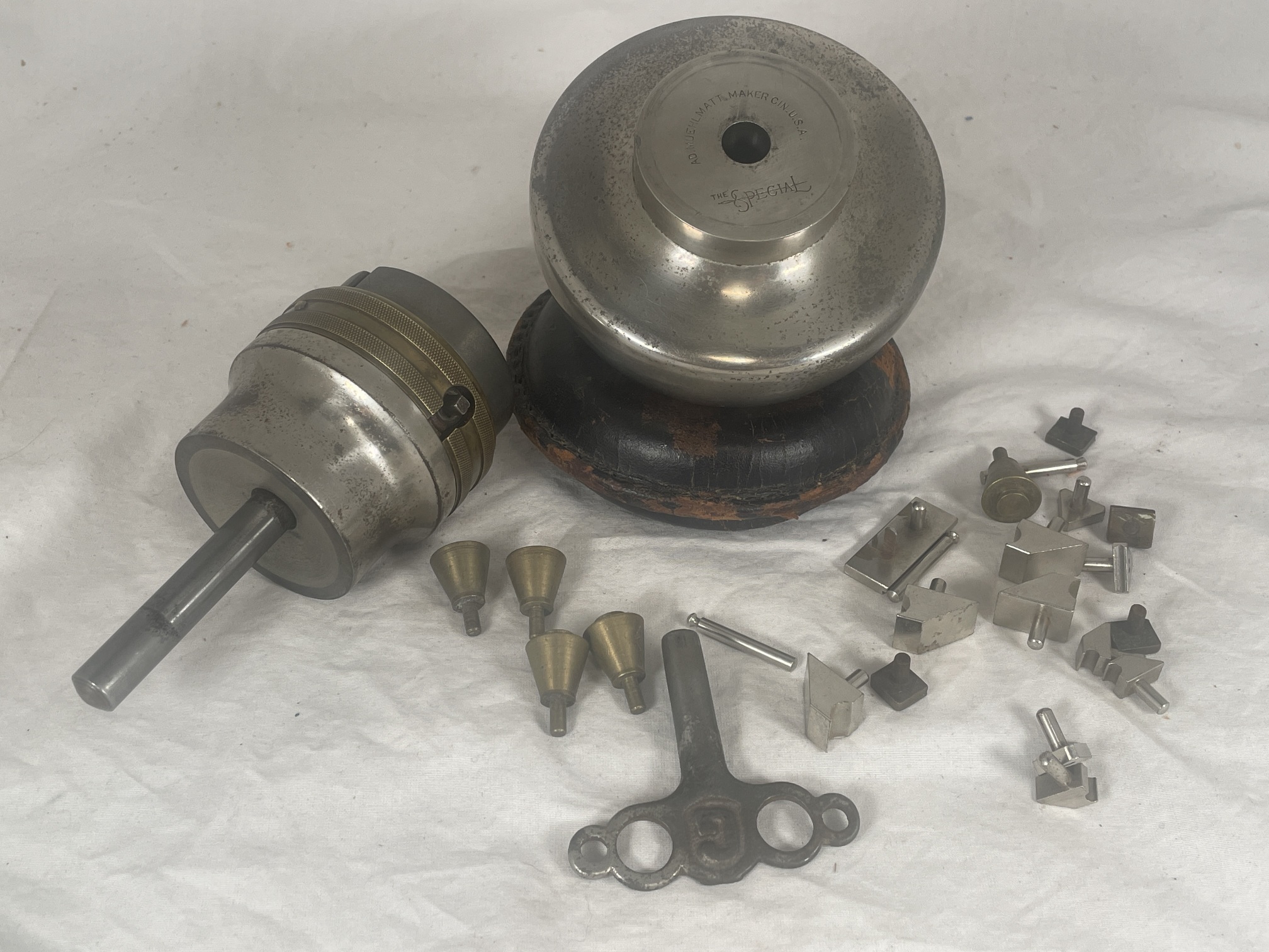 | Description | Nickel-plated 4-inch semi-spherical base, with 2-inch jaws on a 3-inch projection. The jaws are grey steel. There is a double-knurled brass band around the projection, just below the jaws, with cutouts for the adjustment screw. With the top removed, marking on the top of the base is visible: "AD. MUEHLMATT MAKER CIN.U.S.A. | THE SPECIAL", where "SPECIAL" has a sword through it from left to right. The vise sits on a sewn-leather donut base. A cast key is included, marked "G" on both sides, along with a selection of workholding pegs, some bare brass, and many (modern) chrome-plated. Adolph Muehlmatt emigrated from Switzerland in 1891, and began producing tools in Cincinnati the following year. His company was acquired by the Hamilton Tool Co. after his death in 1937. See "The ACME" engraver's ball vise, Adolph Muehlmatt, Cincinnati. |