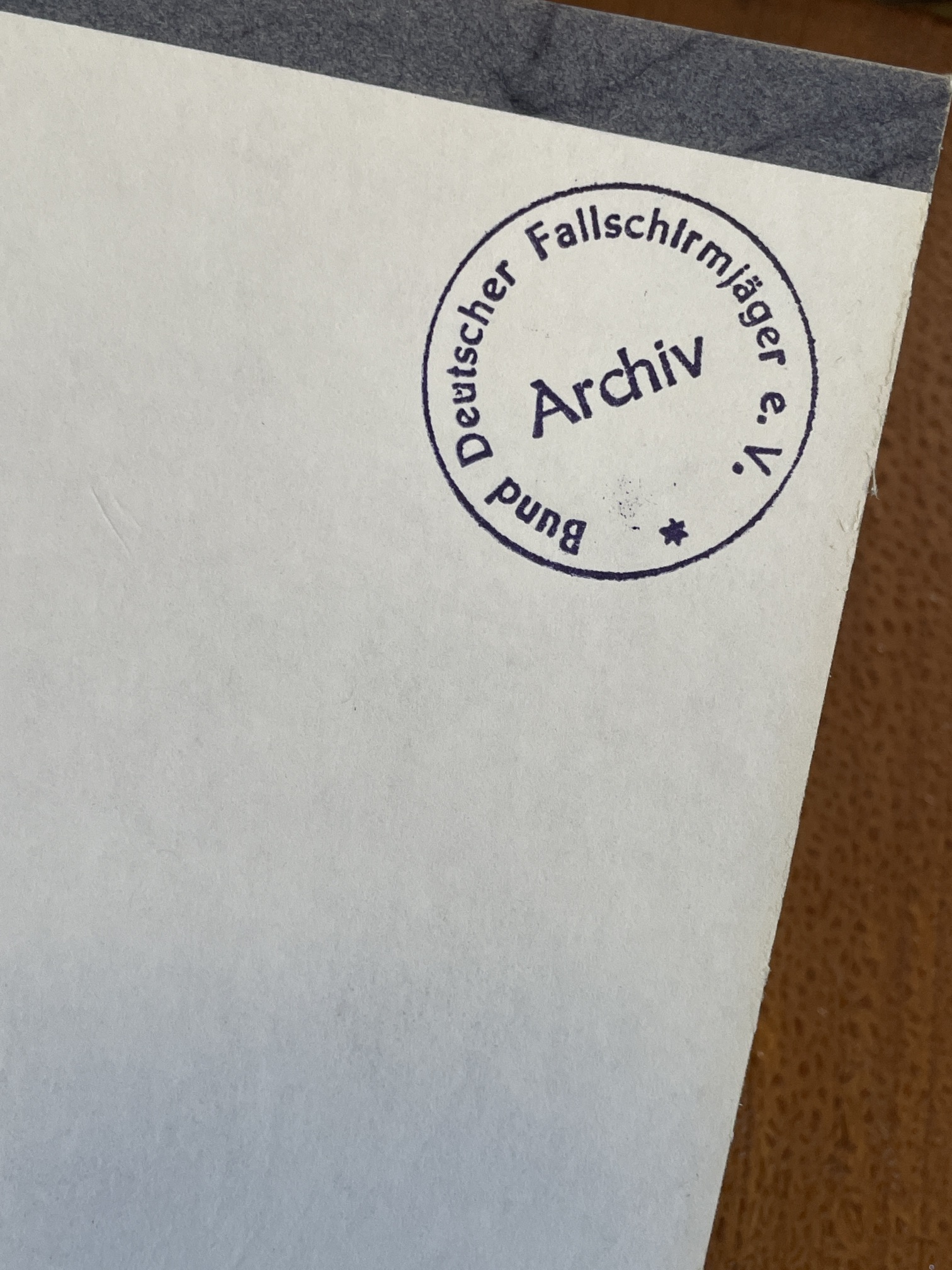 book, hardbound photocopy of 1st edition. Text/illustration facing pages are mismatched. Rubber stamp of "Bund Deutscher Fallschirmjäger e.V. Archiv" on inside cover. |