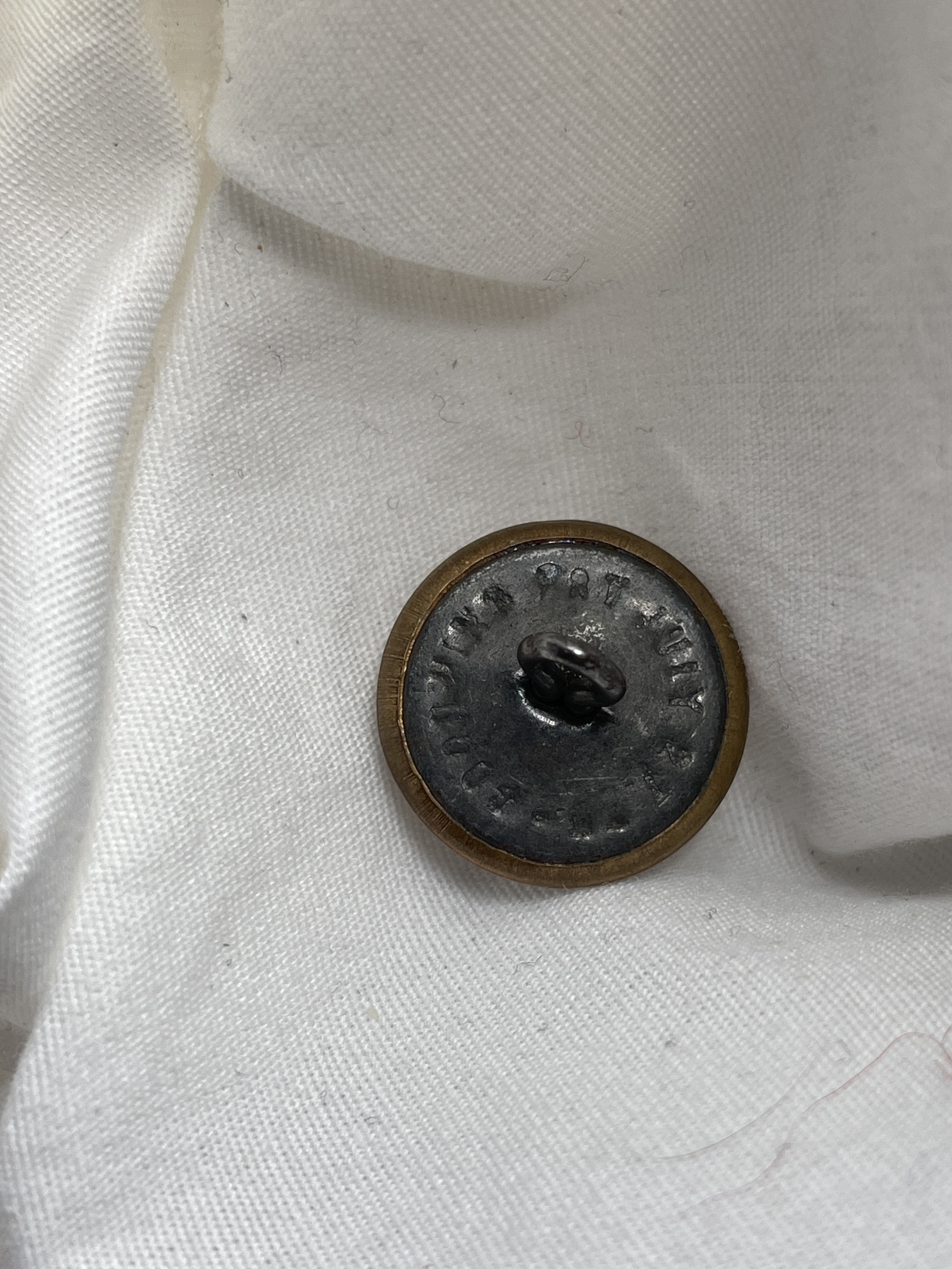 Khaki fatigue blouse with four patch pockets and a stand-up collar. Four large Indian War-era buttons on the front, along with Indian War-era staff officer's cuff buttons for the pockets. Two pair of crossed rifles on the collar. Coat buttons do not appear to be issue, with shiny black backs. Pocket buttons have backmarks ("GOODWINS PAT. JULY 27, 75"?). Most are held with cotter pins.