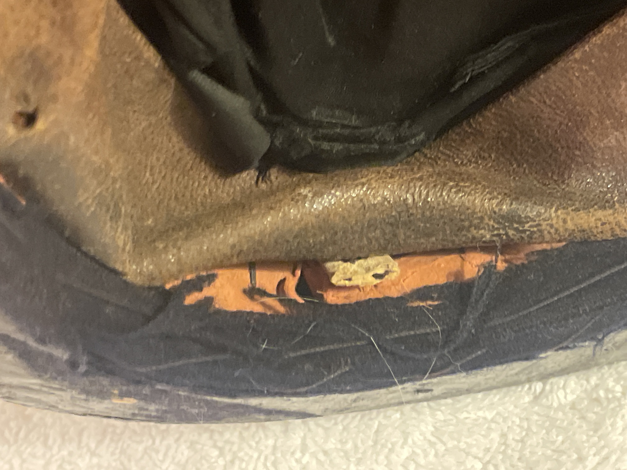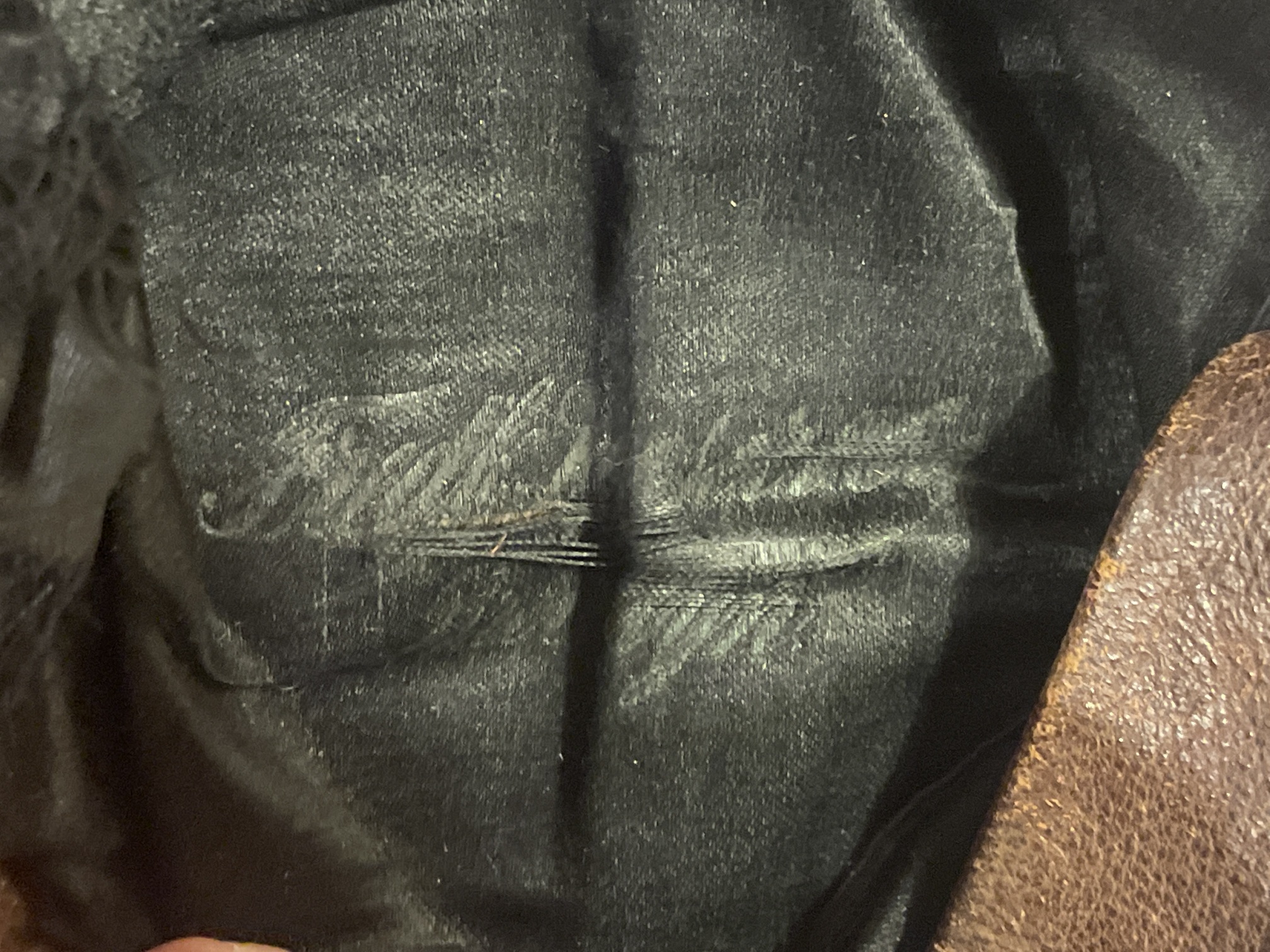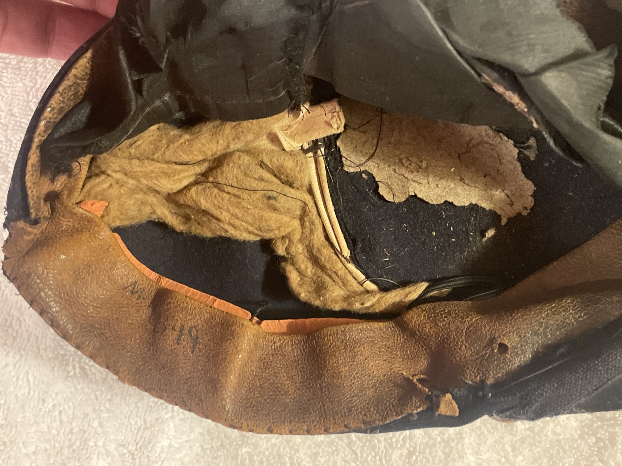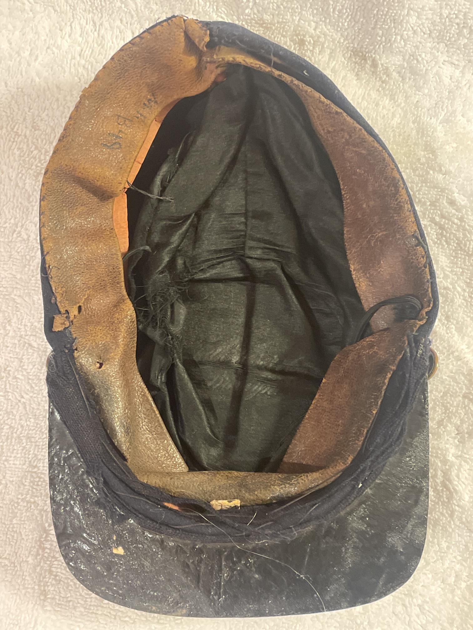 Band stiffened with cardboard. Brown leather full-length sweatband (with later annotation, "MR B49"). Felt and paper (over wire?) stiffeners underneath lining. Black silk lining is marked in the crown, but hard to make out. Appears to be “Fred…..& Co. | Brooklyn”. Remains of black elastic chinstrap.