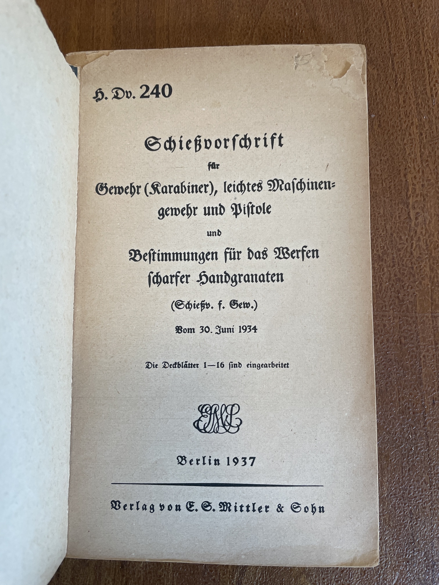 book, "Schießvorschrift für Gewehr (Karabiner), leichtes Maschinenengewehr, Pistole usw." H.Dv.240. Softcover torn and loose.