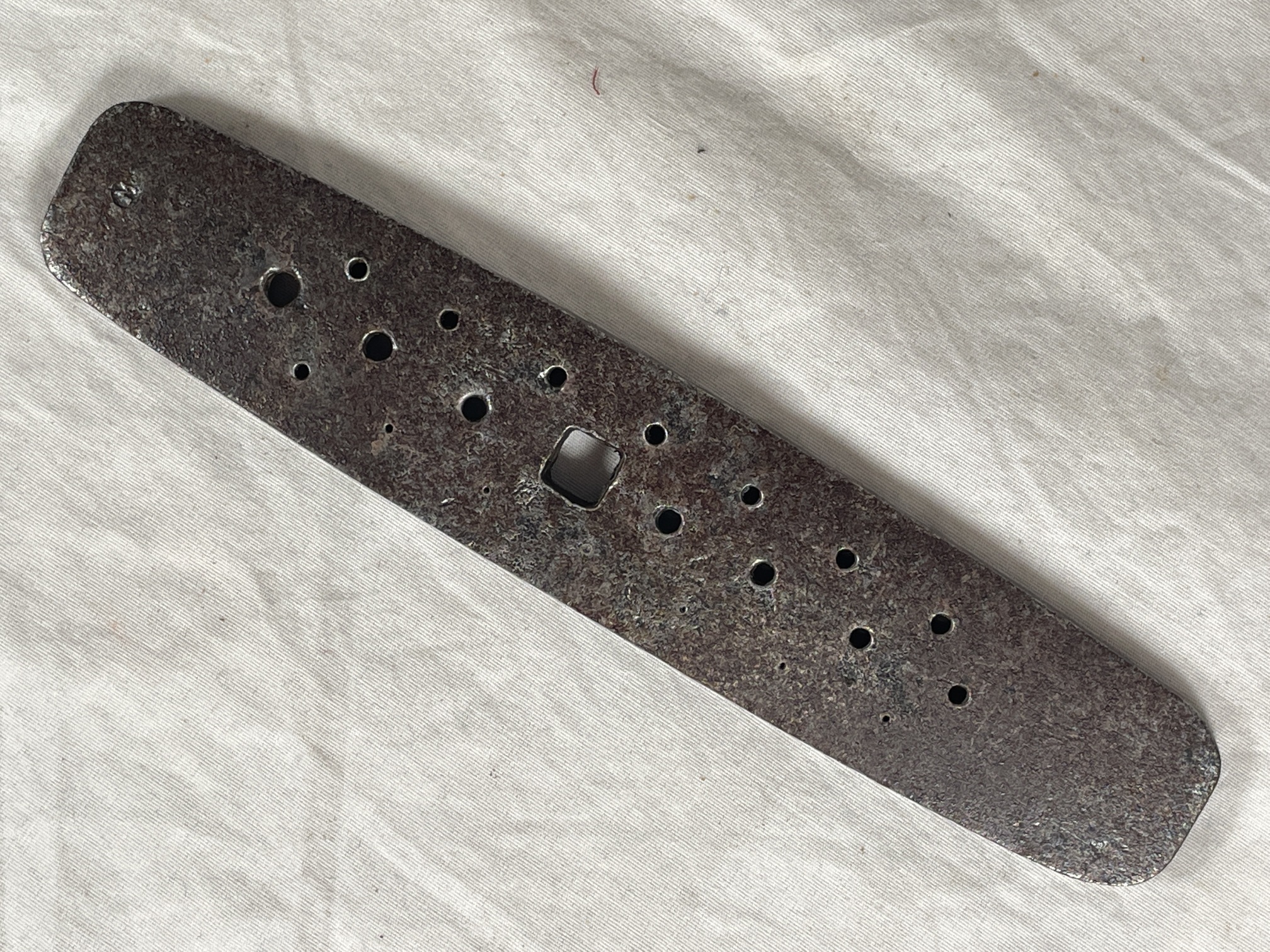An iron draw plate, for drawing wire. 21 round holes of different sizes, and one larger square hole in the middle.