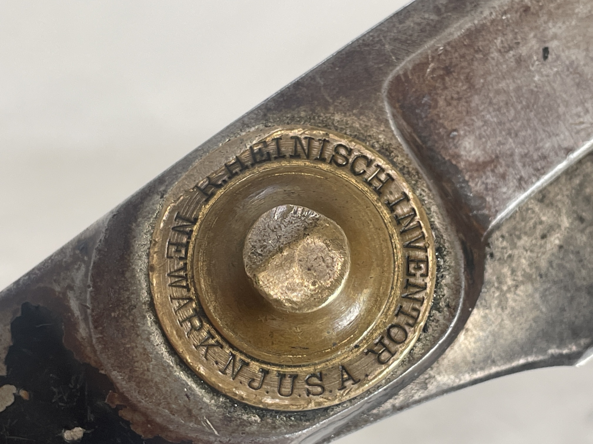 Large iron, brass, and steel tailor's shears. Nut marked "R.HEINISCH INVENTOR | NEWARK N.J. U.S.A.". 6 1/2" blade. |