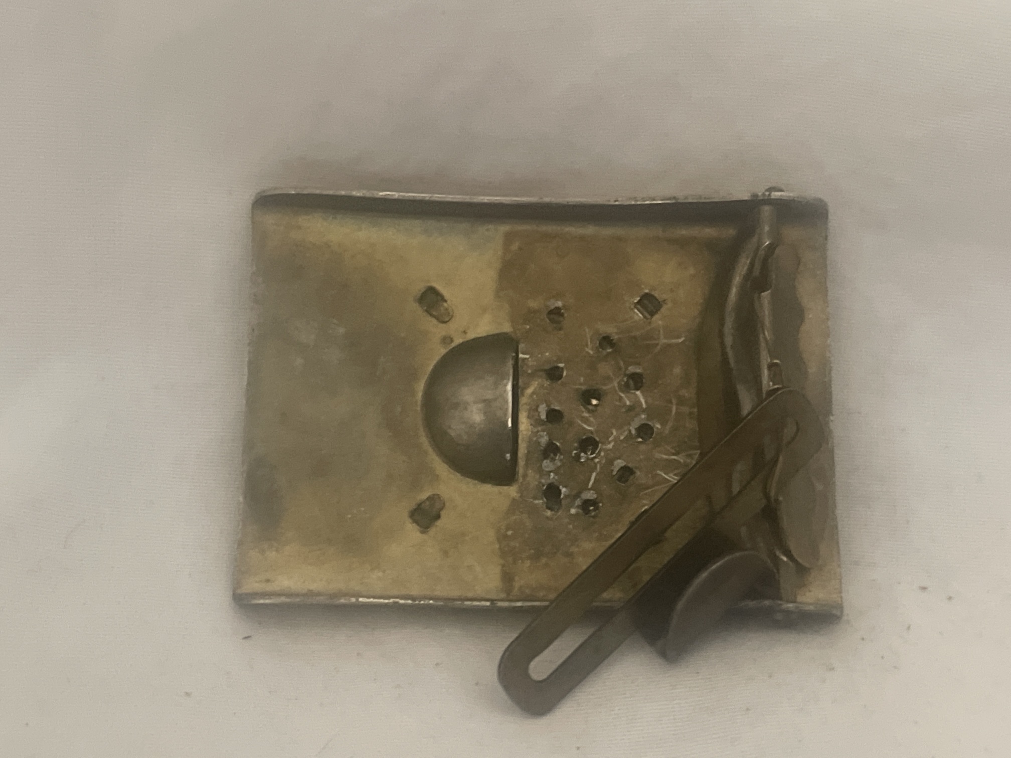 Small-size Imperial German Army (Prussian) "GOTT MIT UNS" belt buckle. Silvered center on brass buckle. Unmarked. Plated steel. Stamped clasp is wired to buckle. |
