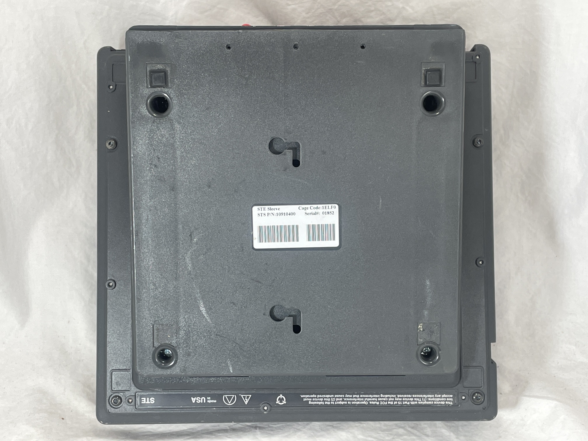 | Description | Black plastic telephone with no power supply or handset. Speed-dial card and cover, as well as a small piece of plastic below the hook are also missing. Label on back indicates date of manufacture is March, 2002. See: L-3 Communications Secure Terminal Equipment (STE - Office) I believe the "STE Sleeve", which is screwed to the bottom, is used to convert the "STE Office" to the "STE Tactical," adding two red and two black connectors for the TRI-TAC military network, and MILSTAR BDI (RS232) 25-pin connector. This sleeve covers (replaces?) the POTS RJ11 connector. The STE Sleeve has a label on the bottom, indicating Cage Code 1ELF0 (STS International, Inc.), and "STS P/N:10910400". An STE mounted in a small container is shown in STS's history on their website, but is not described. L3 STE |