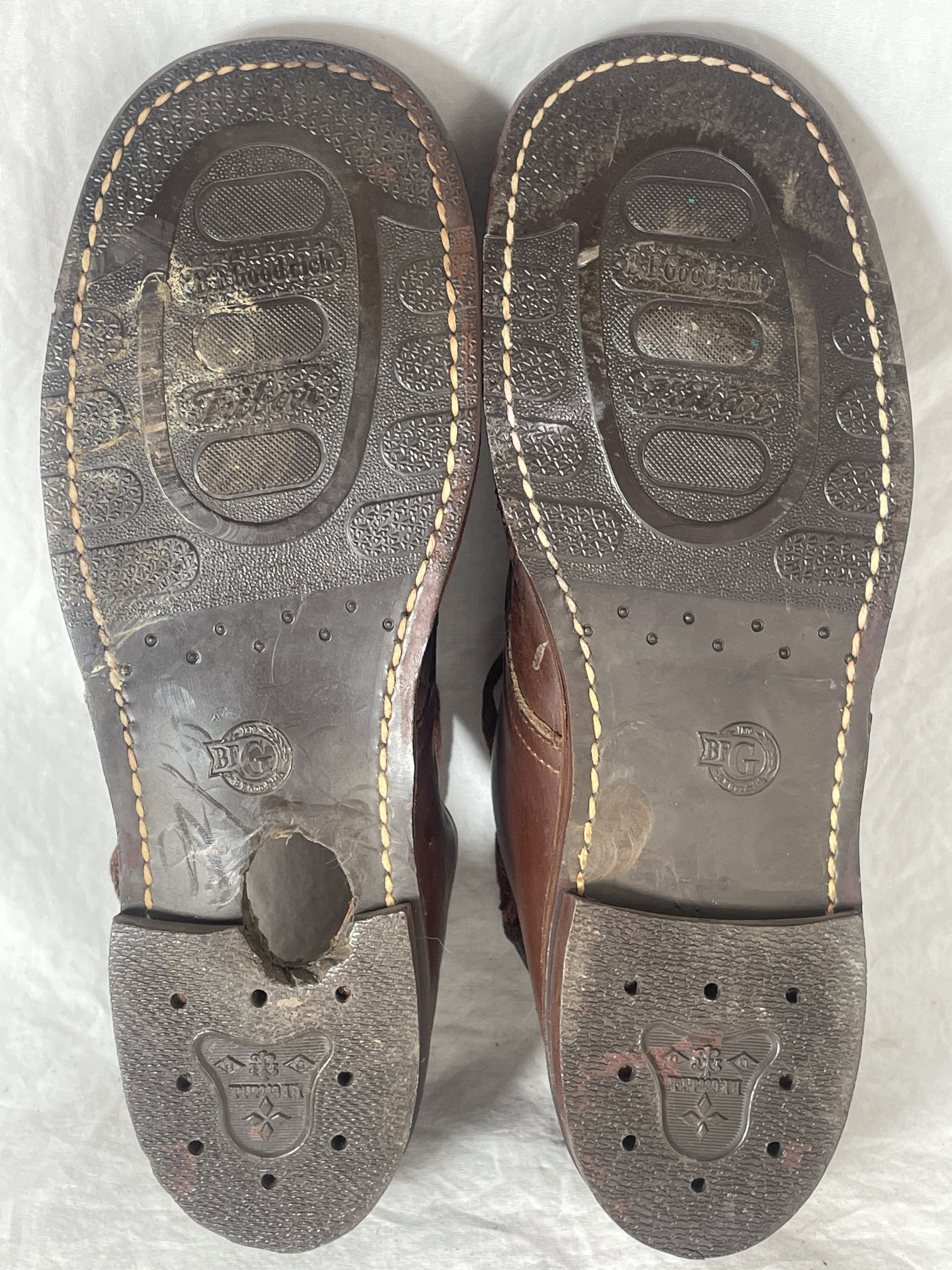 | Description | Boy's brown leather shoes, with B.F. Goodrich "Tribar" soles (dating them to the 1950s). Hole in the bottom of one shoe, from a previous mounting of the uniform on a mannequin. These do not appear to be the boots that appear in Photograph of Thomas Nichol, Jr., in Army uniform. Entire grouping: British-made "Ike" jacket of Thomas Nicol, Jr. Photograph of Thomas Nichol, Jr., in Army uniform Boy's Army cap of Thomas Nichol, Jr. Boy's Army uniform of Thomas Nichol, Jr. Boy's Sam Browne belt of Thomas Nichol, Jr. Boy's shoes, associated with Thomas Nichol, Jr. grouping Boy's leather gaiters of Thomas Nichol, Jr. |