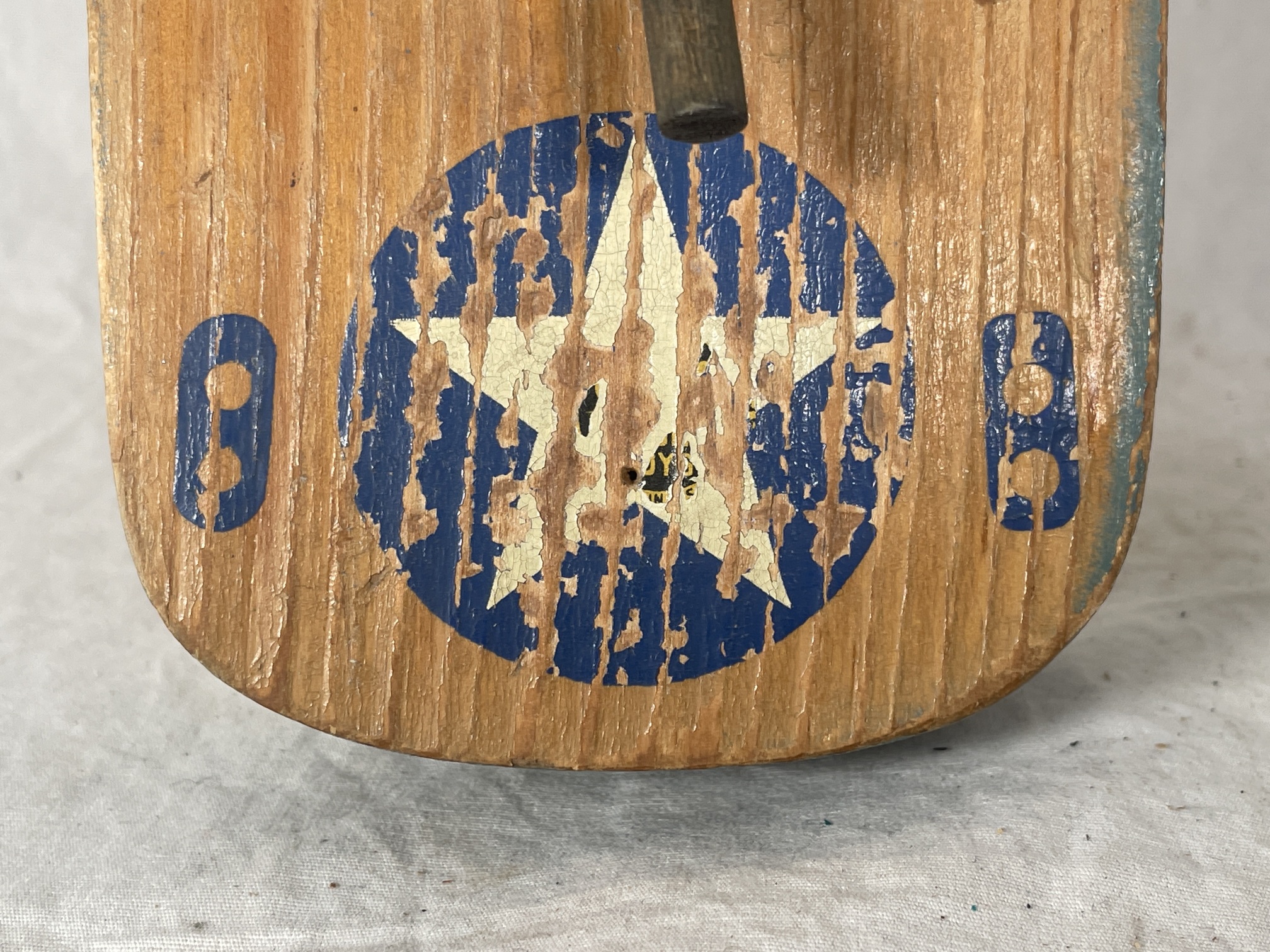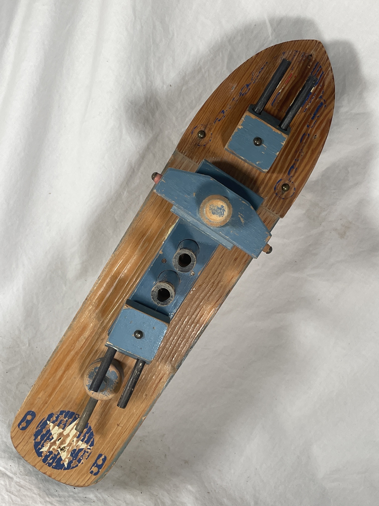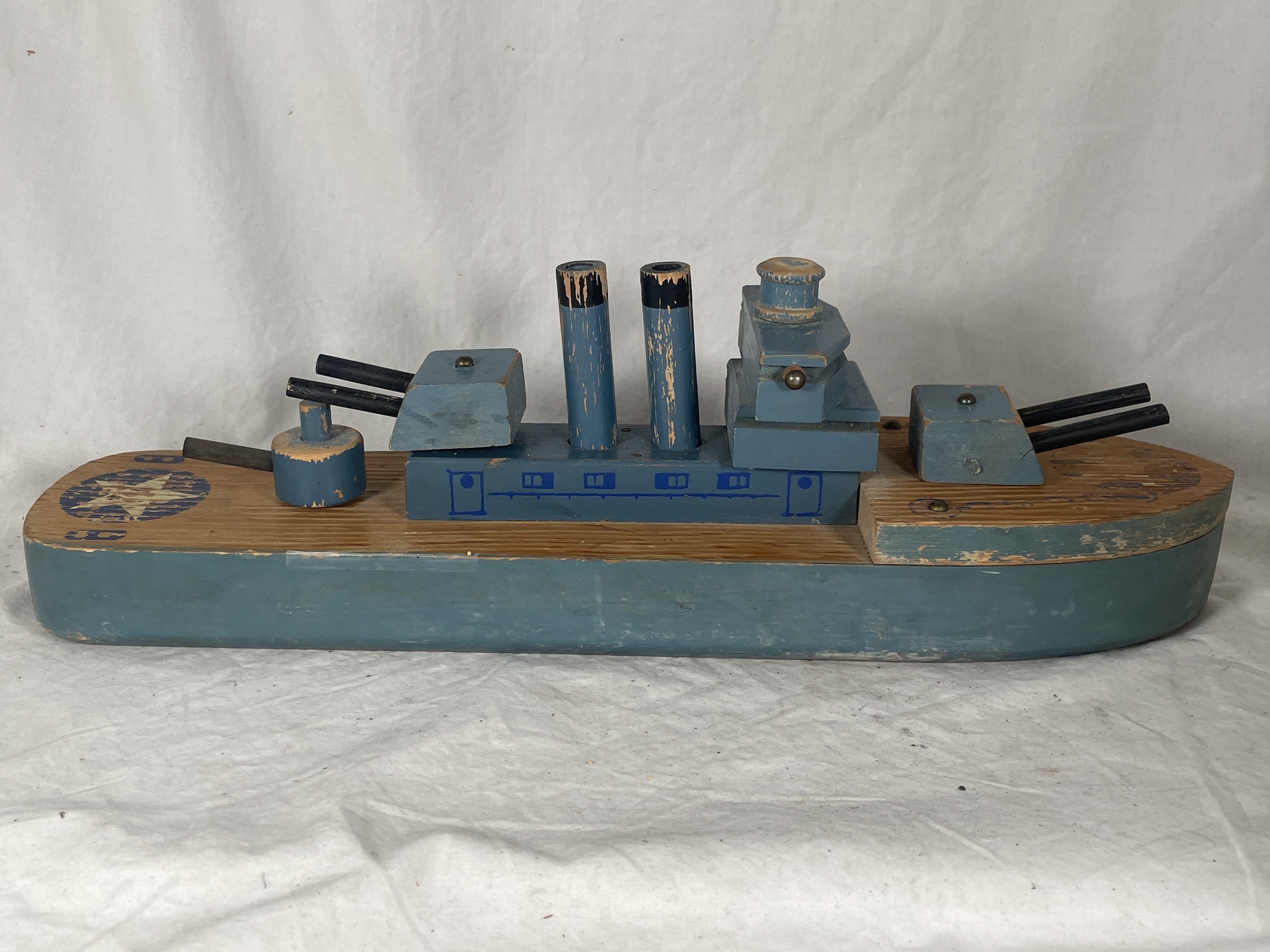 | Description | Blue-grey painted battle cruiser (ship), with minimal screen-printing (only on the sides of the main part of the superstructure, and on the decks. The decks are otherwise unpainted, and have a very-raised grain, leading to deterioration of much of the screen printing, especially on the fore-deck, which is an applied piece of solid wood. The Holgate "Battle Cruiser" has not been found in any catalogs, but is listed in "Holgate Toy Selector" and pictured in "Holgate Toys of Today". Most surprising, is the remains of a Type 4c decal (dt4c), which has, until now, been believed to have been introduced in 1943. Peg attaching the aft two-gun turret appears to be a replacement, and is too long. When purchased, had a small, unpainted turret, with a black gun, attached to the bow with a nail. |
