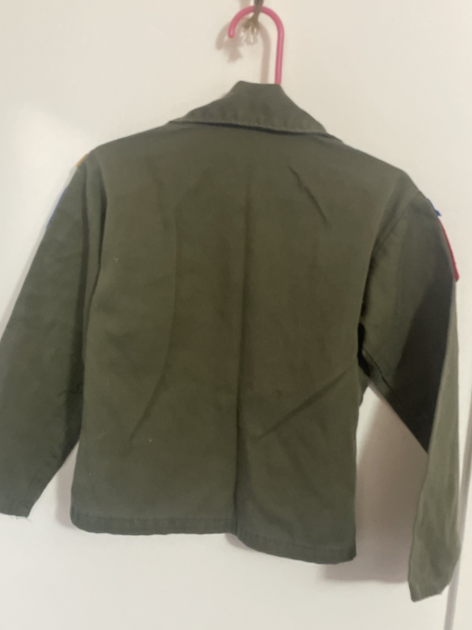 | Description | A boy's green fatigue uniform, consisting of green trousers and a two-pocket shirt. The trousers have a zipper fly, and an internal tag indicating 50/50 polyester/cotton, size 6. The three-button shirt is of thinner material, with an illegible tag at the collar. On the collar are full-color insignia, embroidered on green cloth, for Captain, and General Staff (national eagle over a white star). Similarly embroidered 2 3/8" pilot's wings over a black-on-white "U.S.ARMY" tape. Matching "JOSHUA" nametape above the right pocket. Full-color, merrowed-edge 82nd Airborne Division SSI on right shoulder, and full-color Ranger tab over blue and white merrowed-edge "FOLLOW ME" Infantry School SSI on the left shoulder. See Child's US Army green fatigue shirt, 82nd and Infantry School, Justin for matching shirt for "JUSTIN". |