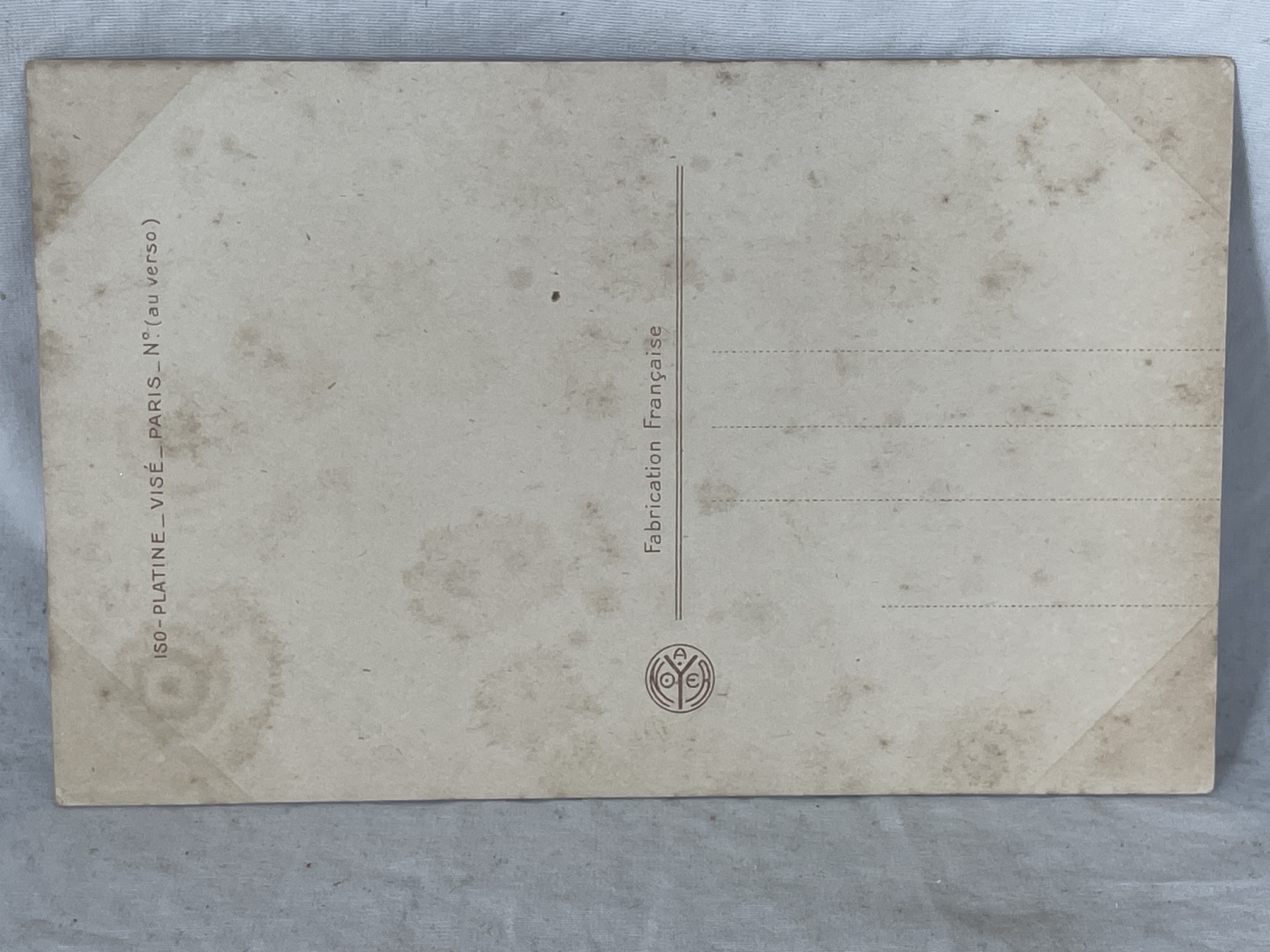 A colorized (partially illustrated?) photo postcard of a boy in French army cap with bayonet, peeing in a Pickelhaube on the ground. At the top, "GRAINE DE POILU". At the bottom, "PATRIOTIC | 1068". Divided-back reverse, printed in red. "ISO-PLATINE_VISÉ_PARIS_No(au verso)", "Fabrication Française". Unused. |