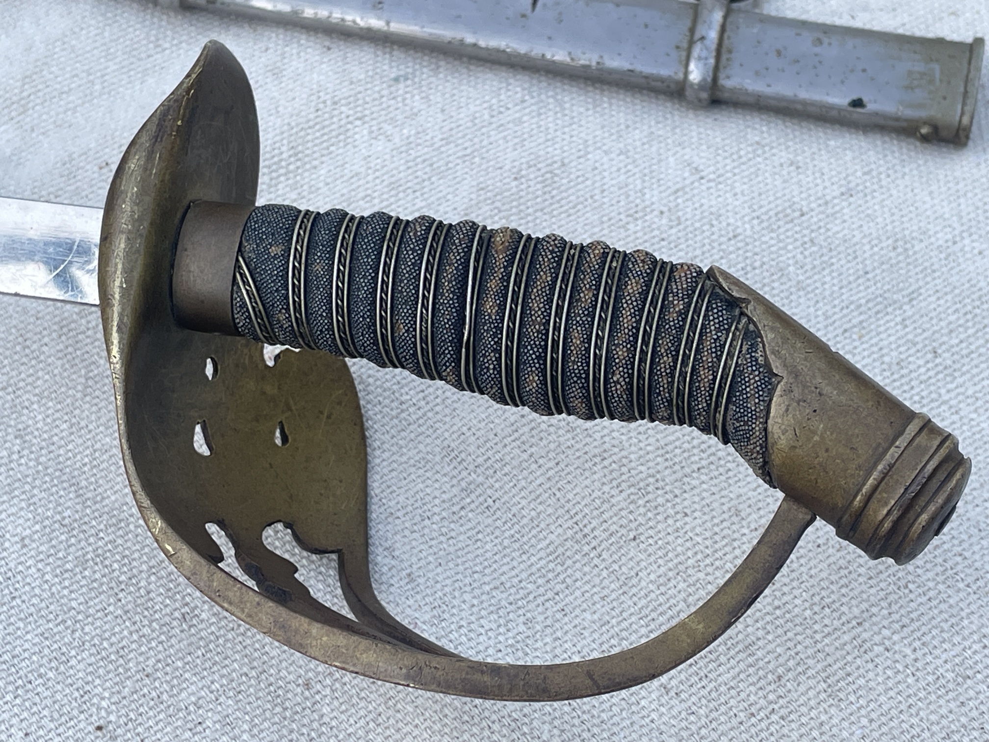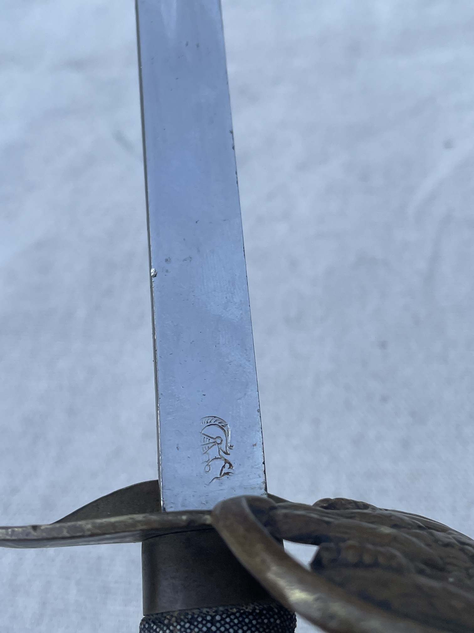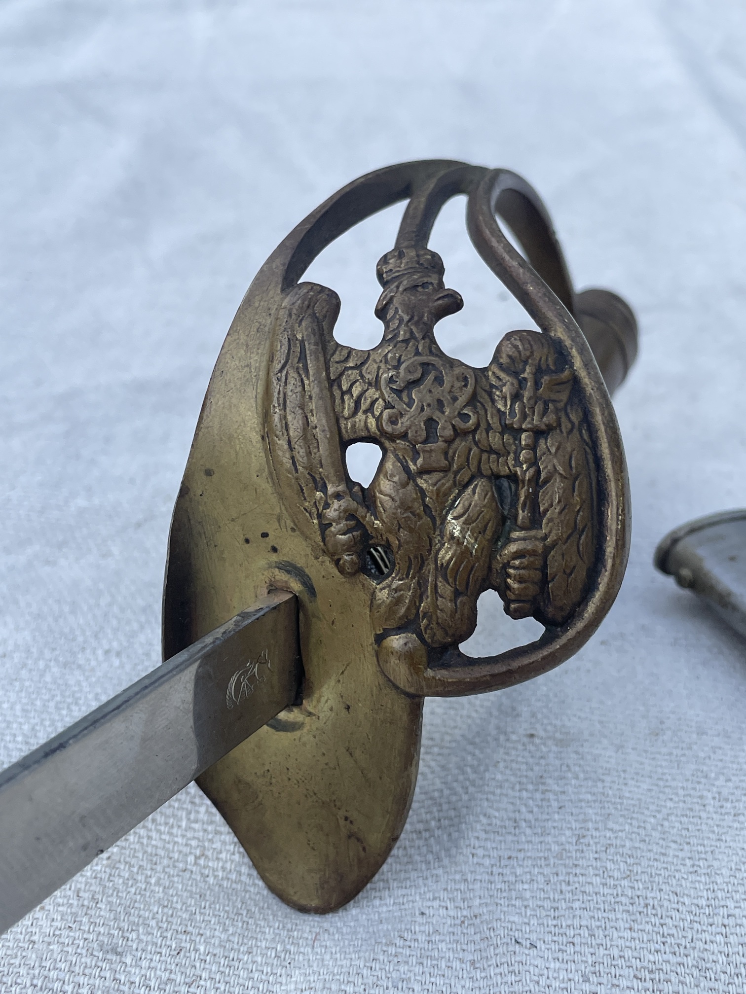 | Description | Bright, straight blade, with one fuller on each side, and a knight's head logo of WKC (Weyersberg Kirschbaum & Cie). Cast hilt with Prussian eagle and cipher of Wilhelm II (WR II). Bluish rayskin grip, with brass wire wrap. Bright scabbard with two rings. See Imperial Prussian Infantry Officer's sword, M1889. |