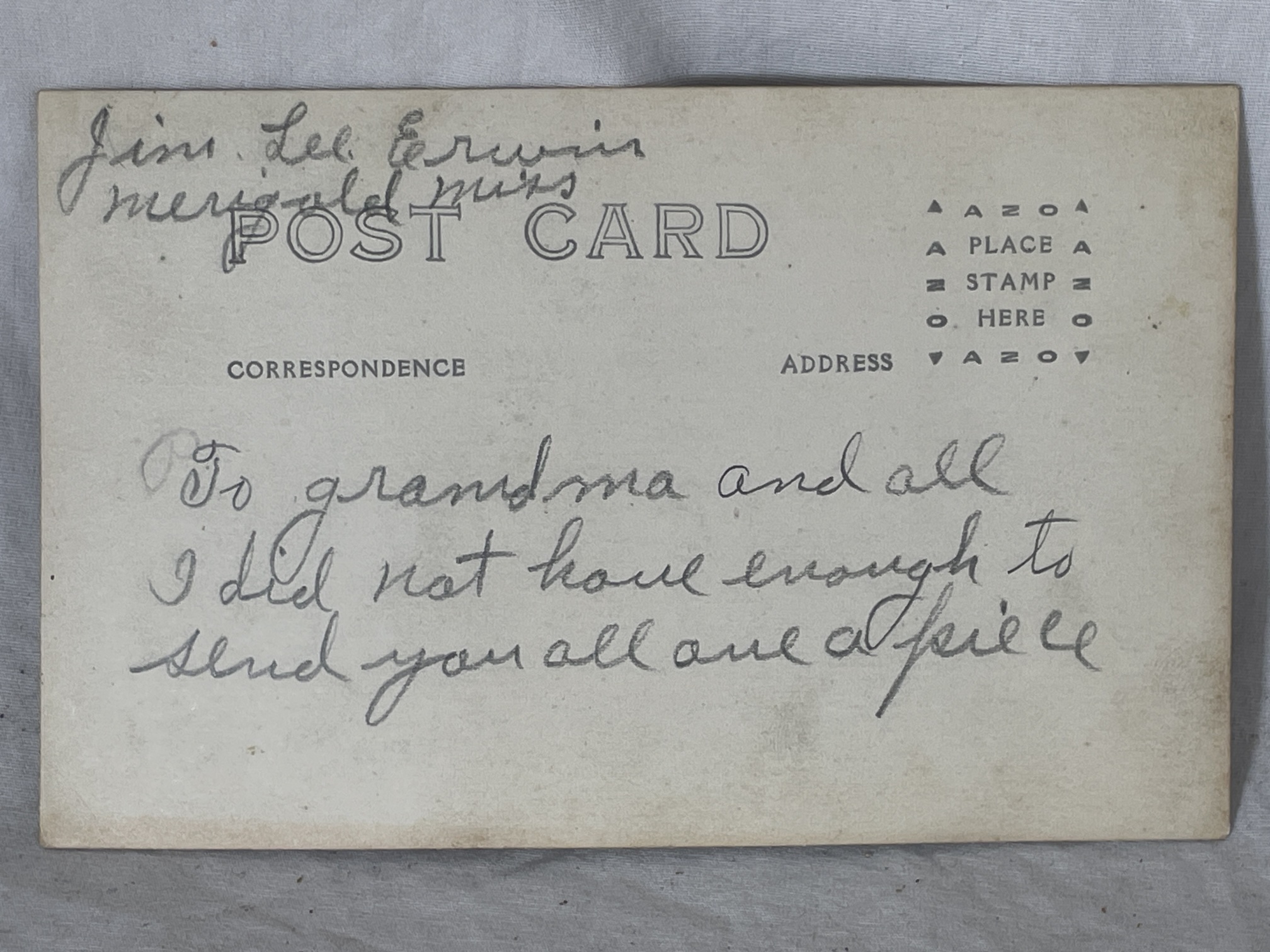 Unsent postcard, written in pencil, from "Jim Lee Erwiin | Merigold, Miss.". |