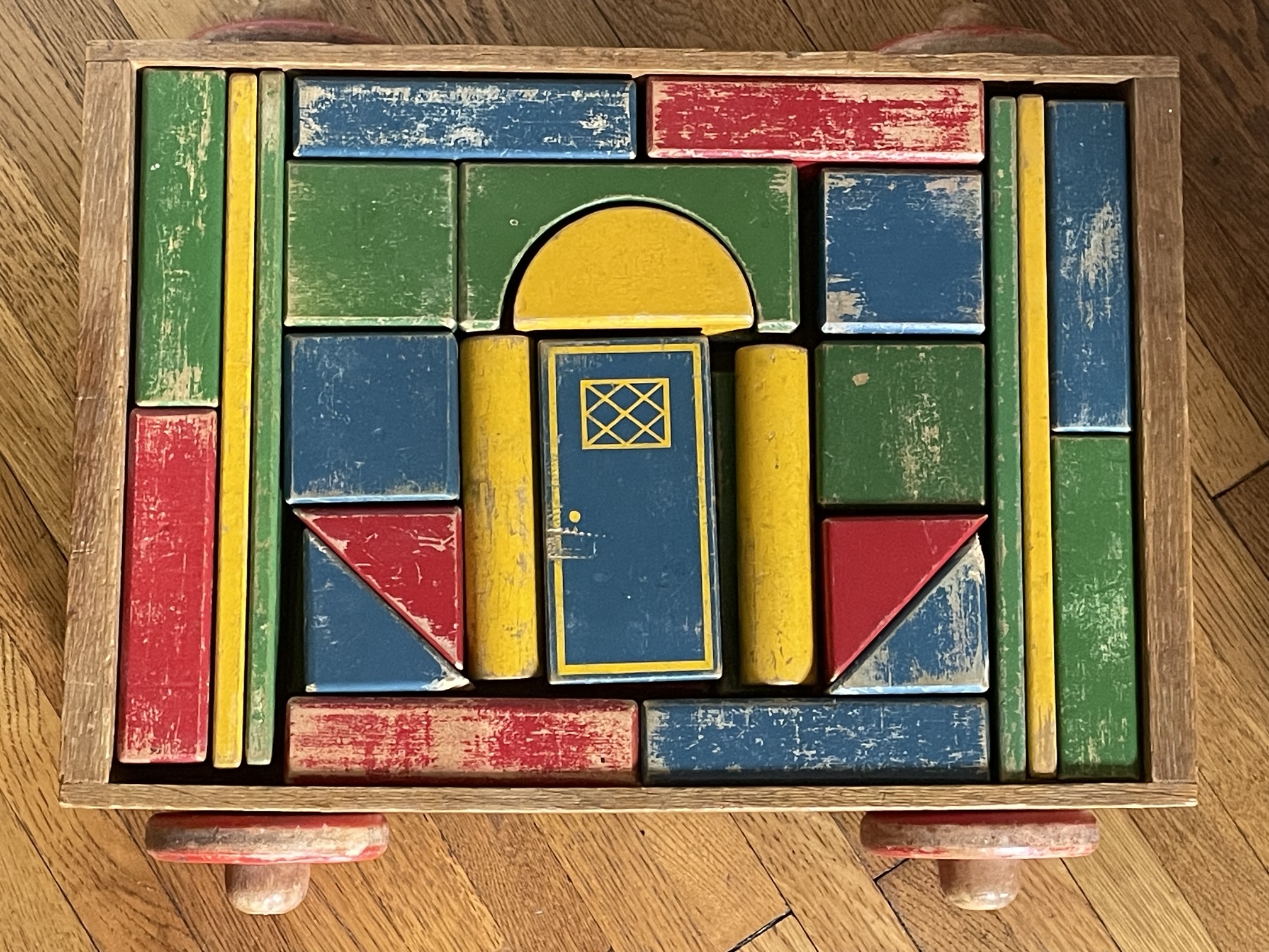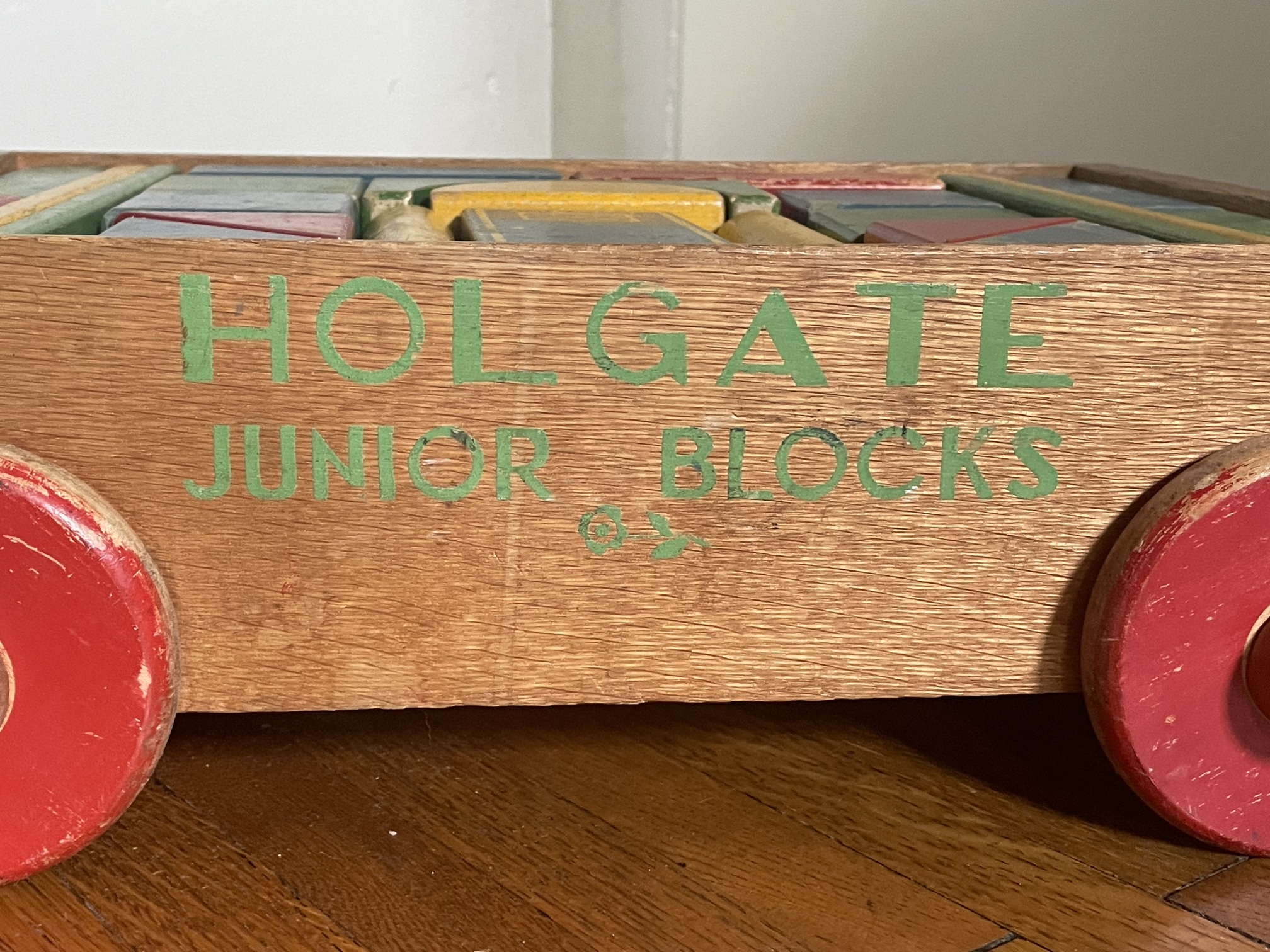 This is an interesting 36-block Juniors wagon. It is made out of a wood with rougher-than-usual grain (oak?), with a two-piece solid-wood bottom. The pull string is missing. "HOLGATE | JUNIOR BLOCKS" (with a flower) is printed in green on the sides.