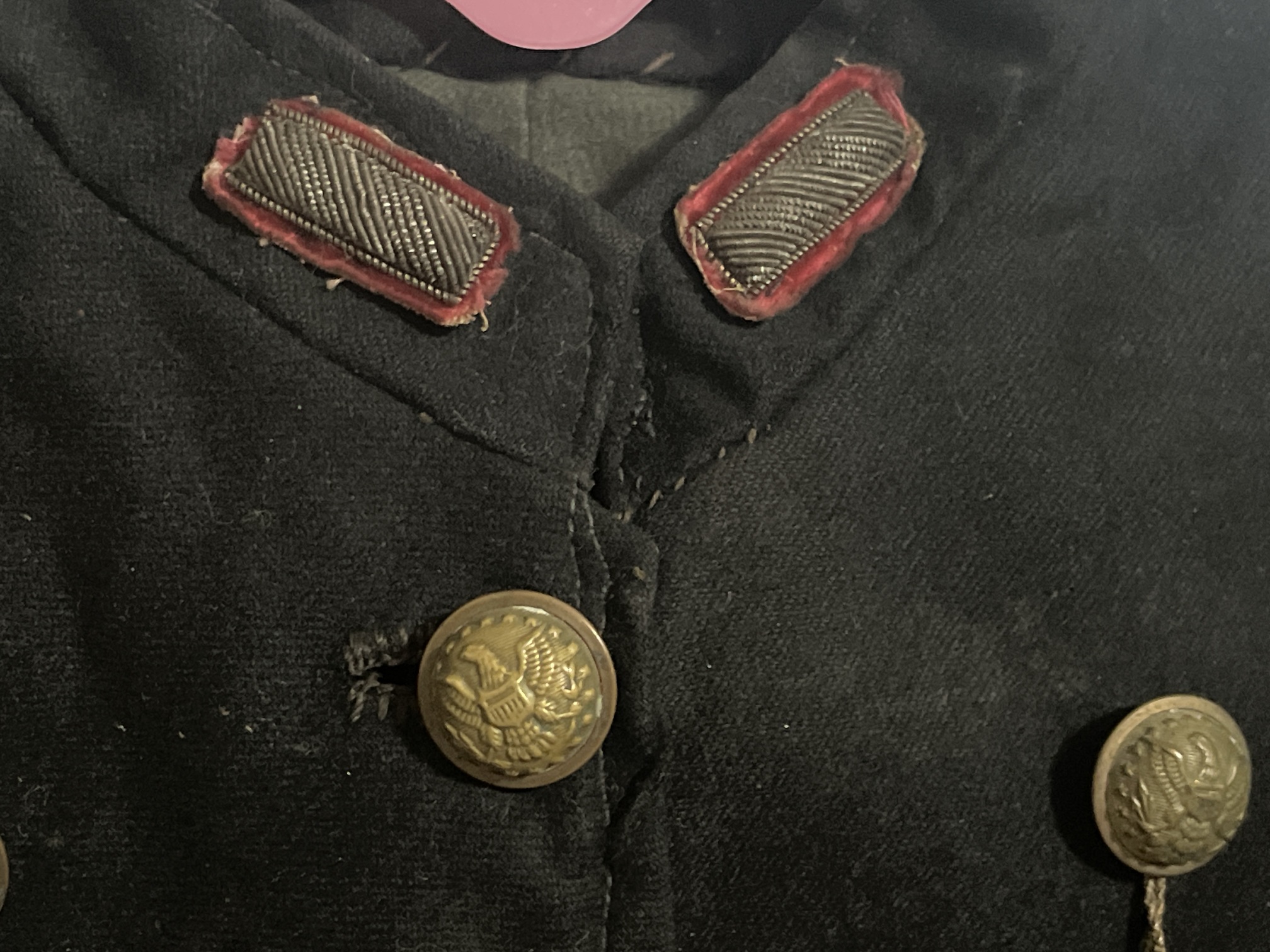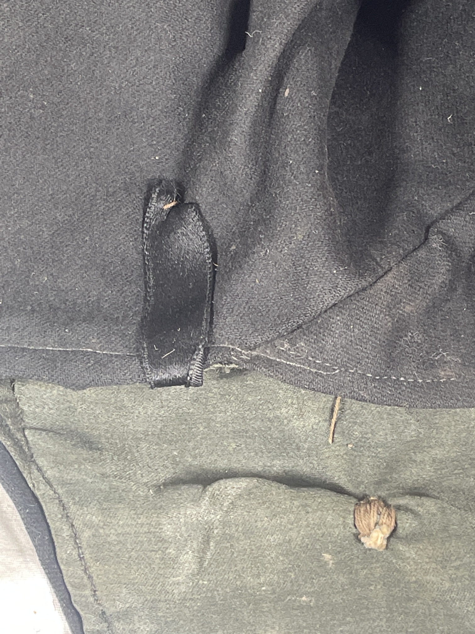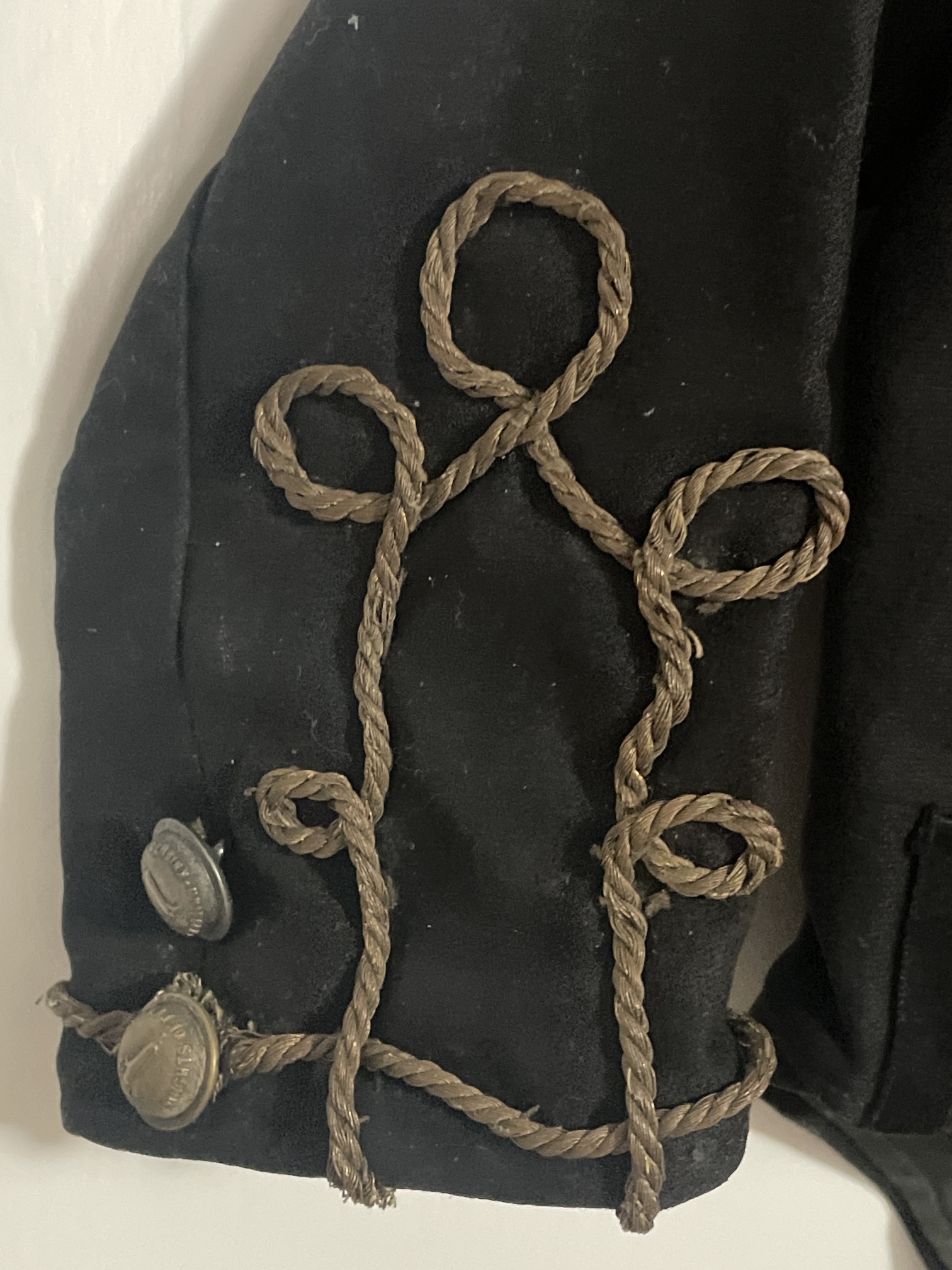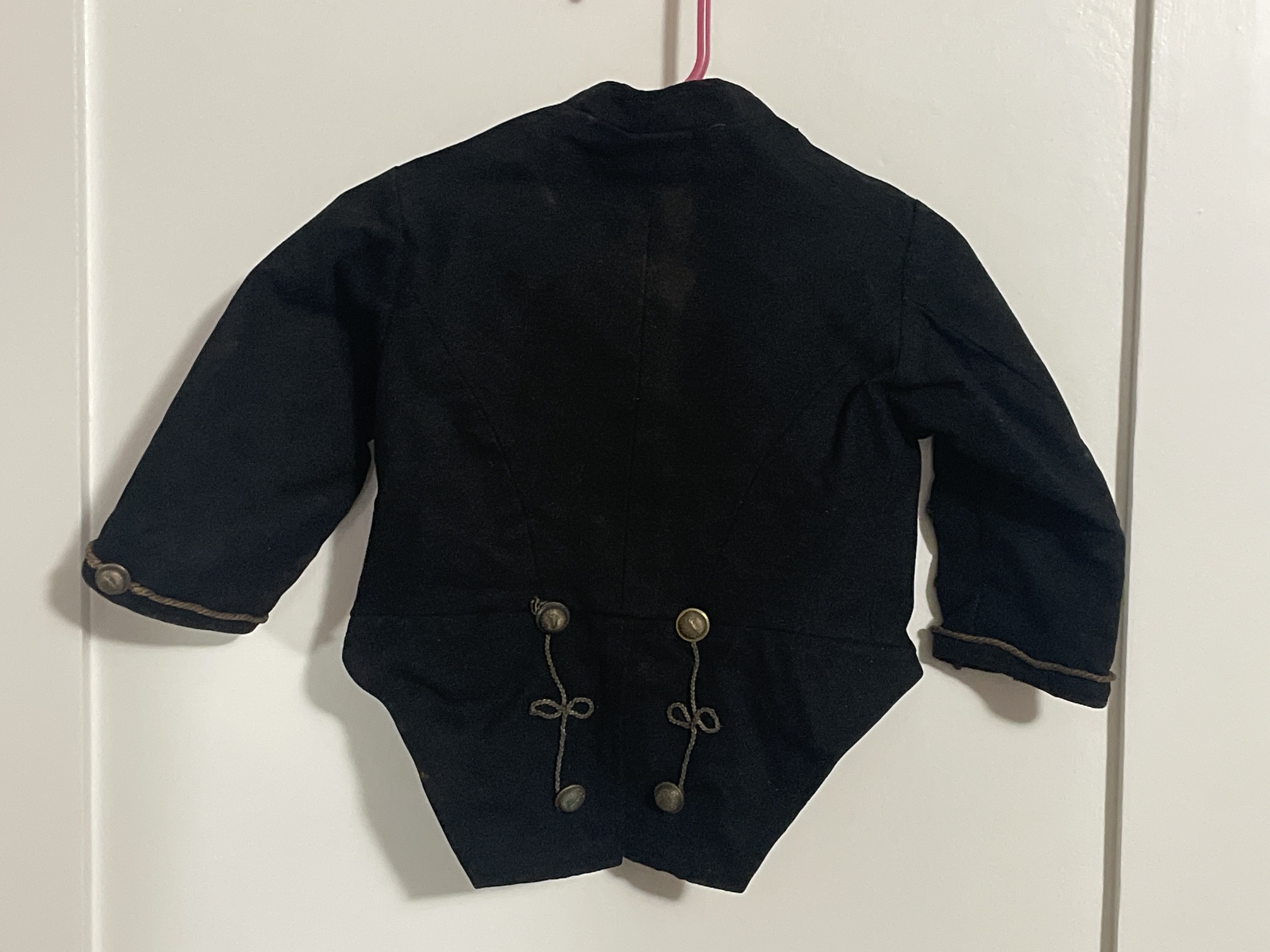 | Description | A child's triple-breasted jacket of thin black wool, lined in dark polished cotton. Twelve domed brass buttons on the front, with a spot for the thirteenth at the bottom. All but the lower two corners are small General Staff buttons. The other two are lily buttons of the Uniformed Ranks, Knights of Pythias (URKP). Sleeves have two URKP buttons (one missing on left sleeve) and crude lace of heavy gold cord. The tunic has short tails, with lace of thinner gold cord, with two URKP buttons on each side. There is a short standup collar, with what appear to be gold bullion Second Lieutenant bars, mounted on red backing, sewn horizontally. There are two black silk/satin belt loops at the bottom edge. There is a gold bullion tassle attached to each of the top corner buttons on the front. It is lined throughout with black (dark green?) polished cotton. There are no markings. For a very young child, probably 2-3 years old. Associated items: Child's black velvet chapeau bras Child's leather boots |