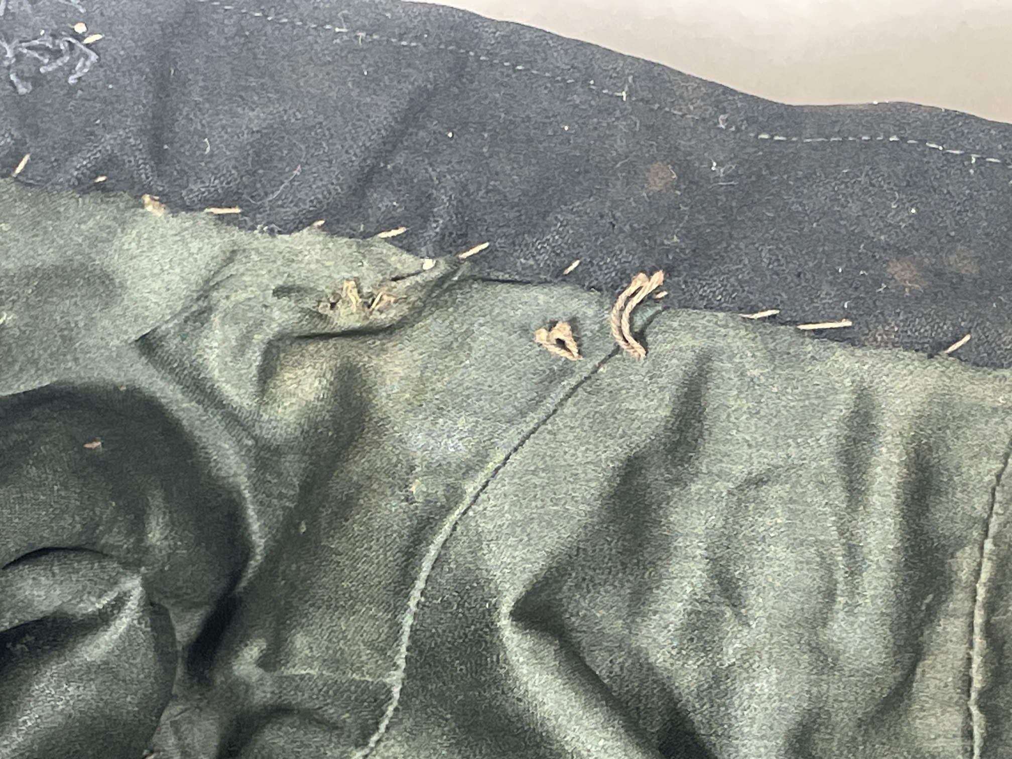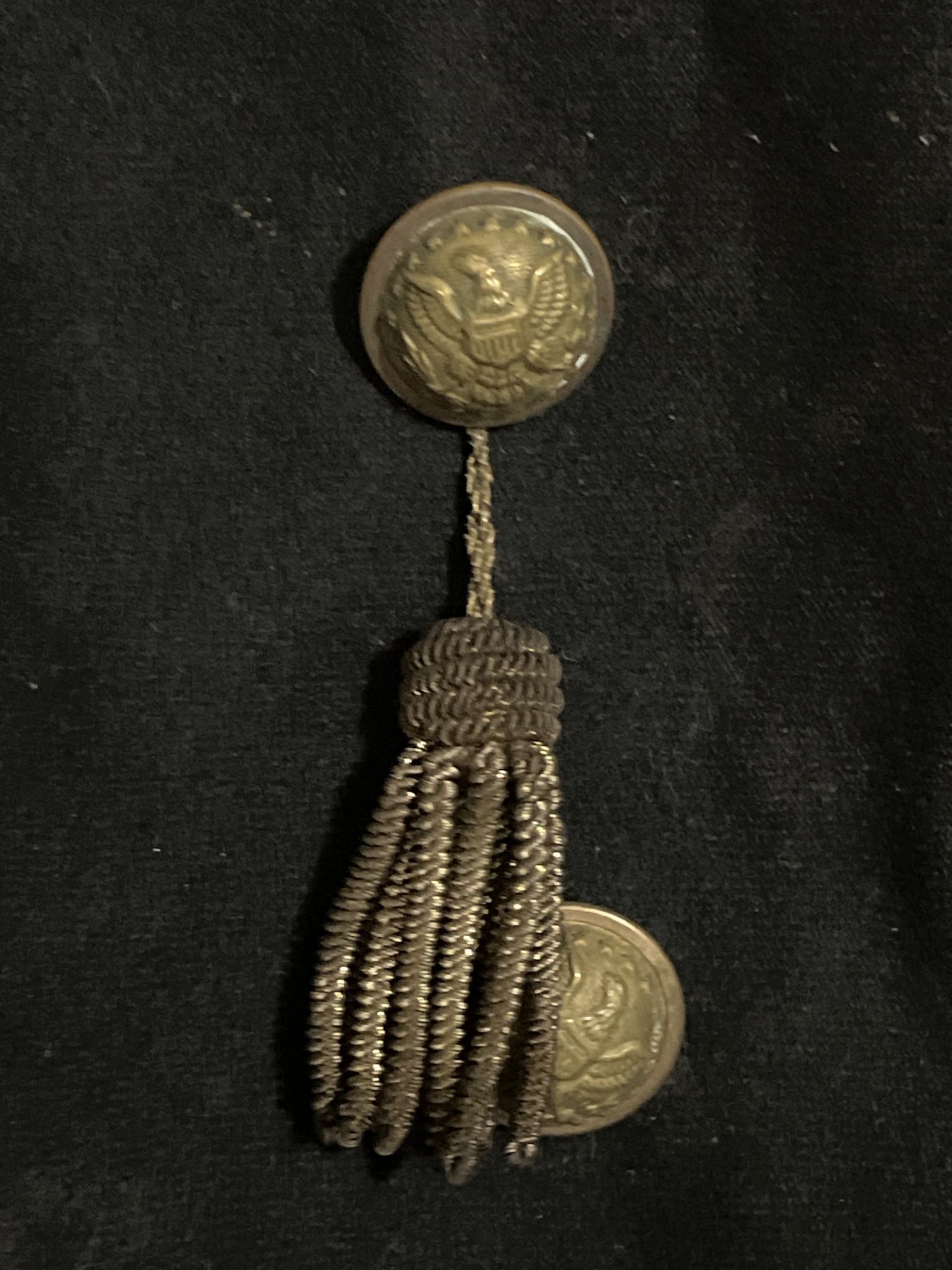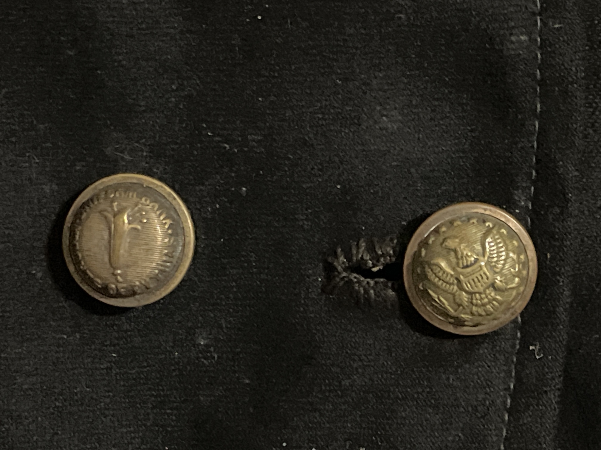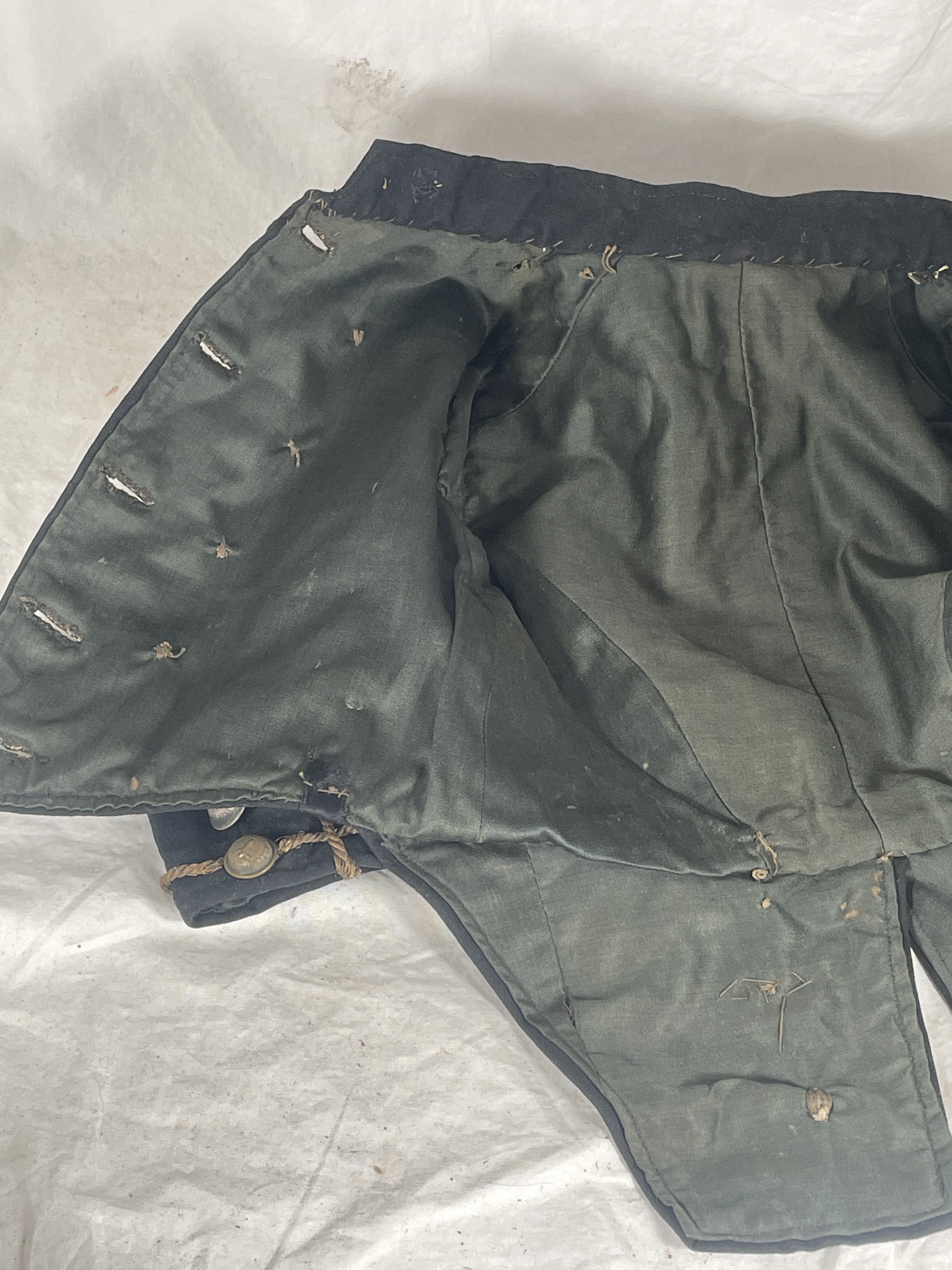 | Description | A child's triple-breasted jacket of thin black wool, lined in dark polished cotton. Twelve domed brass buttons on the front, with a spot for the thirteenth at the bottom. All but the lower two corners are small General Staff buttons. The other two are lily buttons of the Uniformed Ranks, Knights of Pythias (URKP). Sleeves have two URKP buttons (one missing on left sleeve) and crude lace of heavy gold cord. The tunic has short tails, with lace of thinner gold cord, with two URKP buttons on each side. There is a short standup collar, with what appear to be gold bullion Second Lieutenant bars, mounted on red backing, sewn horizontally. There are two black silk/satin belt loops at the bottom edge. There is a gold bullion tassle attached to each of the top corner buttons on the front. It is lined throughout with black (dark green?) polished cotton. There are no markings. For a very young child, probably 2-3 years old. Associated items: Child's black velvet chapeau bras Child's leather boots |