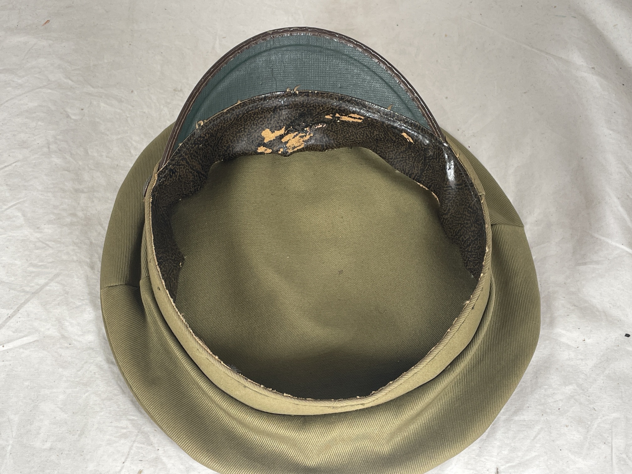 | Description | A light green cotton peaked cap, with brown faux-leather brim, sweatband, and chin strap. Nearly full-size brass officer's device to front. Darkened brass anchor buttons hold the chinstrap. Appears unmarked, but sweatband is too fragile to inspect. Associated items: Child's WWI cotton US Army tunic, 1st Ohio Infantry |