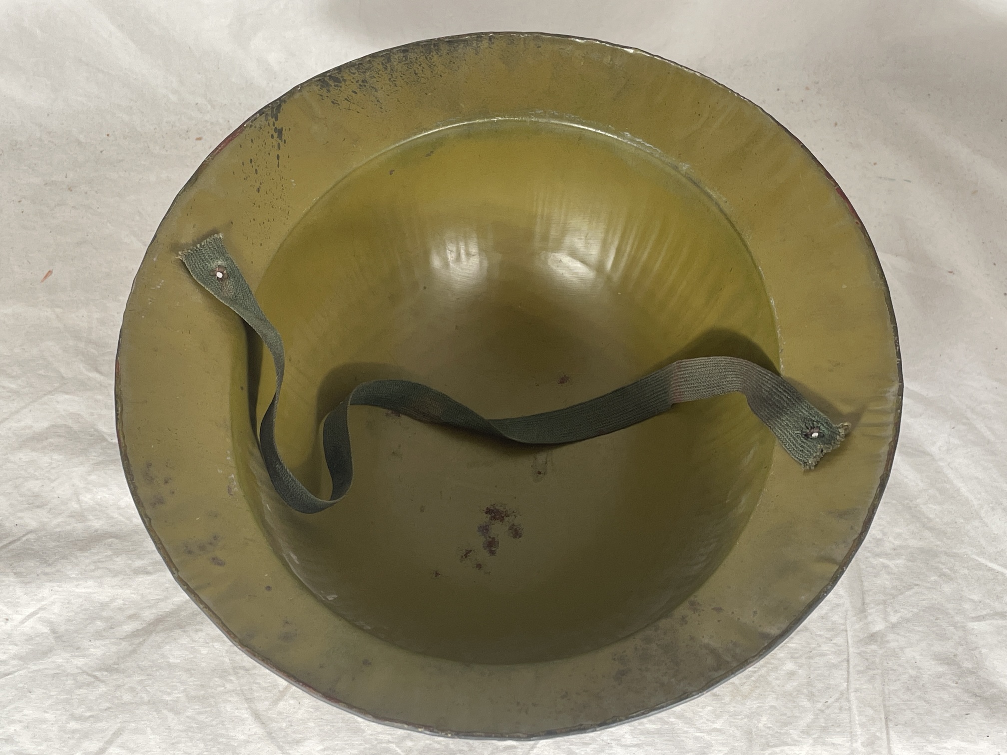 Steel helmet with intact elastic chinstrap, riveted to body. Hole at front for a device (missing). Outside is dark green, inside is light green.