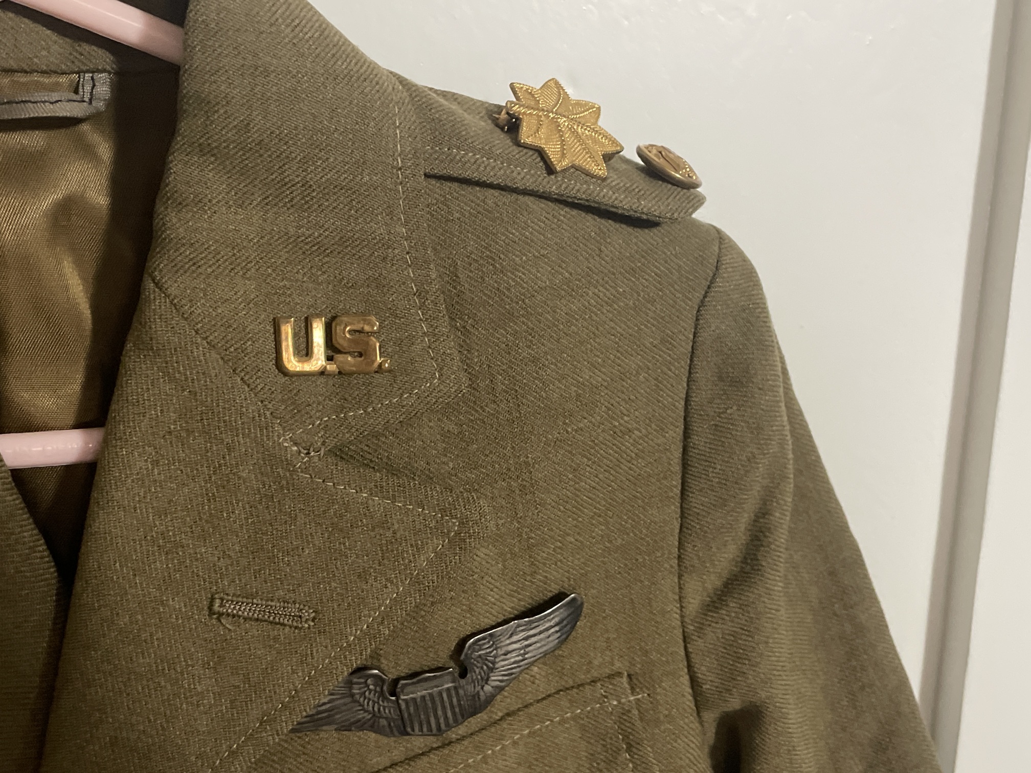 A light green wool coat, with reversed epaulets (buttons at the shoulder). Four pockets (top two are false), three-button front. No buttons on sleeves. Buttons are four-piece construction (applied eagle over lined background), full-adult-size at the front, cuff-size at the pockets and epaulets. Un-marked, pin-back major's insignia on epaulets. Early clutch-back "U.S." on both collars. Unusually-crude and thin silver pin-back pilot's wings, marked only "STERLING". Black lace halfway around each cuff.