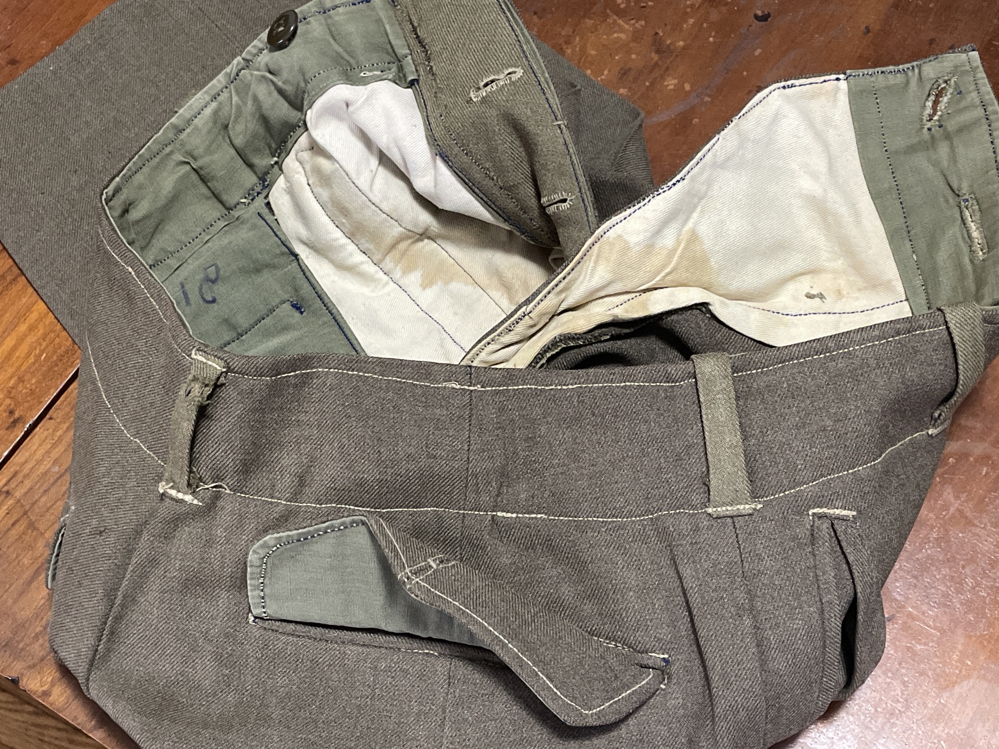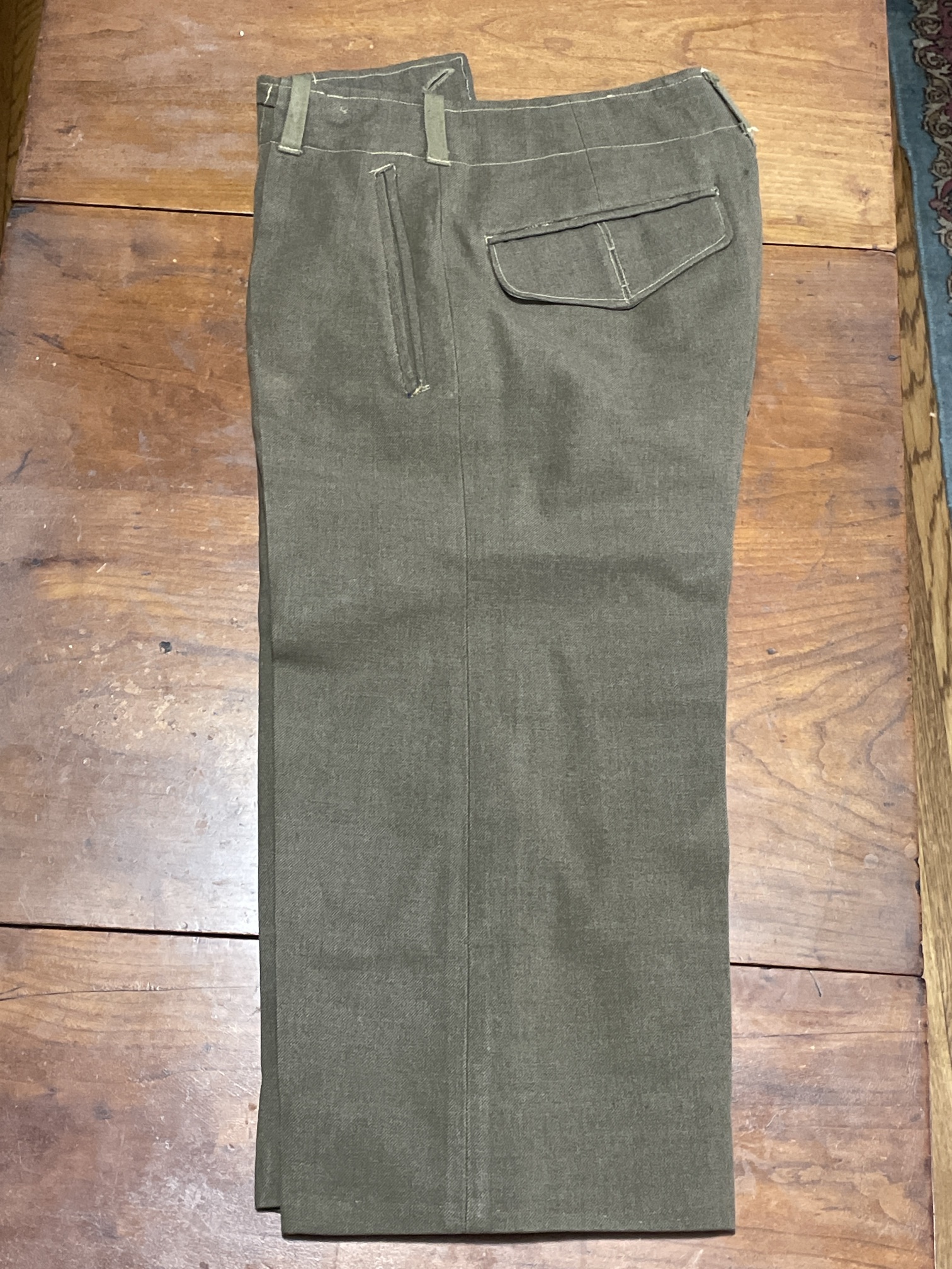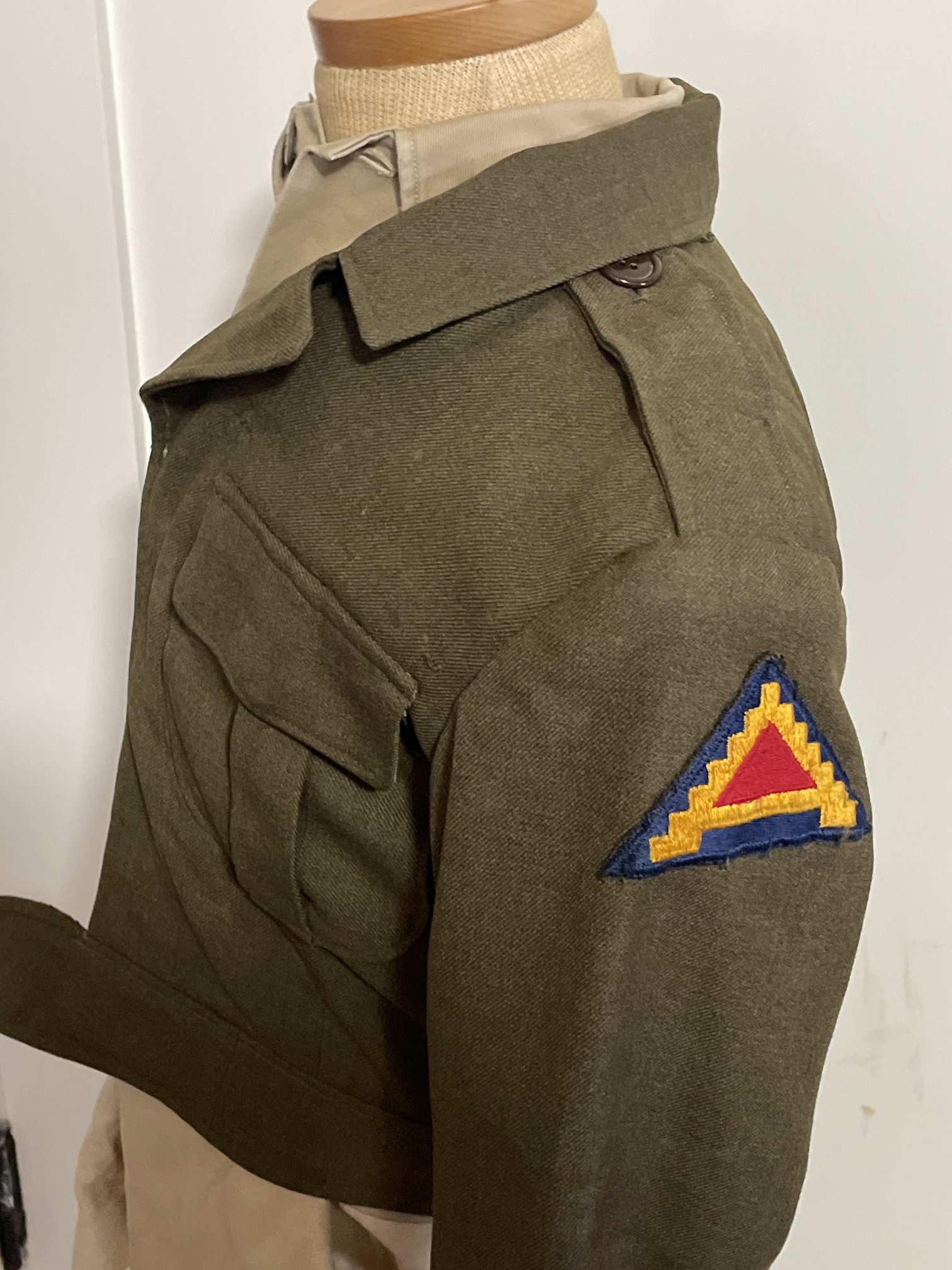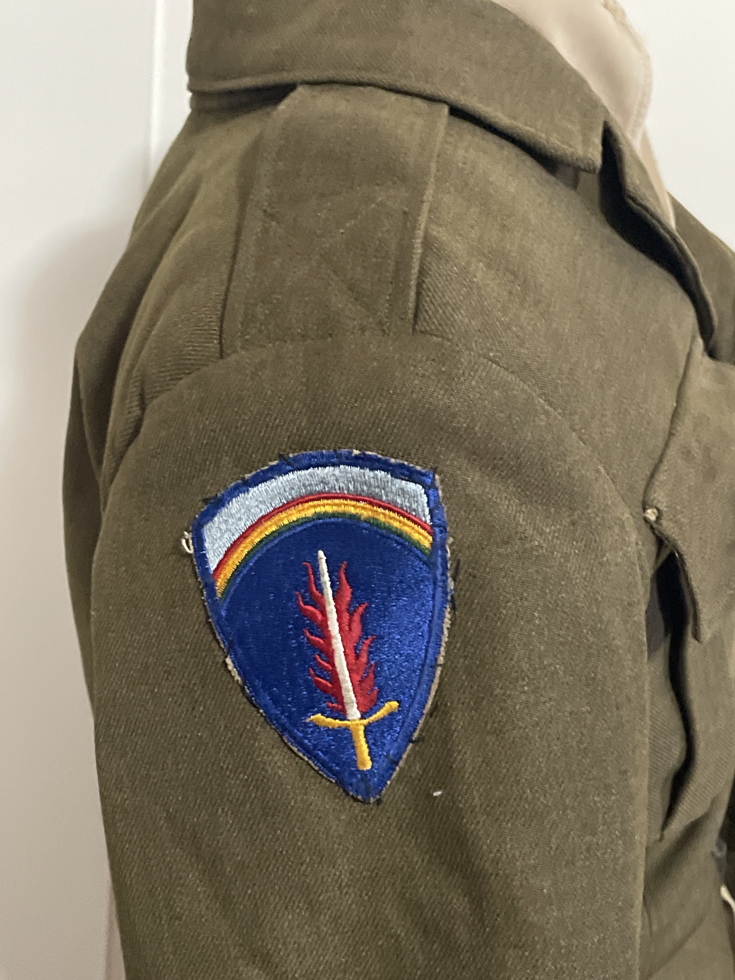 | Description | Uniform of Edward Friedman. Wool "Ike" jacket, with USFET (see USFET (formerly SHAEF) SSI) SSI on the right shoulder, and a 7th Army SSI (see 7th Army SSI) on the left shoulder. Two patch pockets, with lined flaps. Two bottom buttons missing. No other insignia. The right-side facing has pre-existing buttonholes sewn up. I'm not sure if this is a mistake, or evidence of re-used material. The lining is a light tan cotton (?) twill. The trousers are of the same wool, with several different lining/facing materials used. A hand-written "18" is on the right pocket lining. In the rear right pocket, which lacks a button (never had one?). is a page torn from a small spiral-bound notebook, with "William Frieman" written several times in a child's hands, in pencil. The khaki shirt is made of cotton, with two chest pockets (both missing buttons), and an extension of a different fabric sewn to the bottom, which is fragile and torn. There are child-sized (1 3/4" wide) blue-on-khaki Sergeant First Class stripes on the right sleeve. The chevrons look like the 1948-pattern, but are 1/4" too narrow. Edward went with his sister and mother to visit his father in Germany, in 1946. His father was assigned to a labor supervision company, and a German tailor made this uniform for young Edward. |