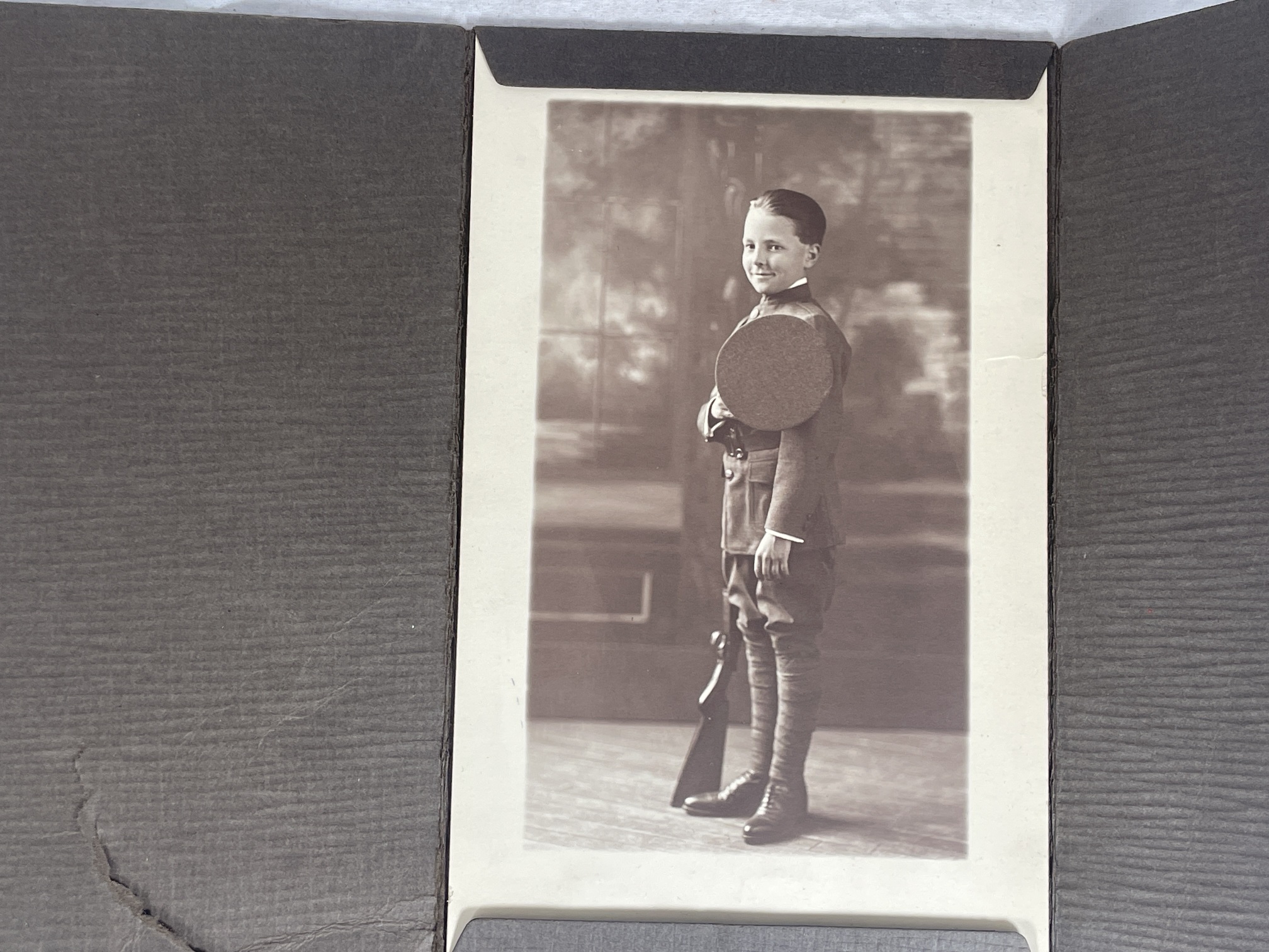 A studio photograph of a boy in a woolen uniform, holding his peaked cap in front of his shoulder. He is in a well-tailored woolen tunic and riding breeches, with puttees and leather shoes. A very small amount of white sleeve and collar are visible. There is the butt of what appears to be a full-size shotgun behind him. The background is blurred, but is possibly a painted backdrop.