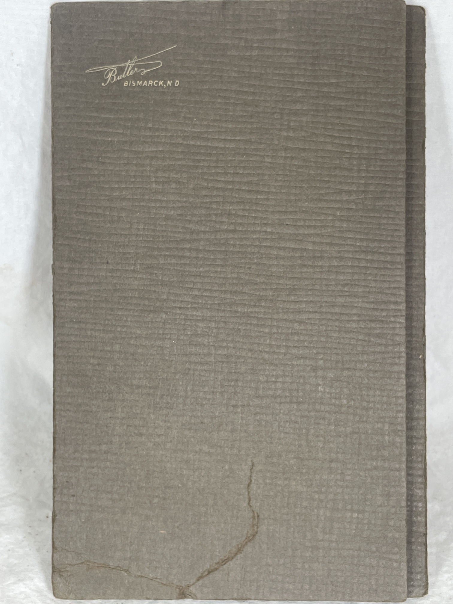 Card folder is torn on the lower front. Upper front is marked, "Butler | BISMARK, N.D.". Butler was active from at least 1904 to at least 1923. |