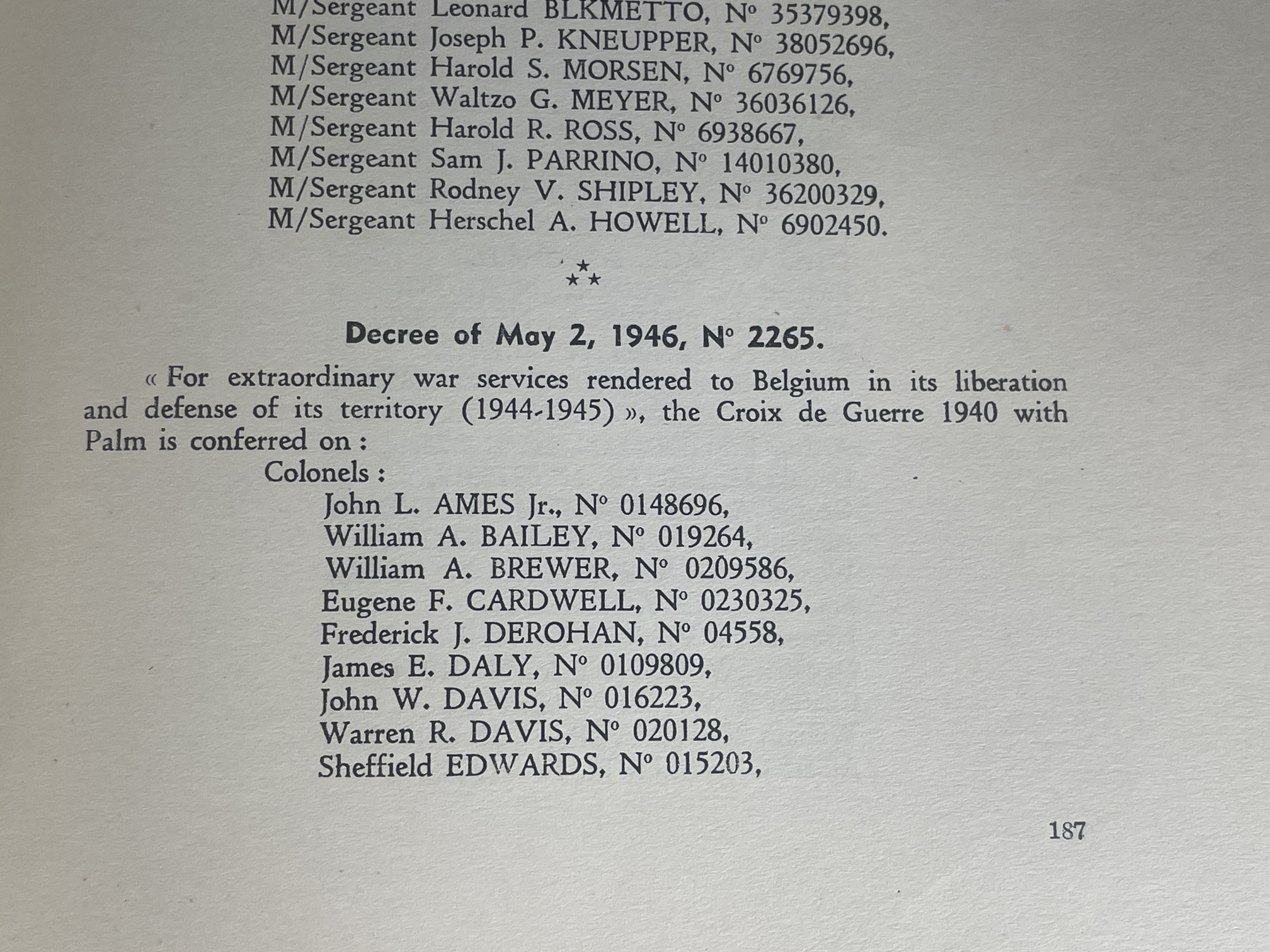 | Description | Paperback. Six-color cover. Includes many plates. Some damage to lower spine. "Lietenant-Colonel A. De Baene | GLORY and HONOR | to | the Armies of the United States | of America, | Liberators of Belgium | 1944 - 1945. | Editions J. Rozez, S. A. - Burxelles". On page 187, "Decree of May 2, 1946, No 2265 | << For extraordinary war services rendered to Belgium in its liberation | and defense of its territory (1944-1945) >>, the Croix de Guerre 1940 with | Palm is conferred on : ". The list runs to page 199, starting with Colonels, and going down in rank. Thomas Nichol, Jr., is listed on page 195, as a Major. See: British-made "Ike" jacket of Thomas Nicol, Jr. |
