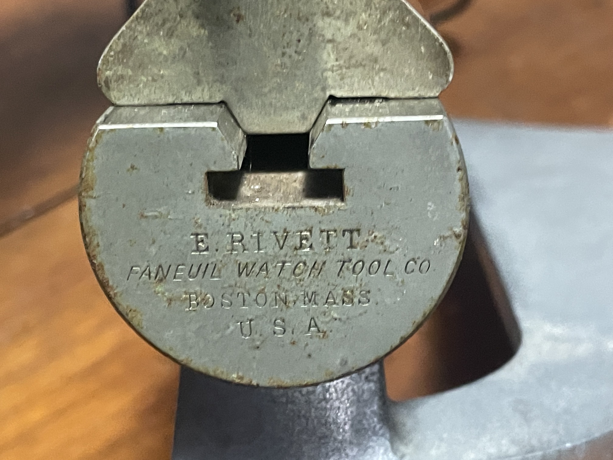 A WW-type watchmaker's lathe. Marked at one end of the bed, "E. RIVETT | FANEUIL WATCH TOOL CO. | BOSTON, MASS. | U. S. A.", and at the other end, "STEEL".