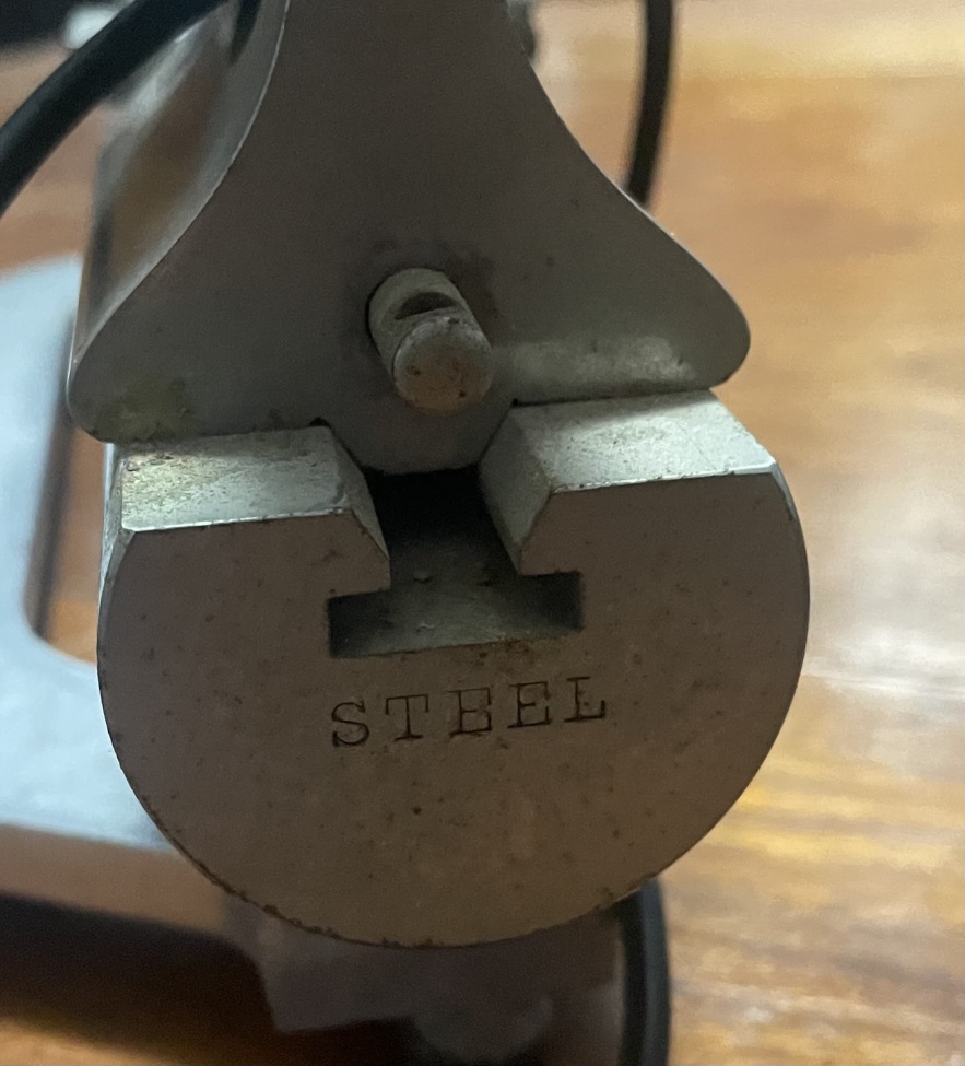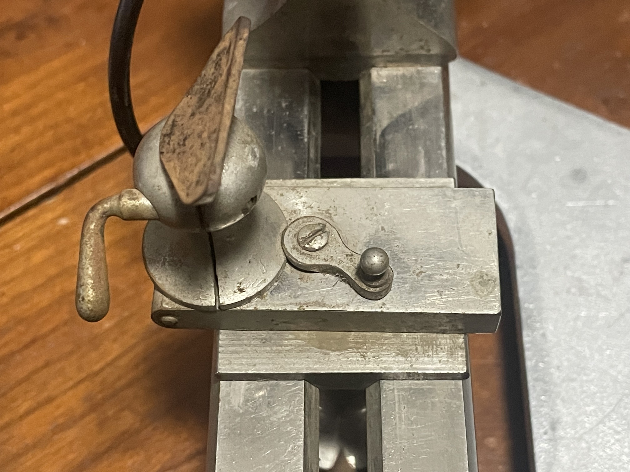 It is attached to a (later?) aluminum frame (so it does not have its original stand), the lathe has incomplete head- and tail-stocks, and a tip-up tool-rest, with a cam. All three components have blued parts which have rusted. There is a small collet in the headstock, which is also rusted. |