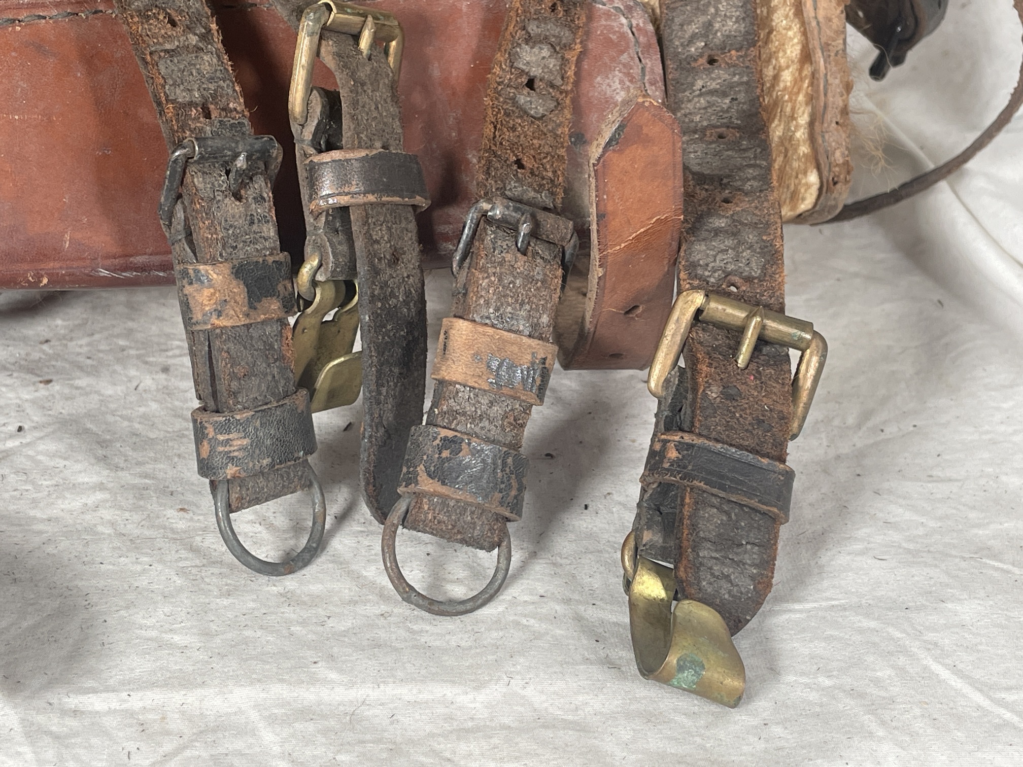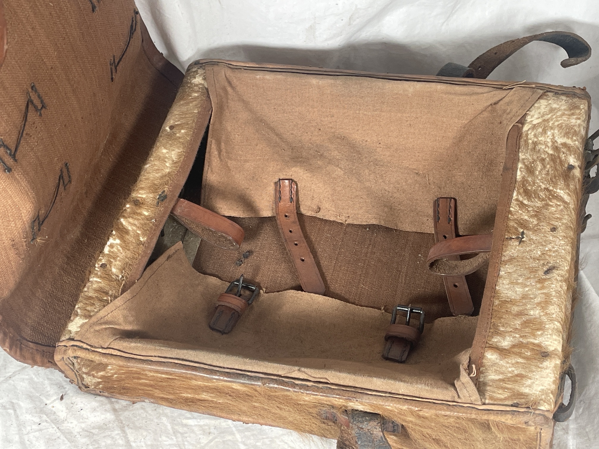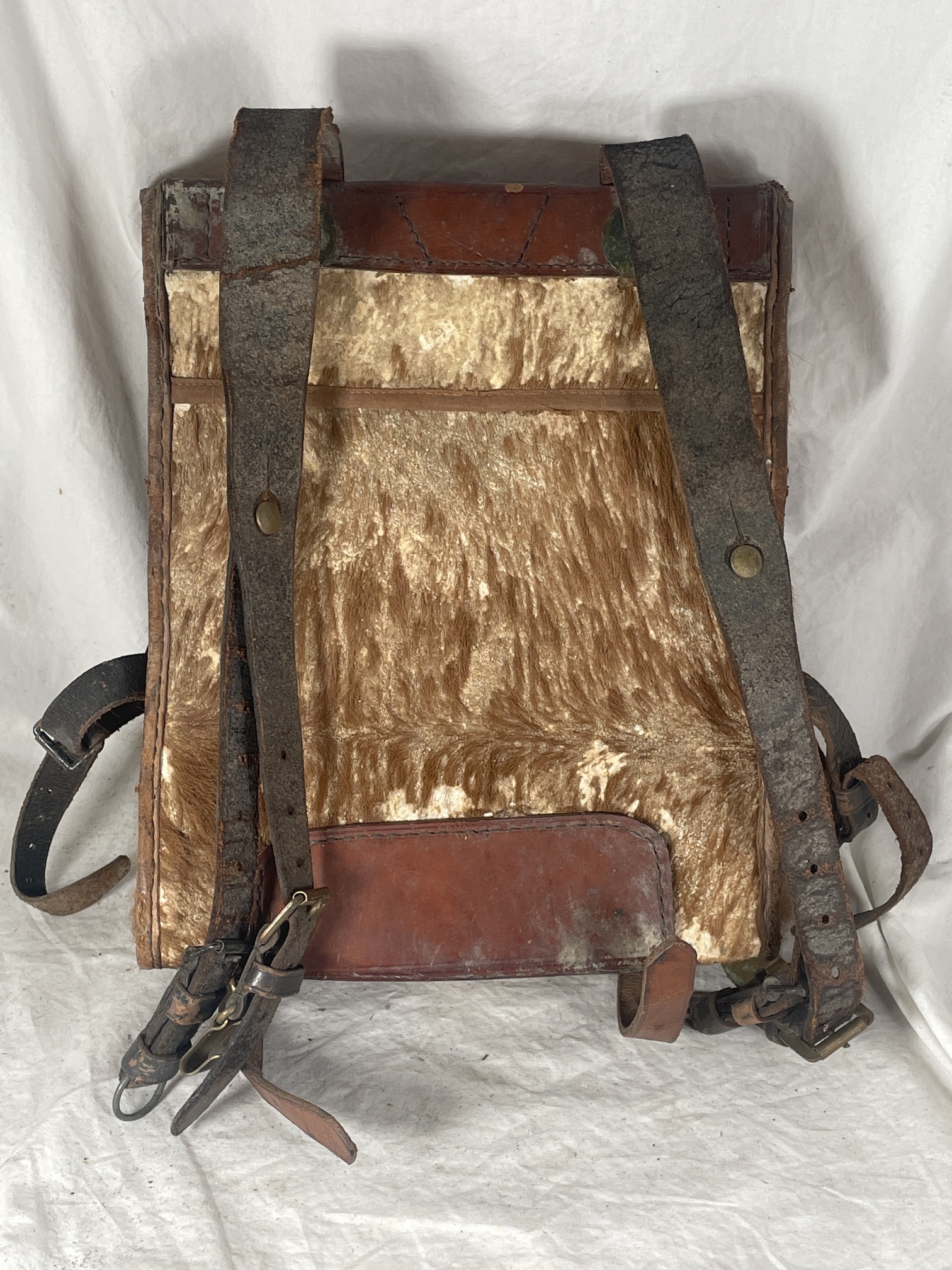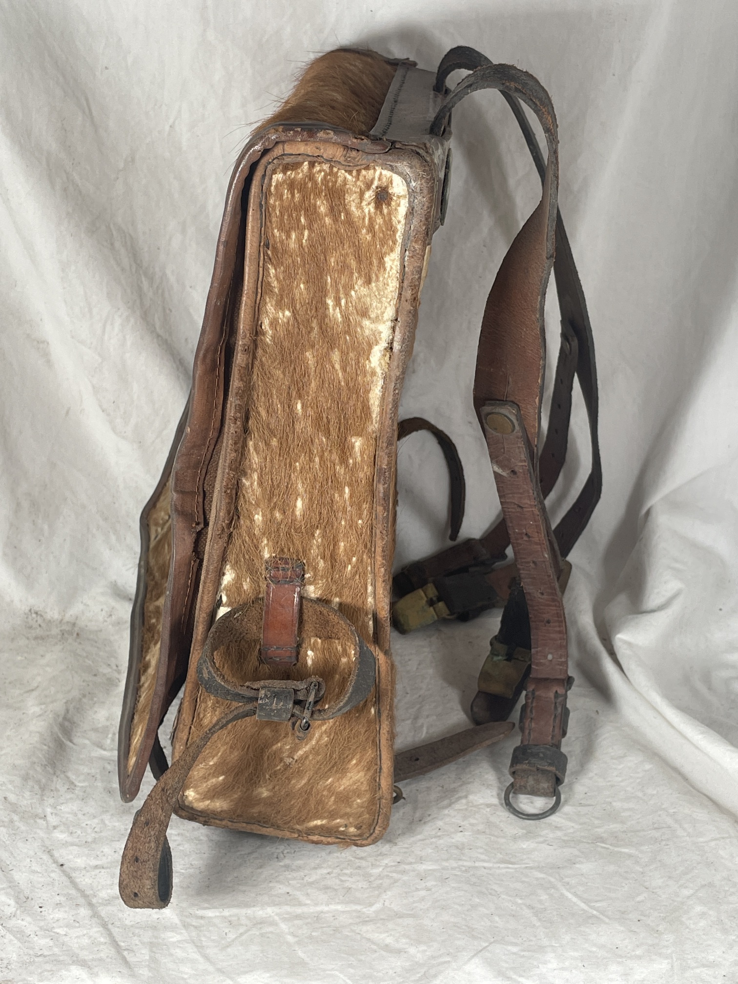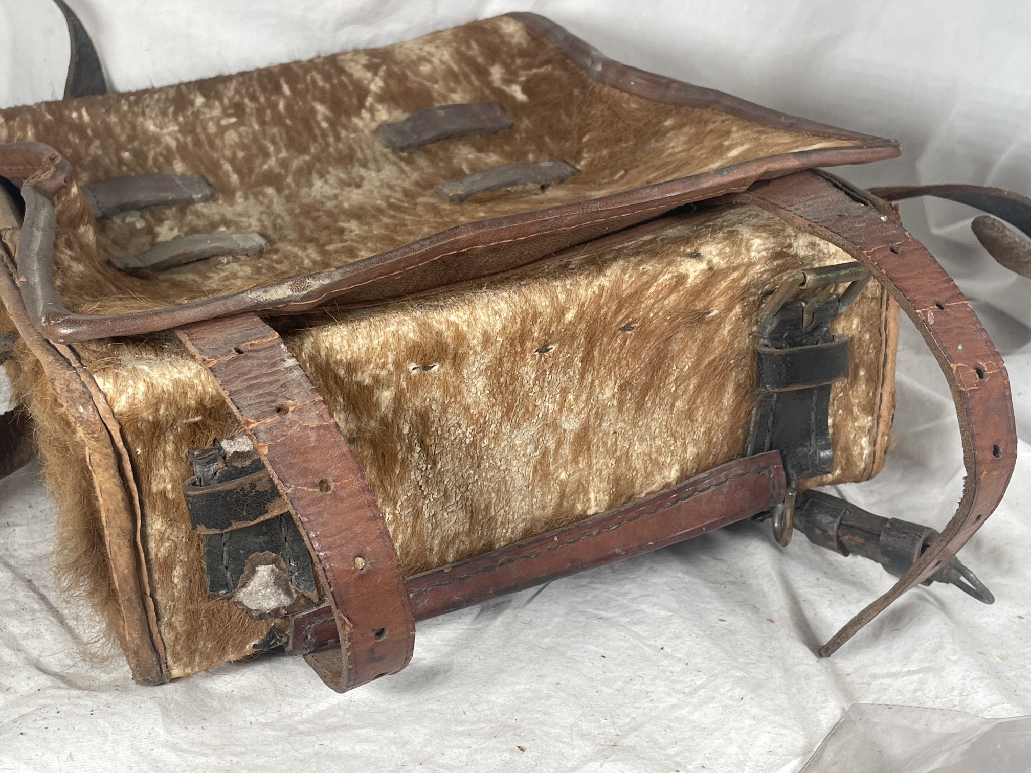 A small tornister (backpack) for a child. Made of leather, with fur. Integrated brown leather straps have steel and brass hardware. Some broken straps, and one separated buckle is included inside. No markings.