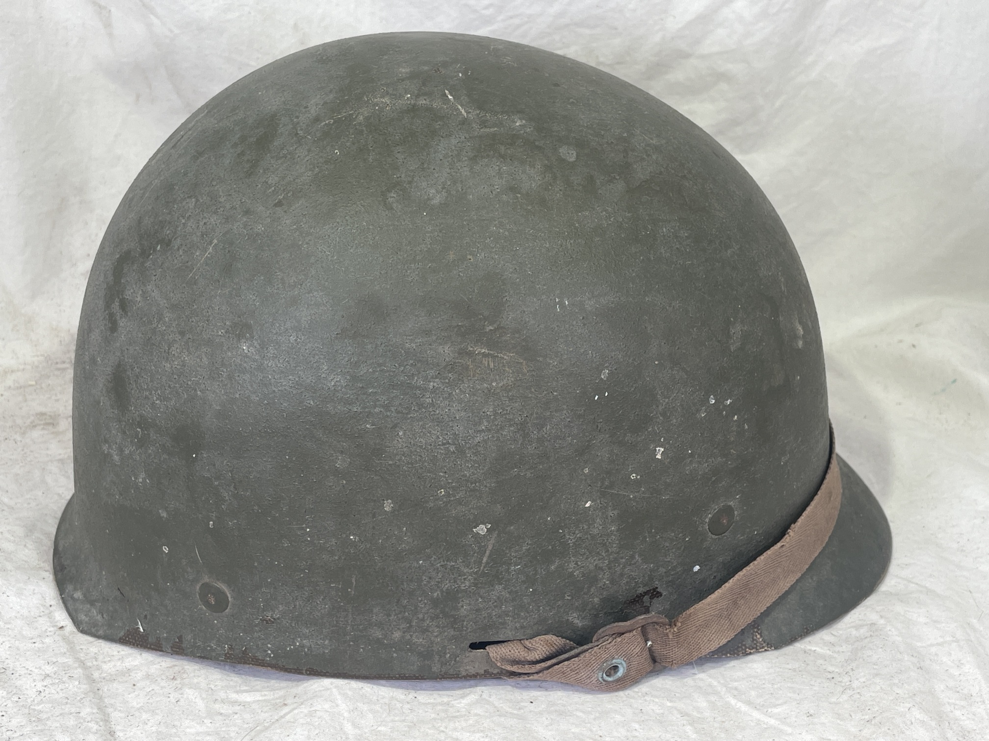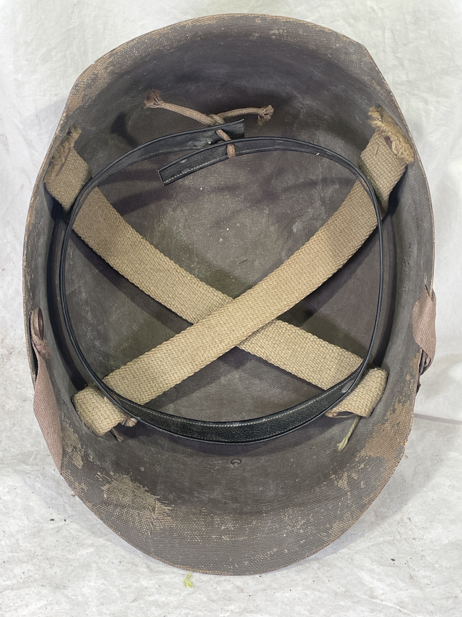 | Description | I believe this is a low-pressure liner, possibly by St. Clair. The inside is clearly cloth strips, and has no apparent markings. A child's toy helmet made from a WWII-era painted M-1 helmet liner. The suspension consists of two relatively thick webbing straps, and a plastic headband. There is a herringbone cotton chinstrap with buckle, fitted through slots on the sides of the helmet. Insignia hole on front. No apparent markings. The outside is painted green, with some paint chipped off at the sides. Compare to: Child's toy helmet liner conversion |