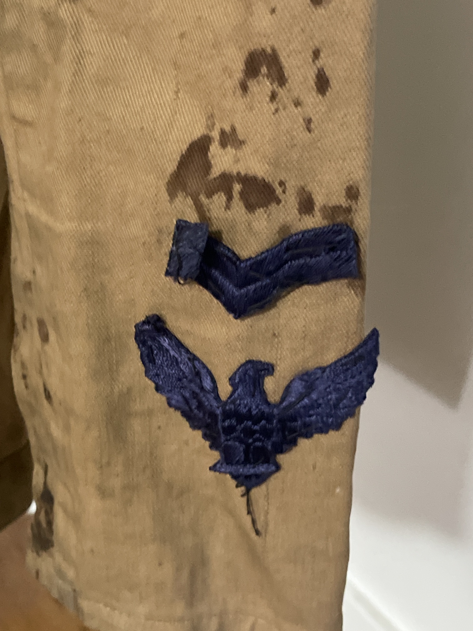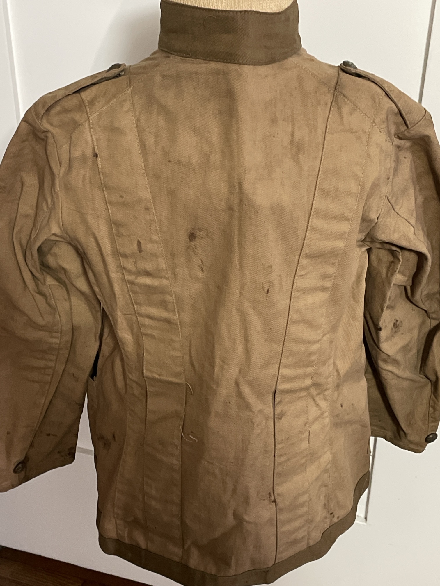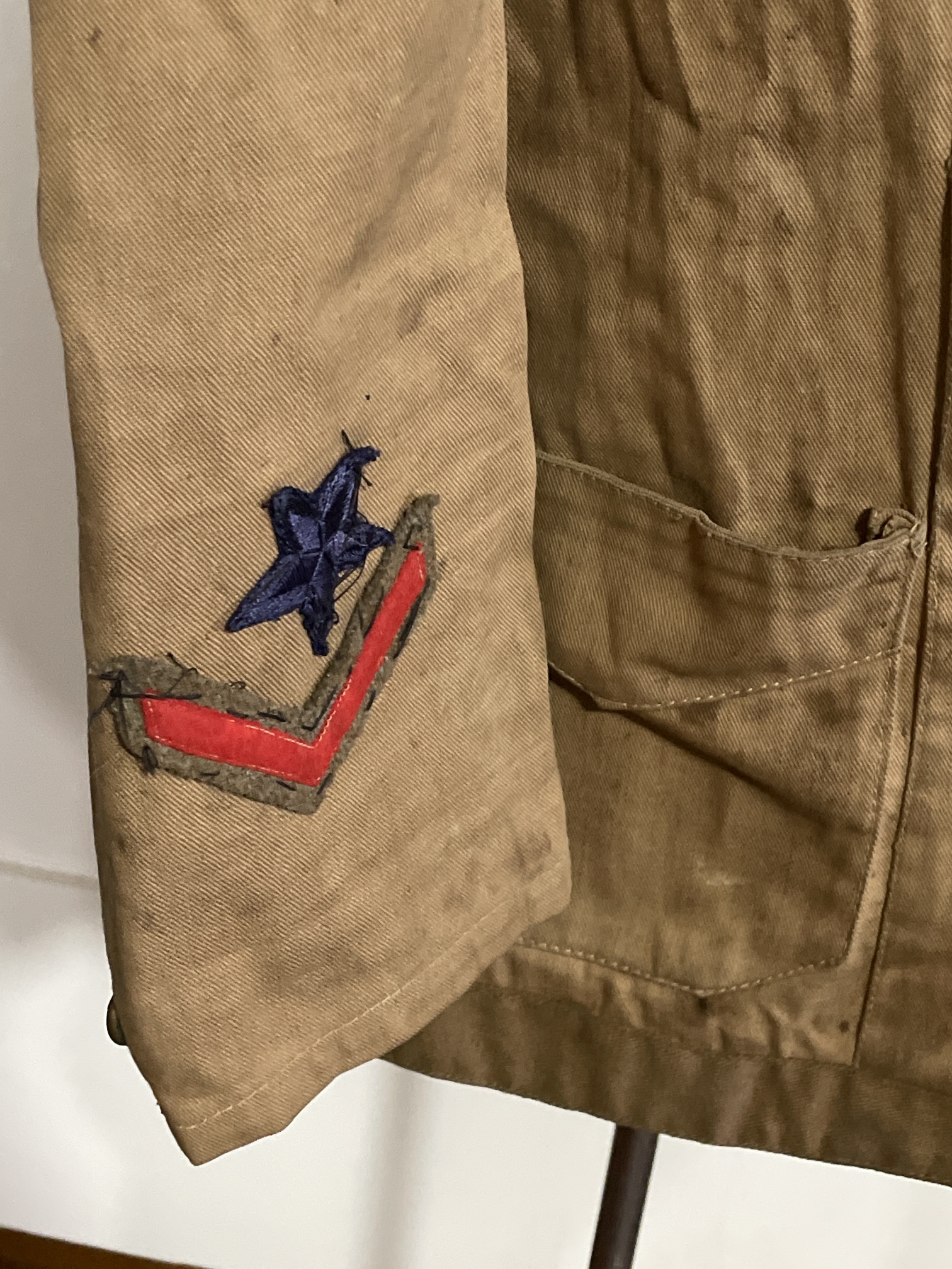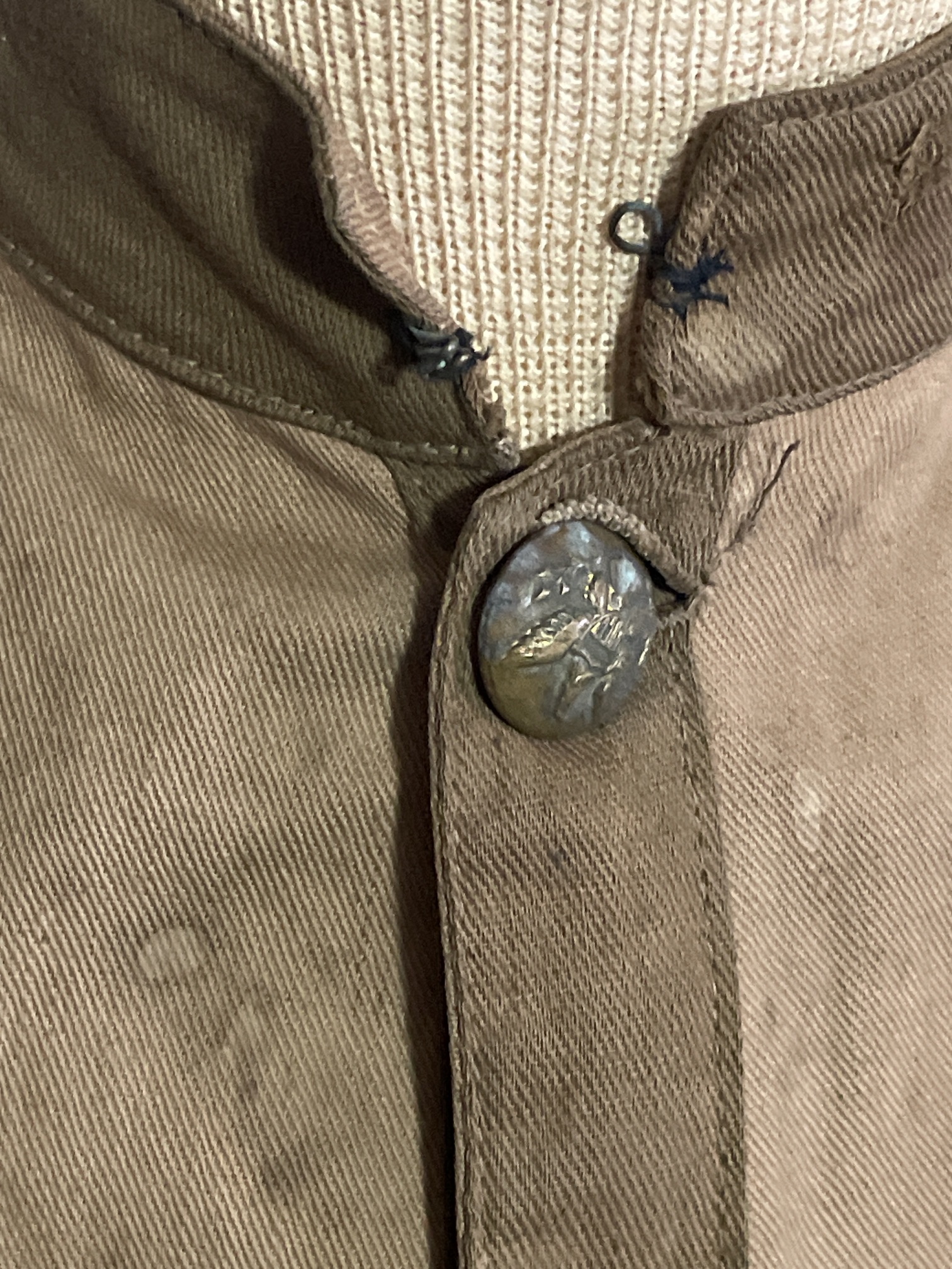 | Description | A khaki cotton tunic, with brown stand-up collar and brown trim. Two false-flap patch pockets at the bottom. Four Civil/Indian War style child's buttons on front, and smaller ones on epaulets and cuffs. Buttons have unmarked steel backs. Buttons on front are held on with rings, through steel eyelets. Hook and eye on the collar appears later. Integrated belt loops at back. Unmarked and unlined. Insignia is crudely hand-stitched to the bottoms of the sleeves, and consists of a blue chevron over an eagle on the left sleeve, and a blue star over a single red chevron on a green wool backing on the right sleeve. Similar to the "Dewey Suit" pictured at the top right of p.49 of "Wee Warriors and Playtime Patriots". |
