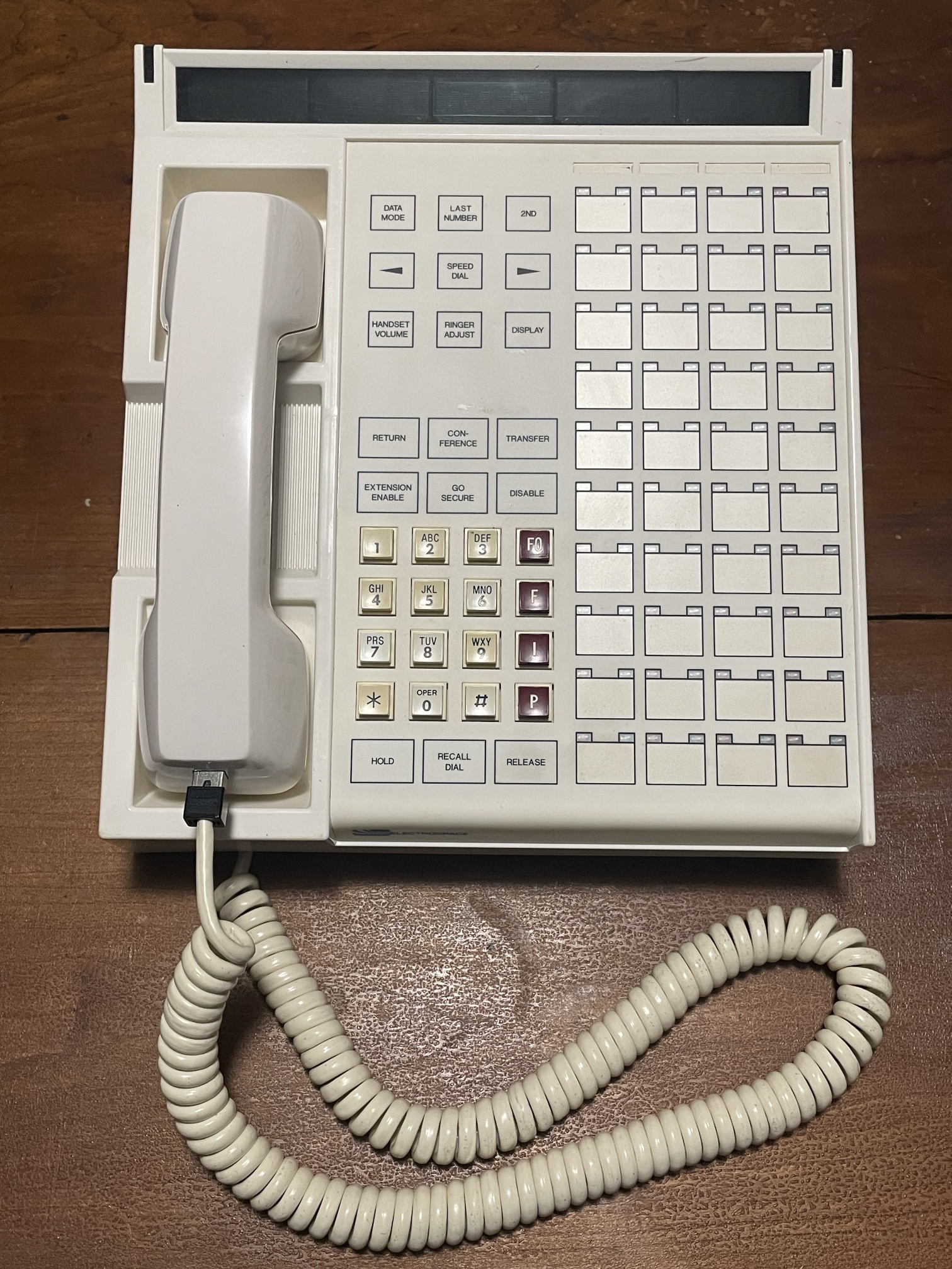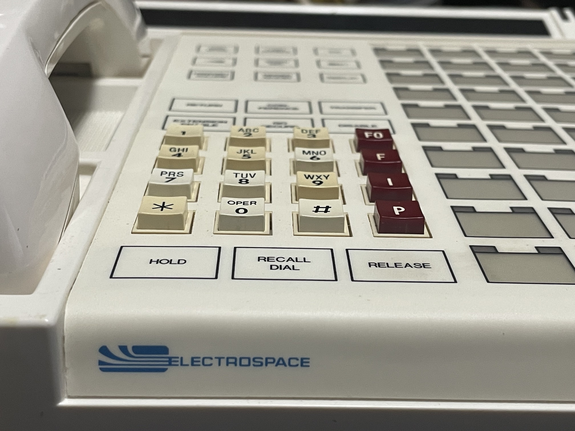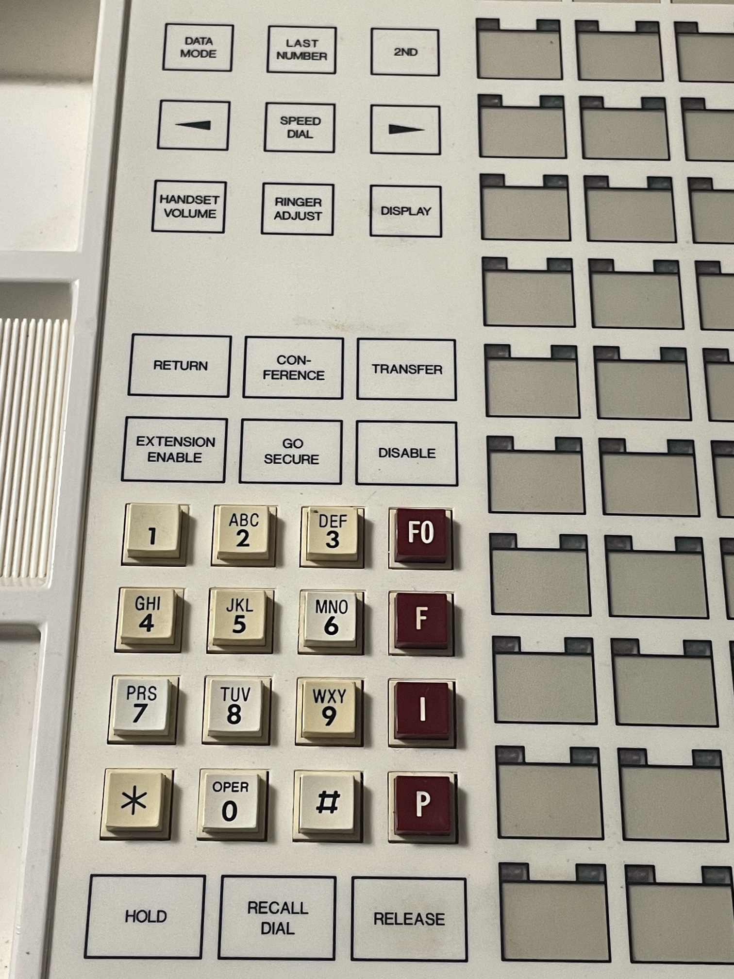 The four red buttons, "FO", "F", "I", and "P", were for the multilevel precedence and preemption (MLPP) system, which allowed the priority for calls to be set ("Flash Override", "Flash", "Immediate", and "Priority", respectively), above the default of "Routine." "Flash Override" allows the President of the United States to ensure his call will be allowed to go through over all others.