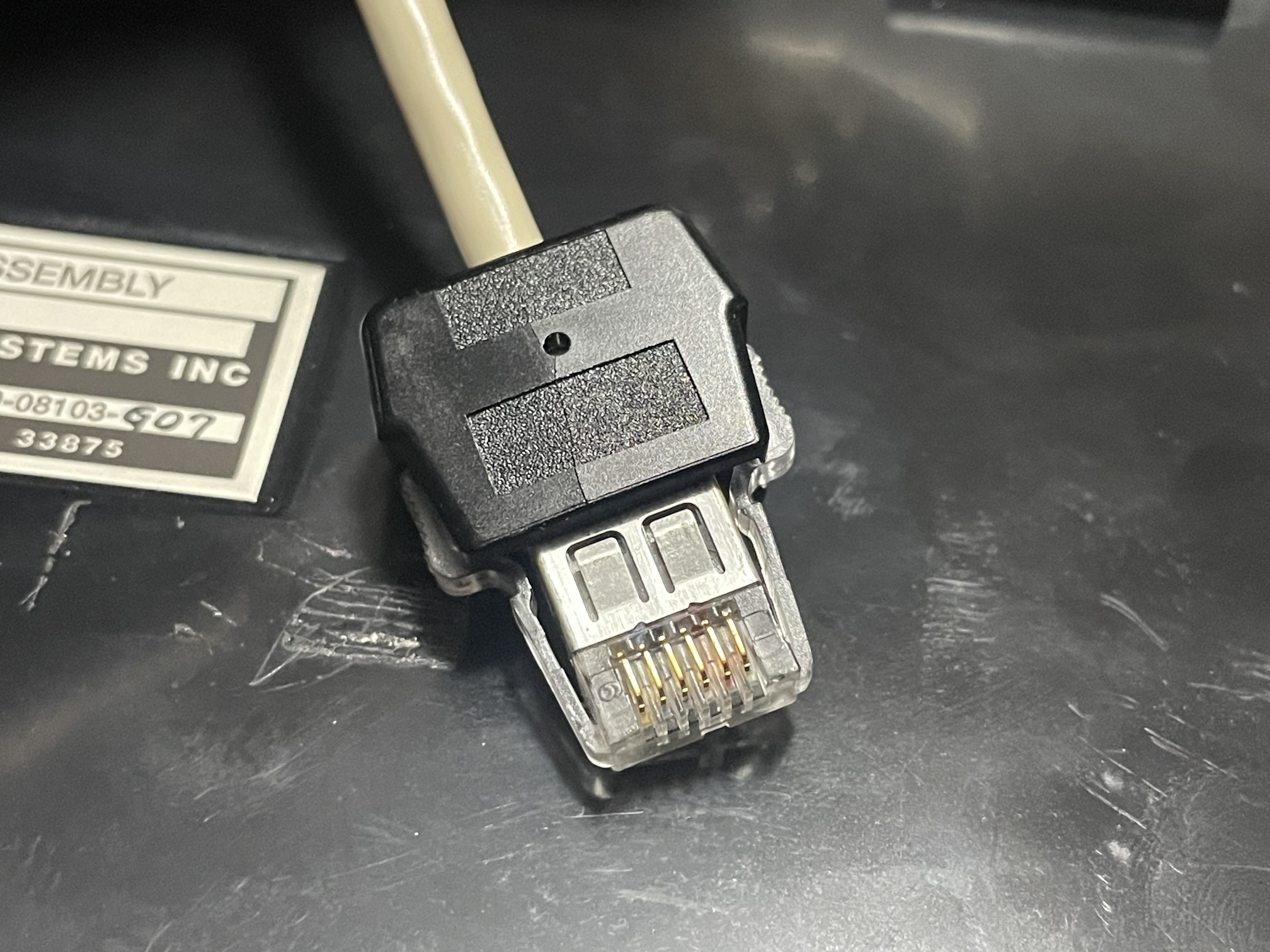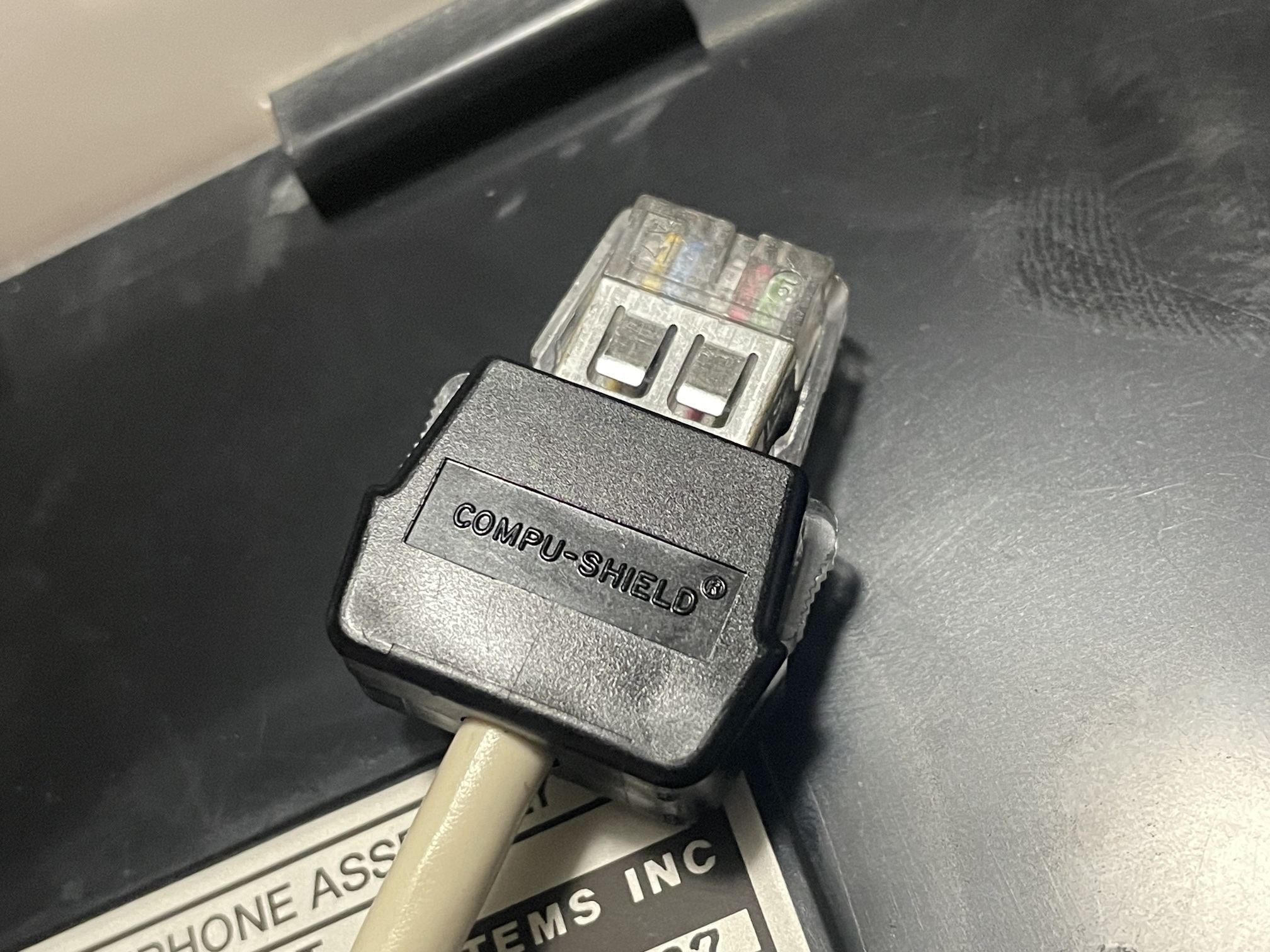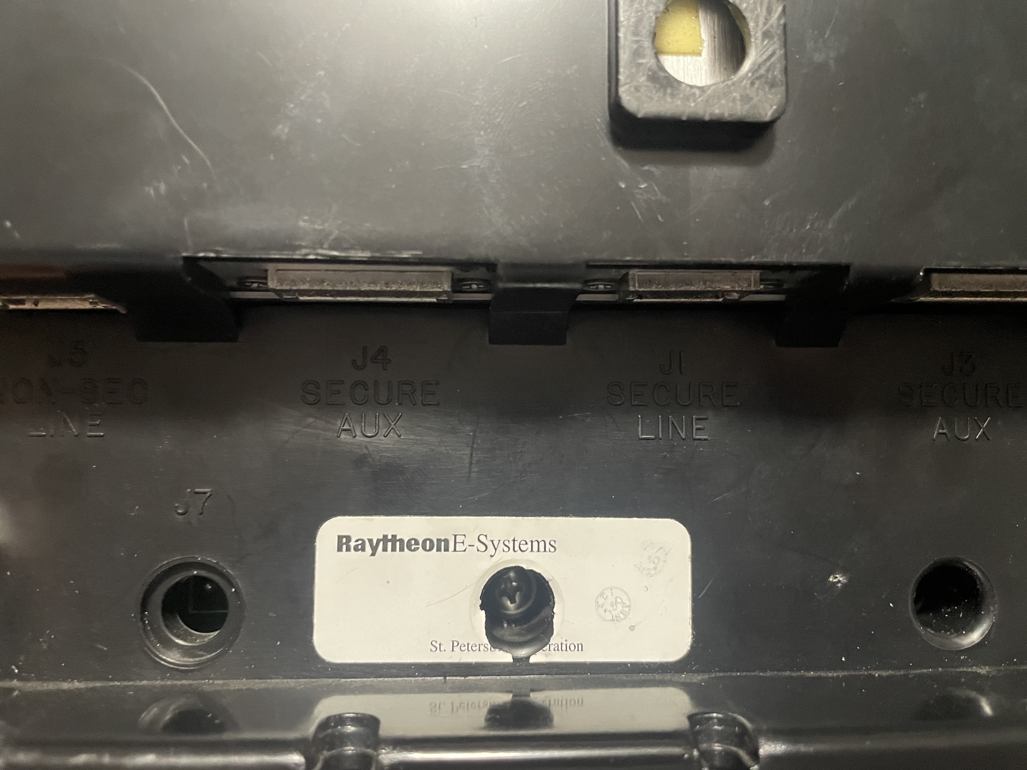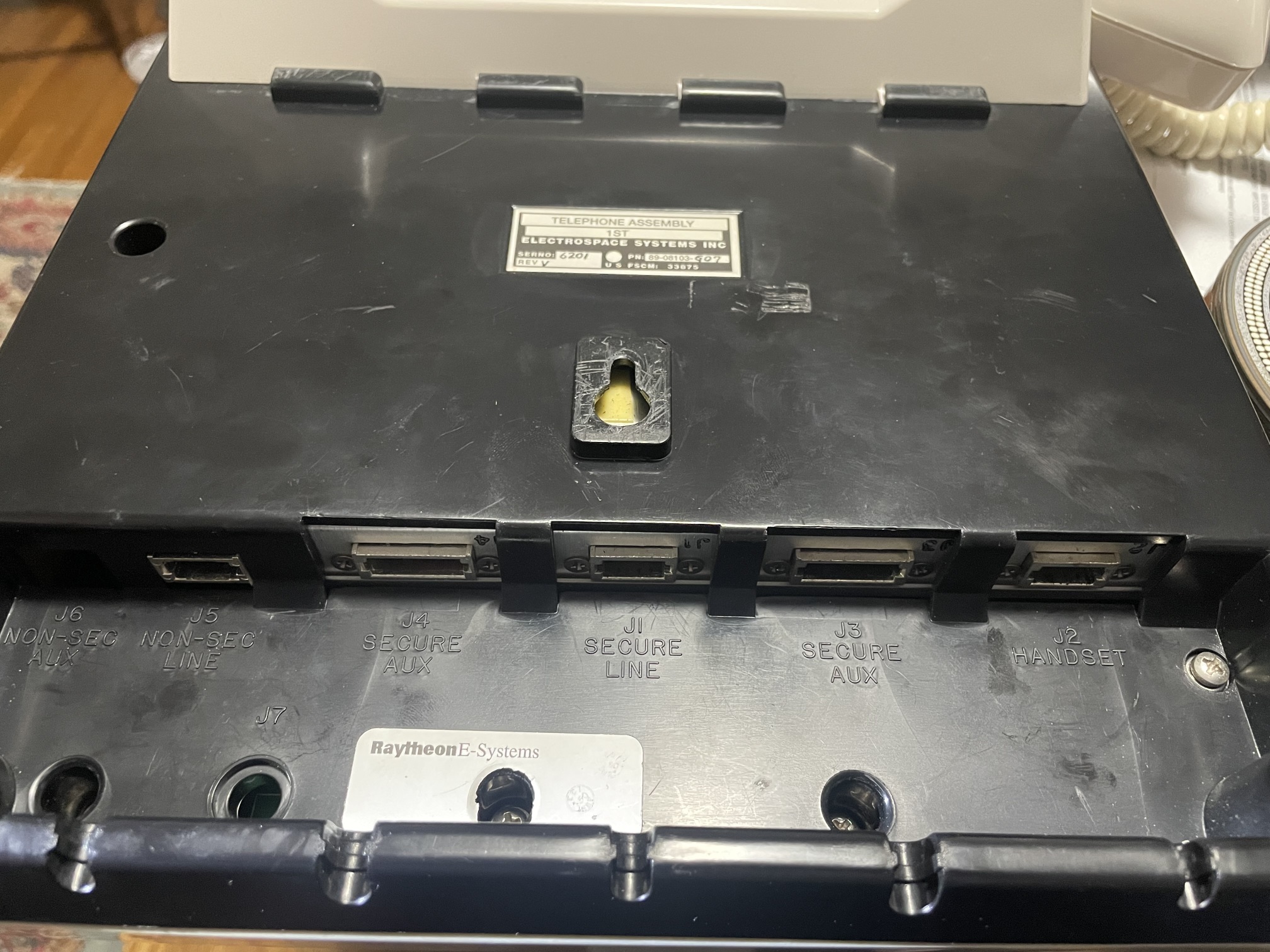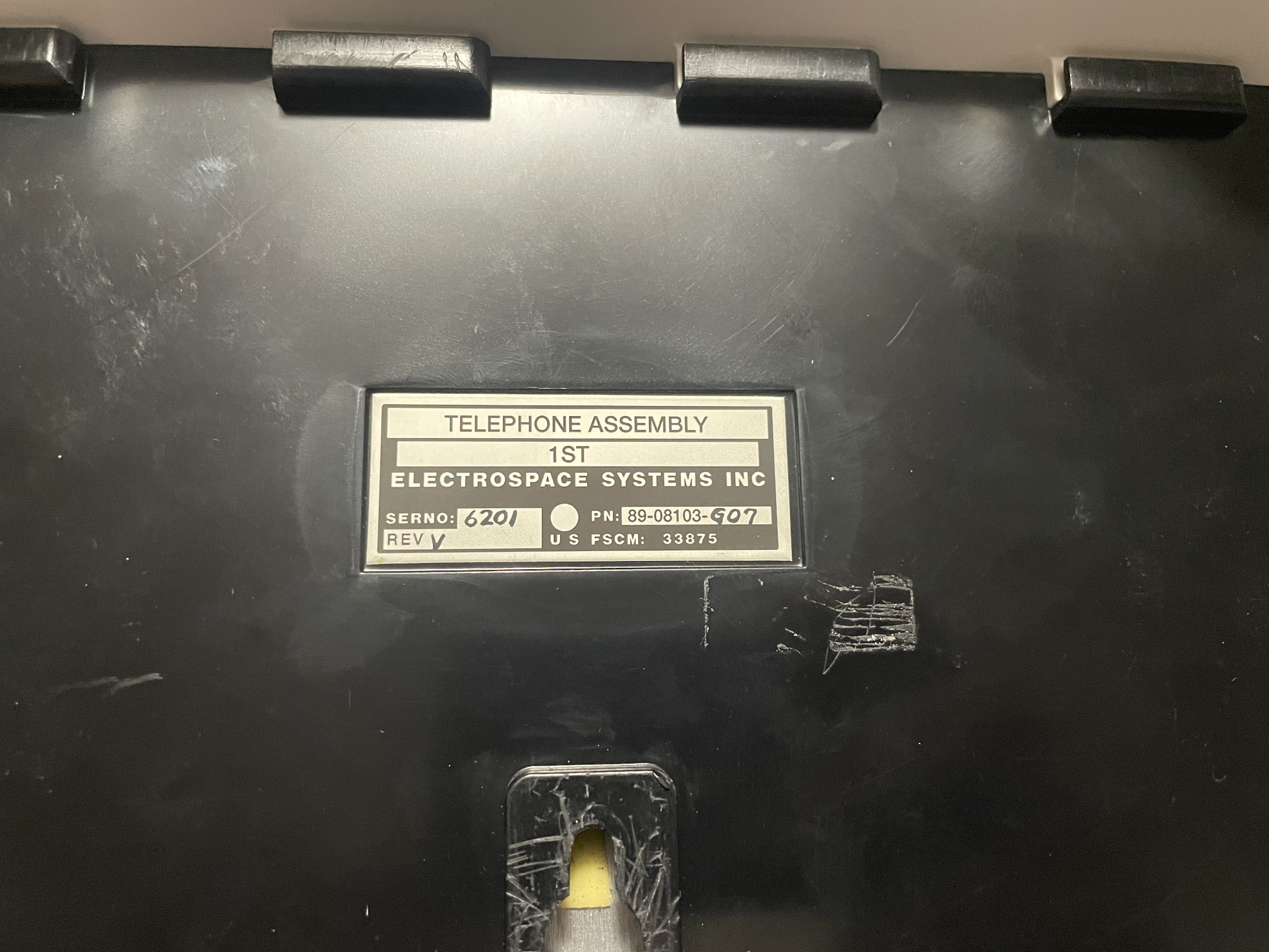 Branded "ELECTROSPACE" on the front. On the bottom is a label, "TELEPHONE ASSEMBLY | 1ST | ELECTROSPACE SYSTEMS INC | SERNO: 6201 PN:89-08103-G07 | REV V U.S. FSCM: 33875". Another small label appears to have been removed adjacent to it. There is a small label/seal, marked "RaytheonE-Systems", which has been punctured to access one of the assembly screws.