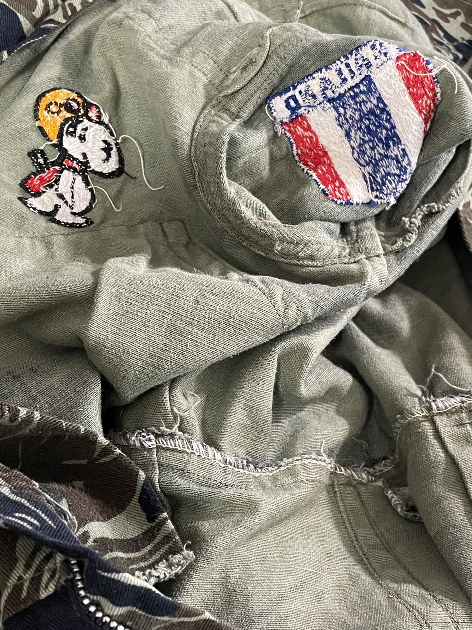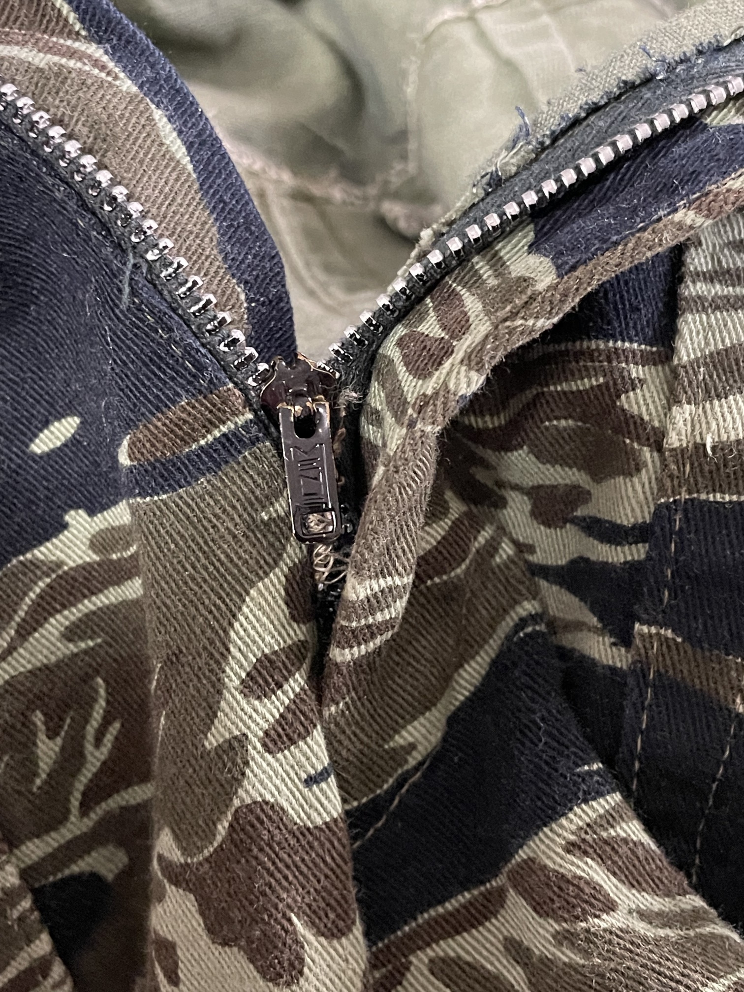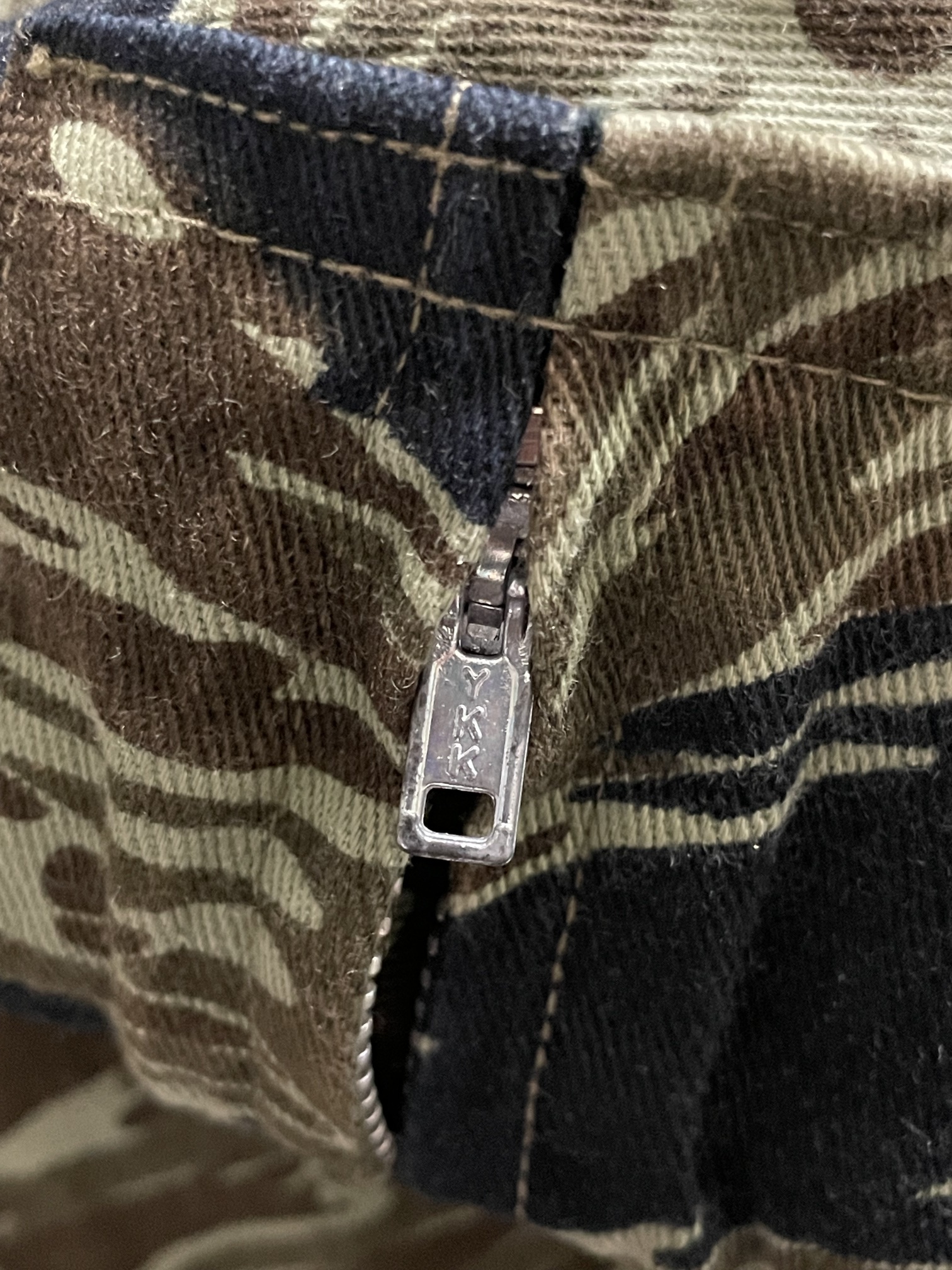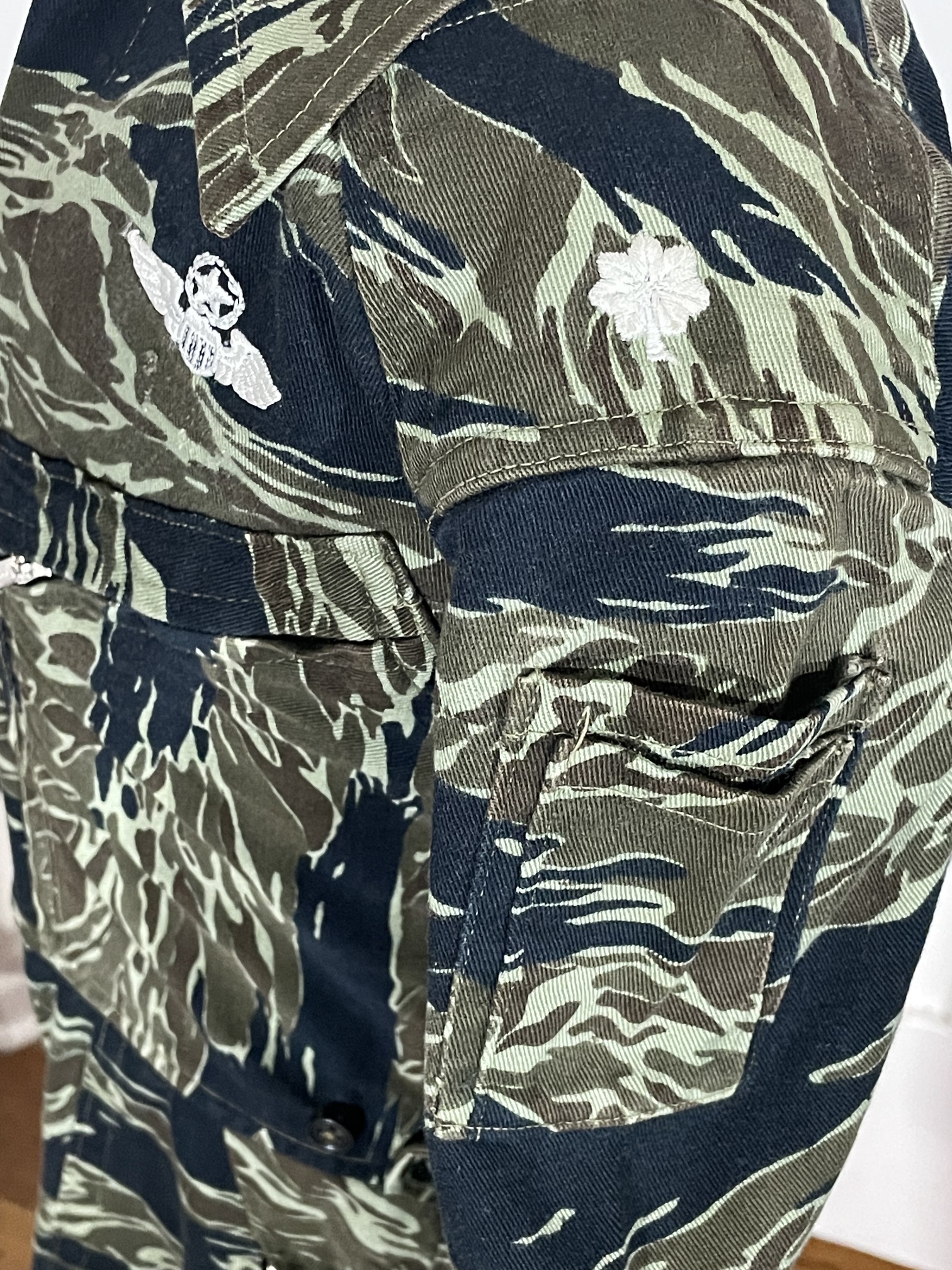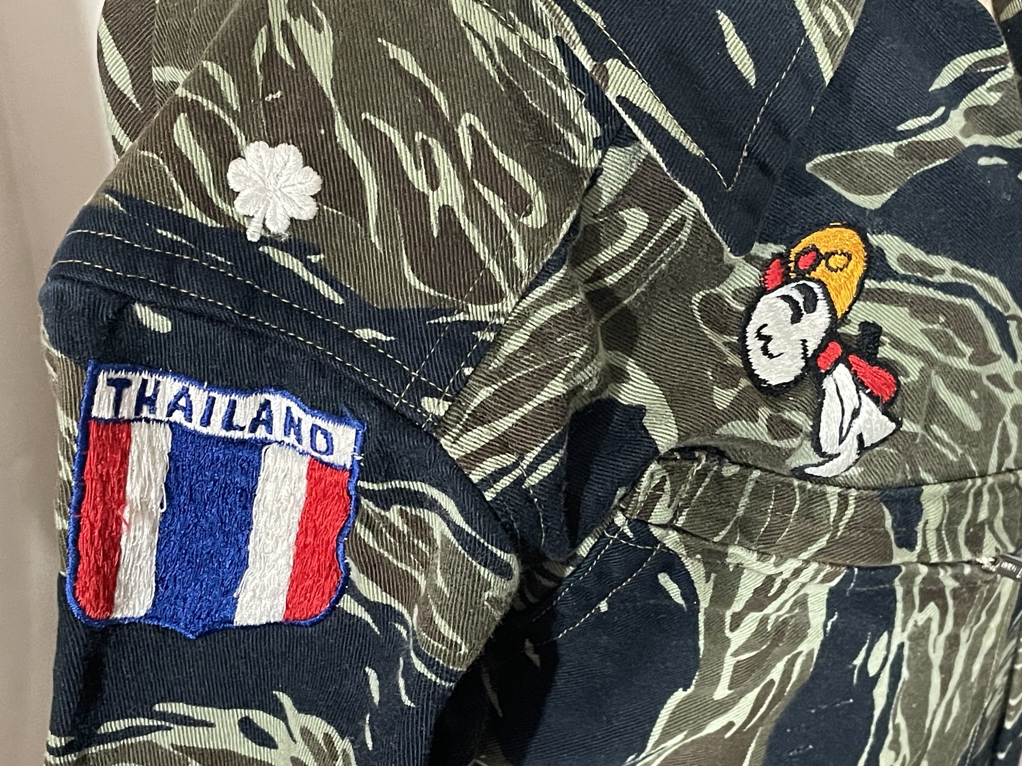 | Description | A Thai tiger stripe flight suit made for a small child. Small (1 7/8") Command Pilot Wings, Lieutenant Colonel oak leaves on the shoulders, a Snoopy in flight helmet and red scarf on right chest, and red, white and blue "THAILAND" shield on the right shoulder. All insignia is direct-embroidered. Fasteners include nine zippers, four buttons (two at each side of the waist), and one snap, at the neck. Zippers are marked "YKK", "ARROW", and "VENUS" (main front zipper, painted black), all vertically. The pattern, which has a 16.0" repeat length, appears to be "Thai, Tadpole Sparse Pattern - TTS", as described on pp.195-196 in "Tiger Patterns", Sgt. Richard Denis Johnson. That reference also describes Thai-made garments as having internal serge stitching with "an all white thread which possessed a silky appearance," which this garment also has, and states that USAF flight suits are often found in this pattern. Published in "Wee Warriors and Playtime Patriots", p.198. Ex-Peter Coleman Collection. |
