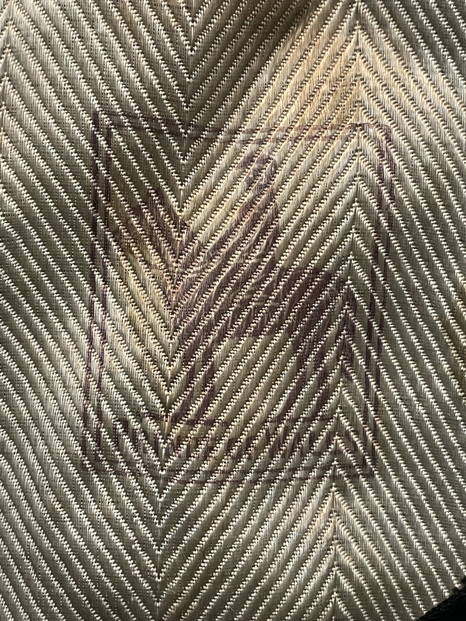 | Description | A peaked cap of fine blue wool, with woolen peak, for a very young child (2-3 years old?). Woven chin strap has gold wings with "AVIATOR" above, flanked on each side by a red circle with a white star, with a red circle in the center (similar to early-WWII US aircraft insignia). The strap is held by hexagonal buttons made of cheap stamped metal, with a woven pattern. They appear similar to cheap cufflinks of the 1930s. The top is lined in a grey/white silk-like fabric, in a wide herringbone weave, with a figure on a horse in a double rectangle, above "Prince of Wales" in small caps. The headband is stiffened with buckram. The cap is in mostly very good condition, but has a liquid stain to the back left, lightening the top and darkening the lining. The woven tape is the same pattern as seen on Child's aviator cap, except that one is all gold. |