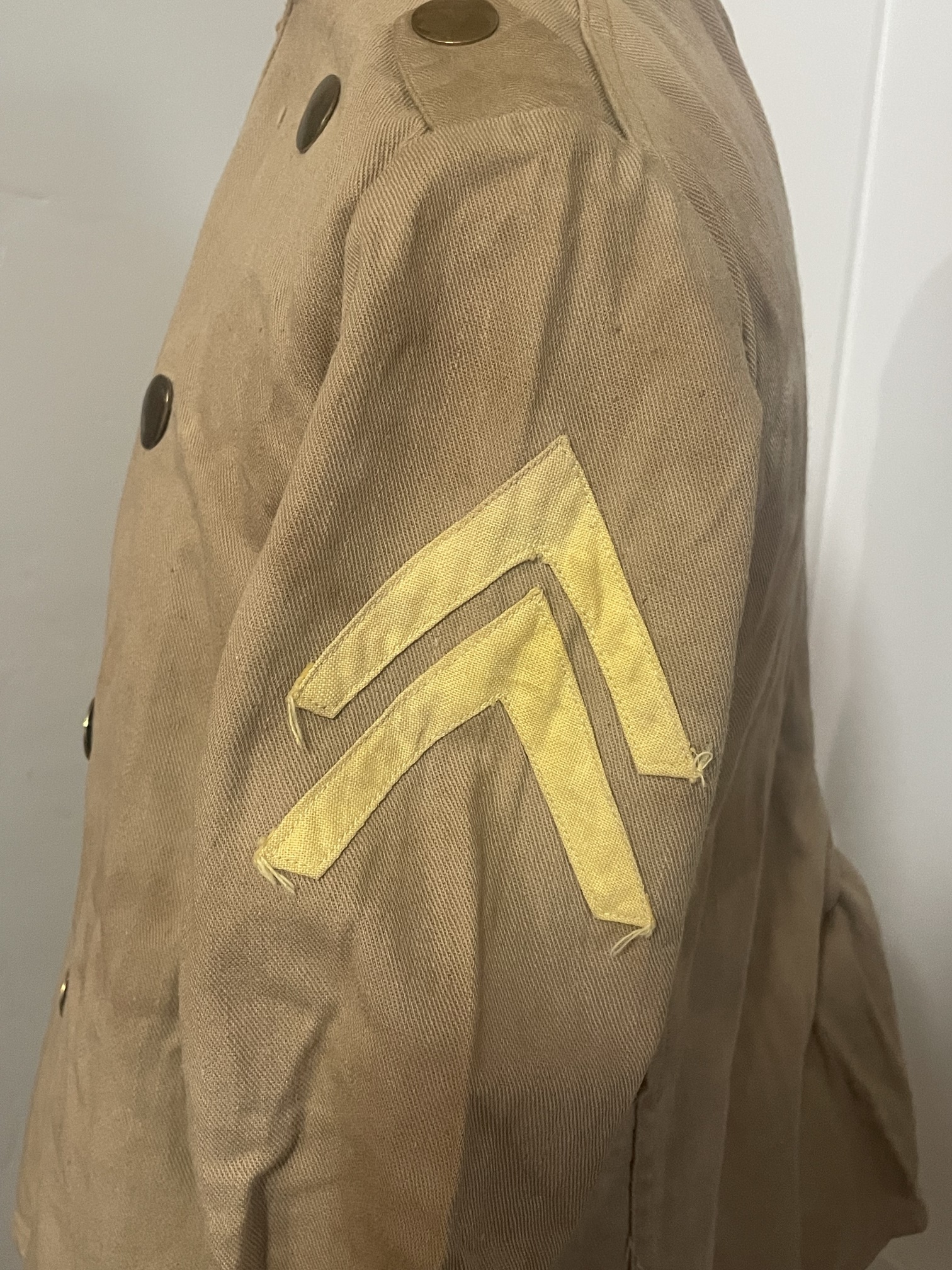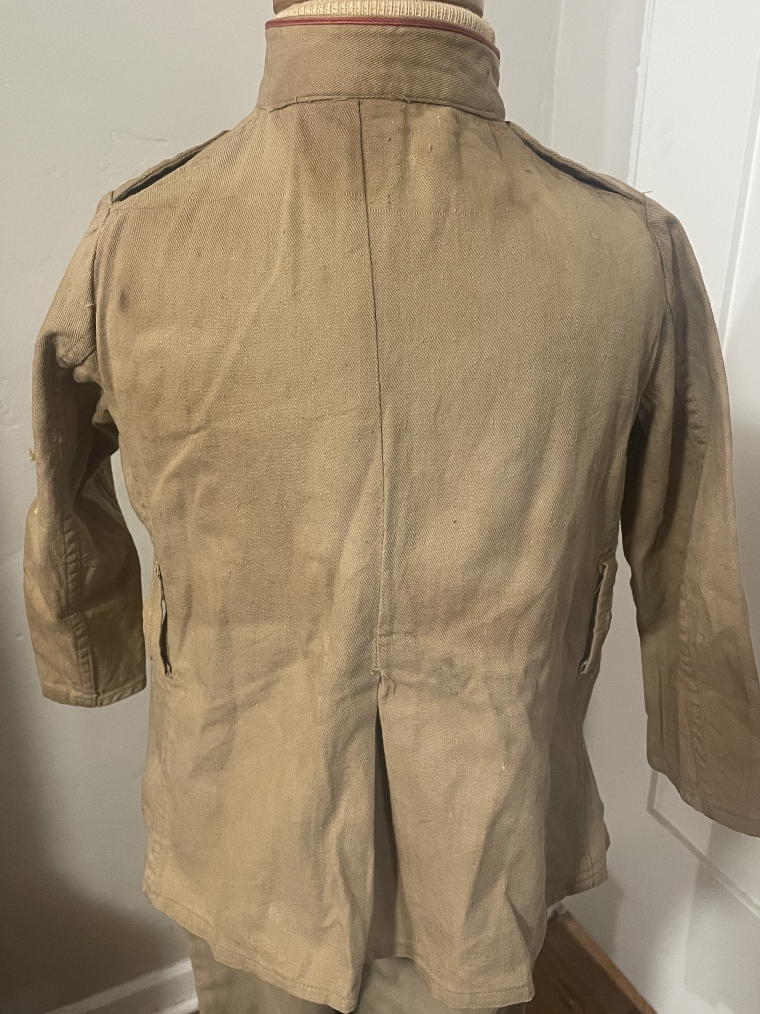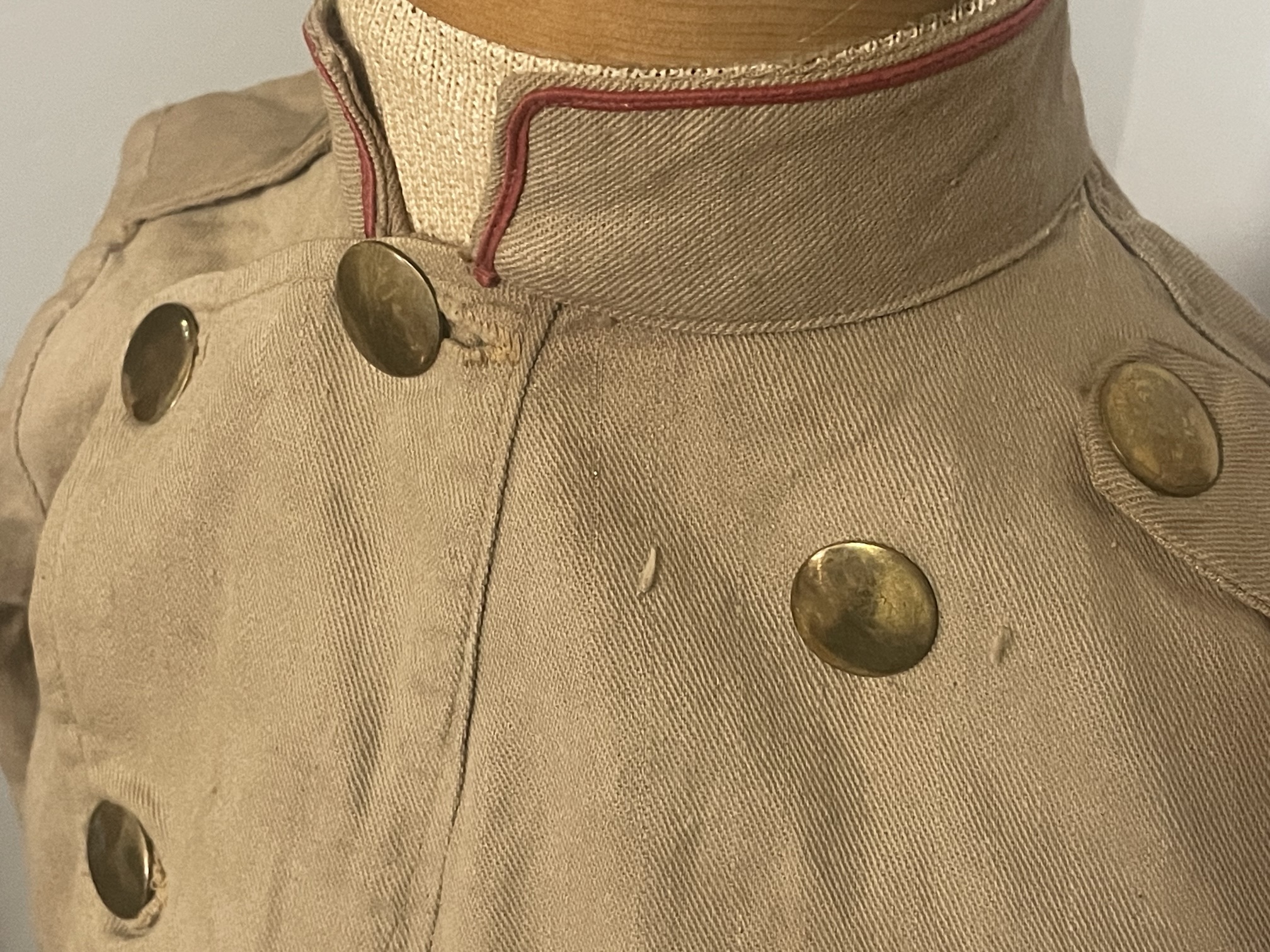 | Description | A light brown cotton double breasted tunic, with plain brass dish buttons, red piping on the stand-up collar, and two chevrons on the left sleeve. There is a red-on-white woven tag in the back of the collar, "KUMFY | TRADE MARK". The 3/4" buttons are clipped with cotter pins through steel eyelets. The matching trousers are unlined, and have four buttonholes in the waistband for simple suspenders. A single suspender strap, of matching material, with two buttons, remains, but the other is missing. Ex-Peter Coleman collection. Pictured in "Wee Warriors and Playtime Patriots", p.129. |