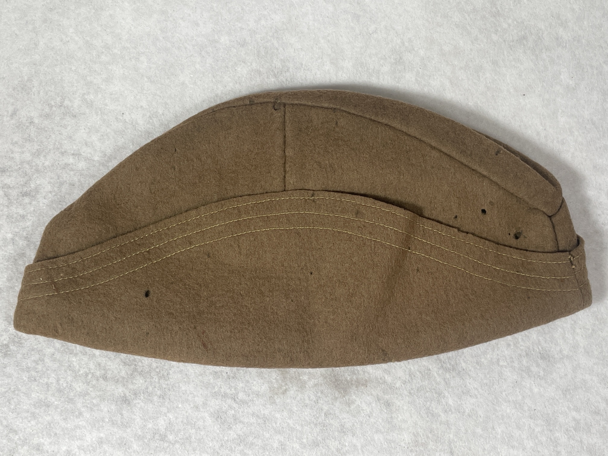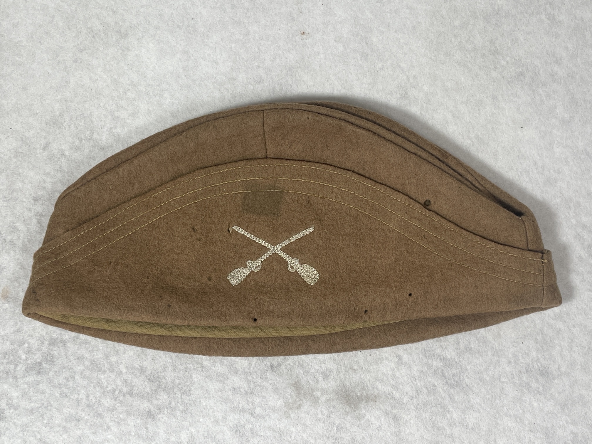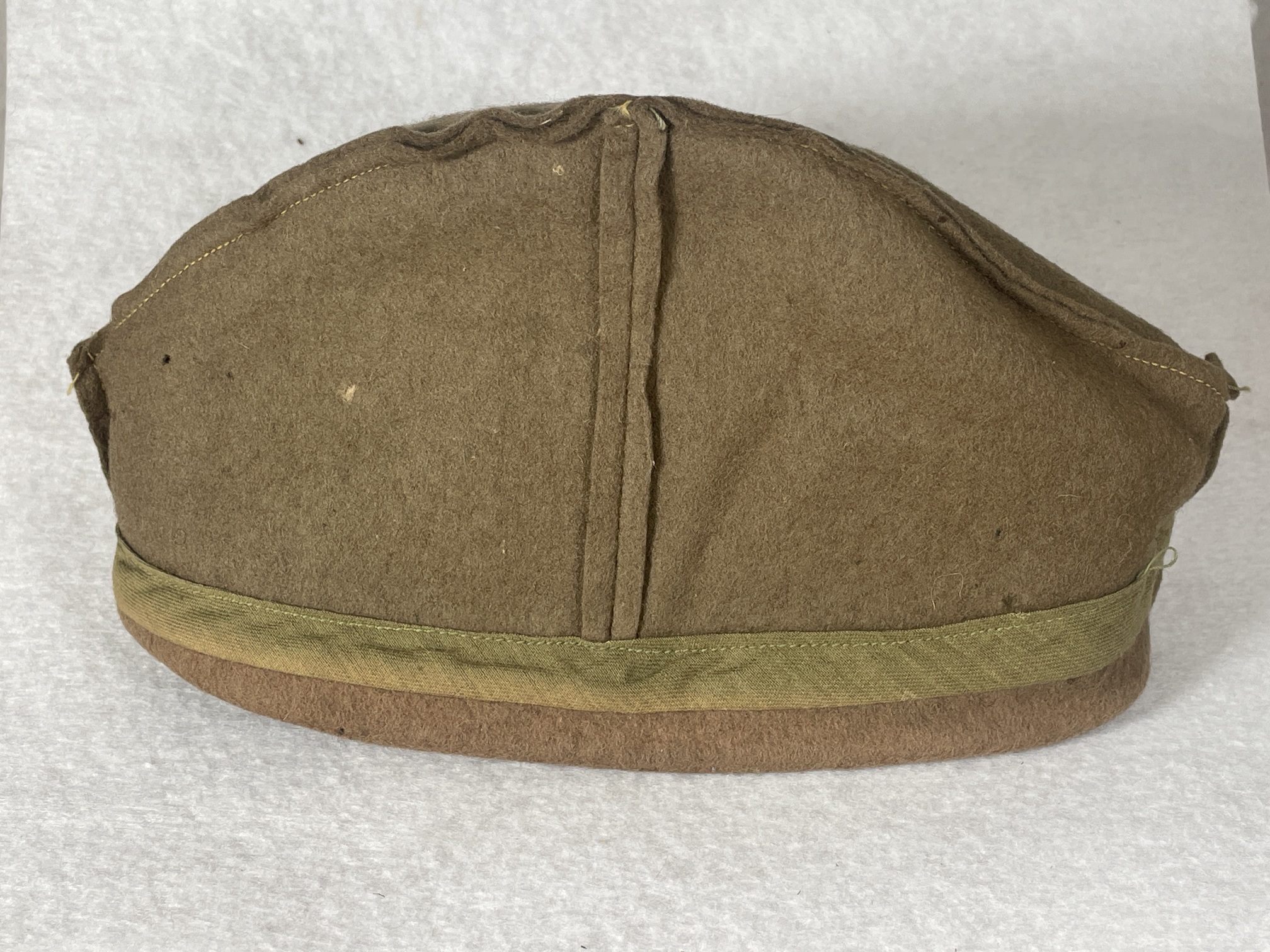 | Description | A soft felt overseas cap, with directly-embroidered crossed rifles on the side. Seven-piece construction, plus a thin cotton headband. Originally a olive drab, it has mostly faded to a medium brown. There is a dark spot, possibly from being displayed with a price tag, above the rifles. There are a good number of mothing holes. Ex-Peter Coleman collection. Pictured in "Wee Warriors and Playtime Patriots", p.80. |