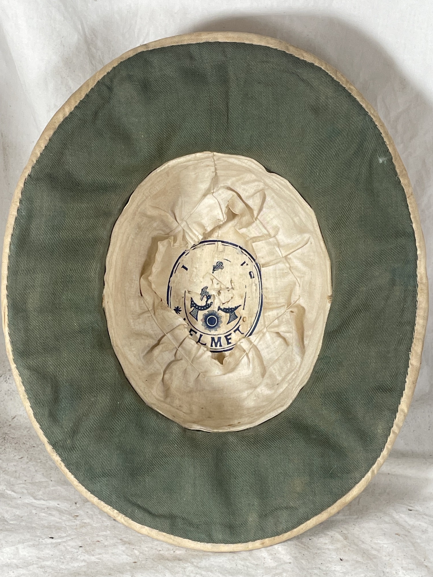 Child's pith helmet. White cotton over (assumed) cork. Two ventilation grommets on each side. Green twill lining under the brim. Thin white cotton or linen lining, partially closed with a thread in teh center, leaving a space to view a label pasted in the center top. The label is blue on white, in a large double oval, but there is significant loss, mostly to the top. The word(s) at the top are not legible. At the bottom is "HELMET". In the center is a blue sun, below what appears to be monogram, possibly "SS" over "A".