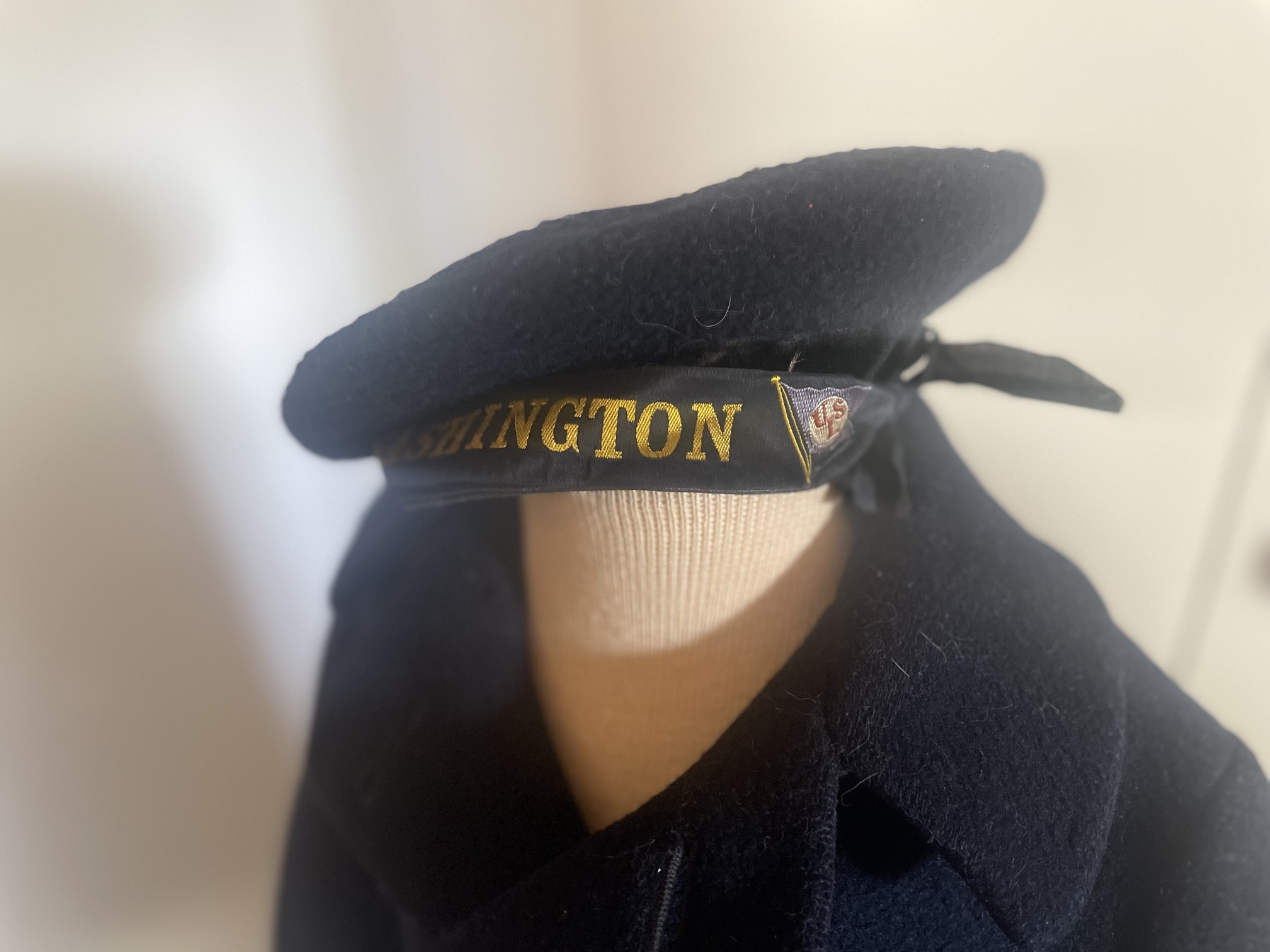 | Description | A fuzzy blue (wool?) "Donald Duck" sailor's hat, with black velvet hat band. Cap band of "S.S. GEORGE WASHINGTON" is loosely stitched over the band. The band is woven, with an American flag on one end, and a blue, two-pointed flag with "U S | L" on a white disc on the other. There are a pair of female snaps, of unknown use, on each side of the headband. In the crown is a faint stamp, believed to be from "L. Bamberger & Co.", the sixth-largest department store in the U.S. in 1929, when it was purchased by Macy's. It remained under its own brand for decades after. The S.S. George Washington was a ocean liner built for the German shipping firm, Norddeutscher Lloyd. At the time of her launch, in 1908, only the Lusitania and Mauritania were bigger. The cap band was from the period of 1921-1931, when the S.S. George Washington was operated by the United States Lines, along with other formerly-German ships. She was operated as a troop ship by the British under Lend-Lease during WWII, as well as the US Navy and Army, after retrofitting her boilers for oil firing, as the British found she was too slow with the coal-fired boilers. Associated with Child's heavy chinchilla wool pea coat. |