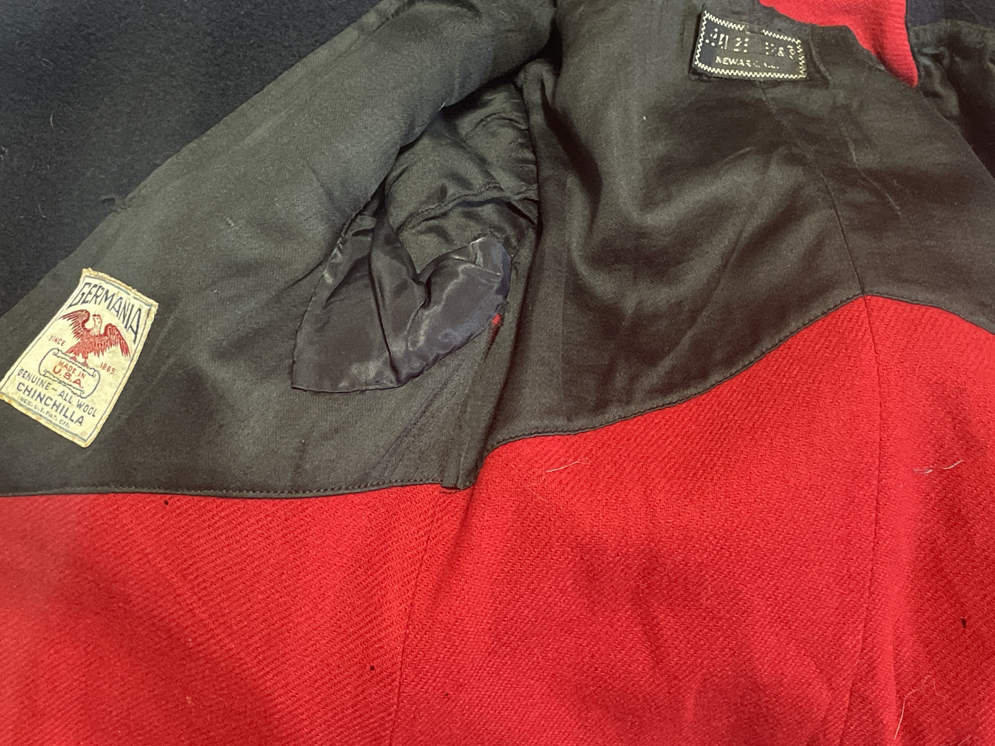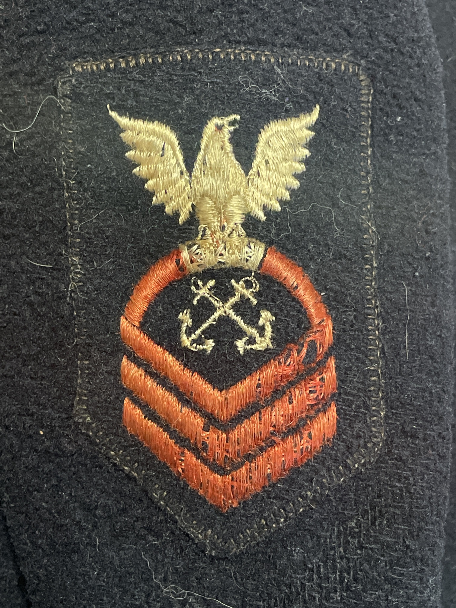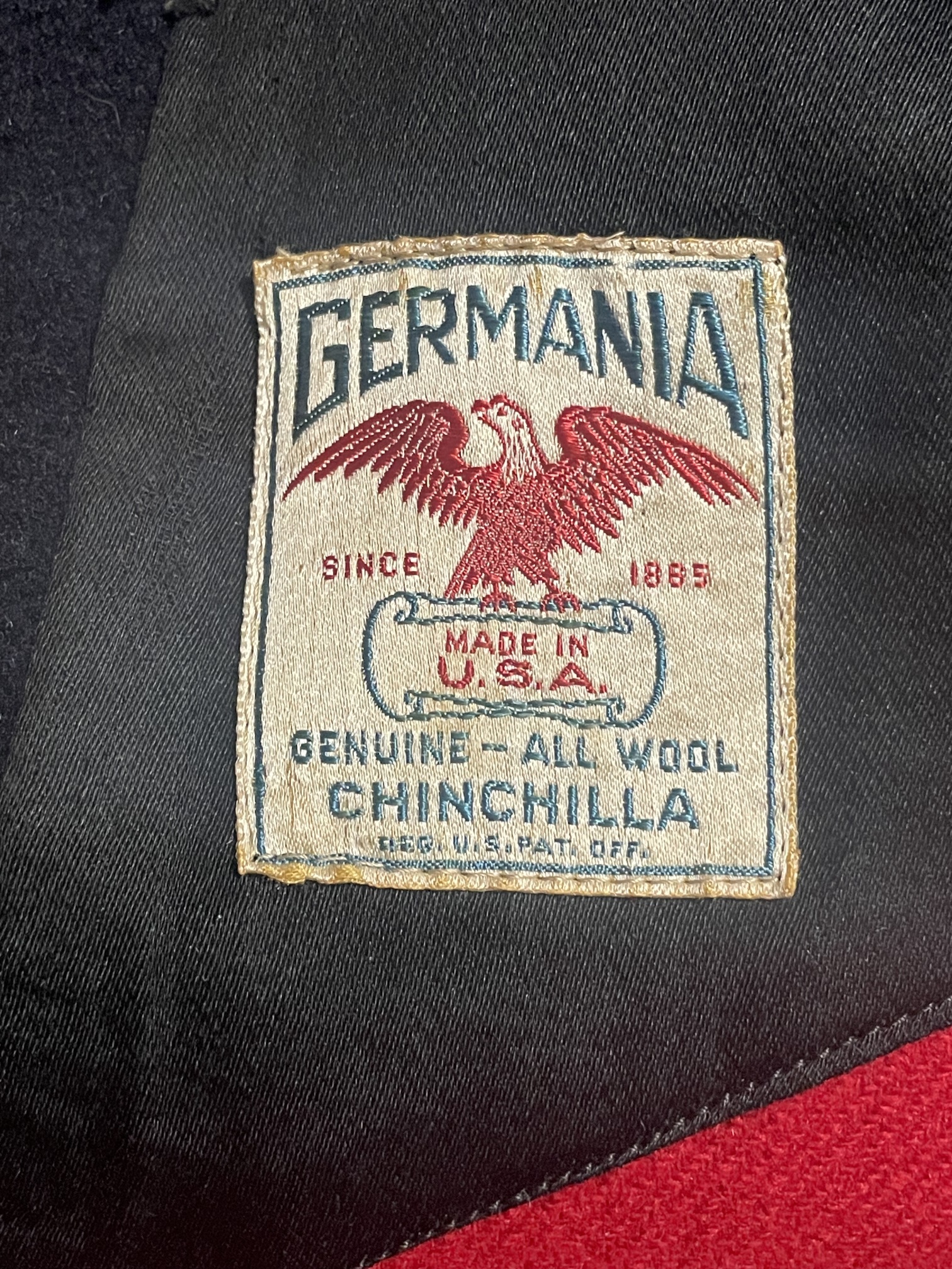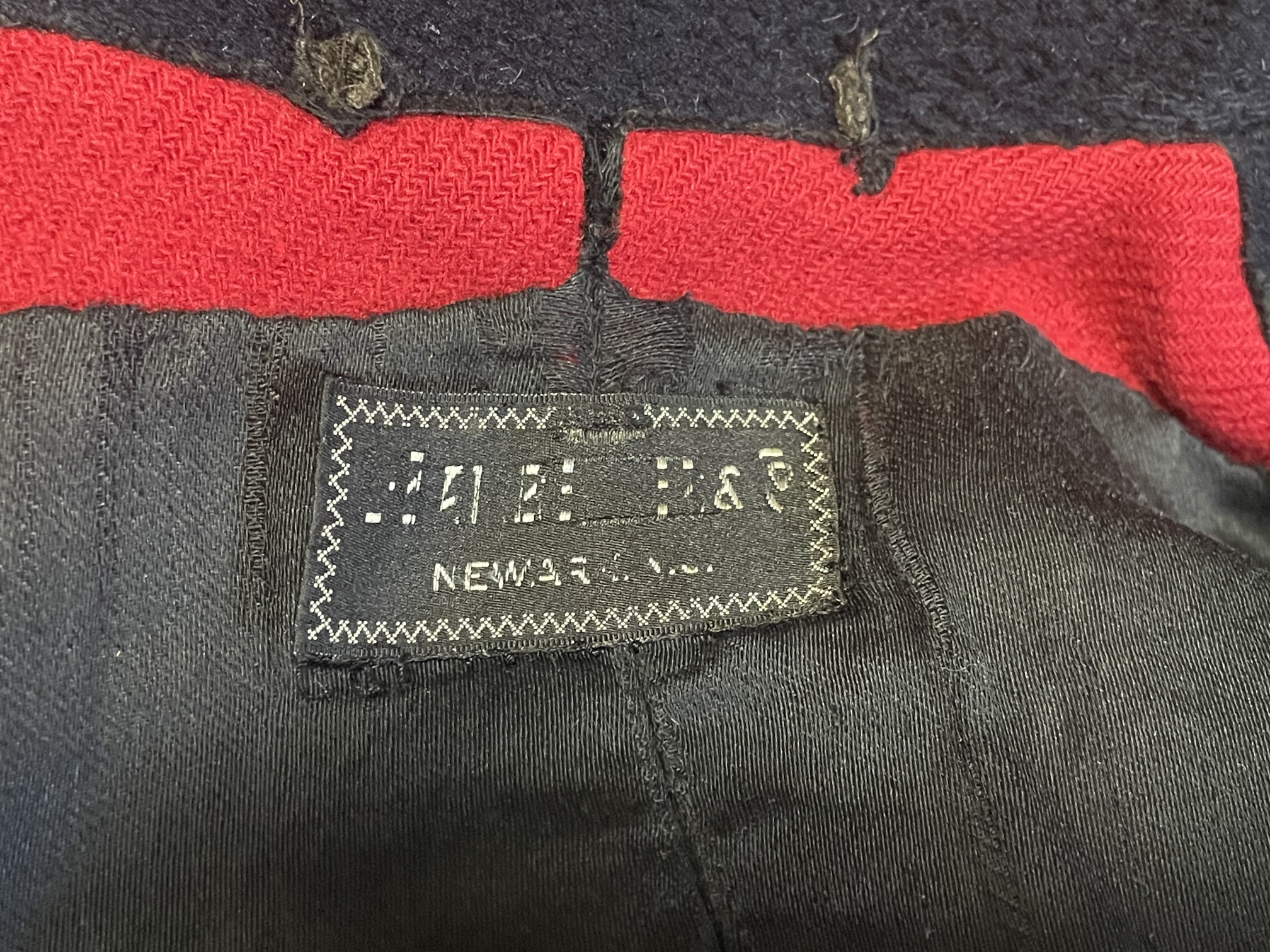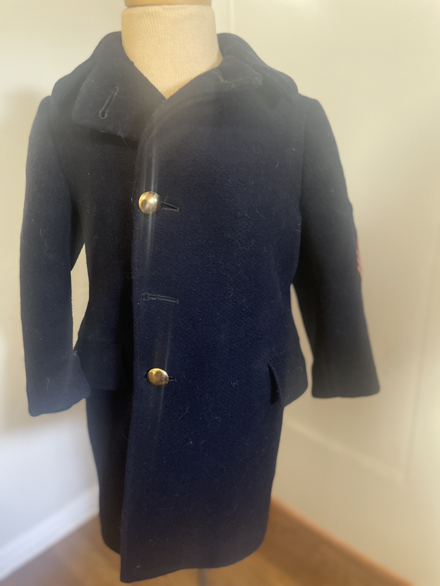 | Description | A blue peacoat of heavy chinchilla wool. It is double-breasted, with a eight-button front. Only three buttons remain, two plain domed brass buttons on the front, and a similar-sized U.S. Army style button, at the neck. There is one small U.S. Navy style button at each cuff. It is not clear if these are all original. On the left sleeve is a Chief Boatswain's Mate's rating, white and red on blue embroidered on a thick blue wool patch. The coat is lined in red wool and black cotton. There is a manufacturer's tag on the chest, and a retailer's tag in the neck. The former is a large white rectangle, with red and blue embroidery, including a large central red eagle: "GERMANIA | SINCE 1865 | MADE IN | U.S.A. | GENUINE - ALL WOOL | CHINCHILLA | REG. U.S. PAT. OFF.". The latter, is a white-on-black woven tag, with some damage to the wording. It appears to say "A[??????] & Co | NEWARK N.J.". It's possibly a Bamberger's tag, like that in the associated hat. Newspaper advertisements show that Germania Chinchilla coats were especially popular from 1927 until 1934, and cost around $200 in 2023 dollars. Associated with Child's sailor's hat, S.S. George Washington (USL). Several similarities to Child's U.S. Navy wool peacoat. |