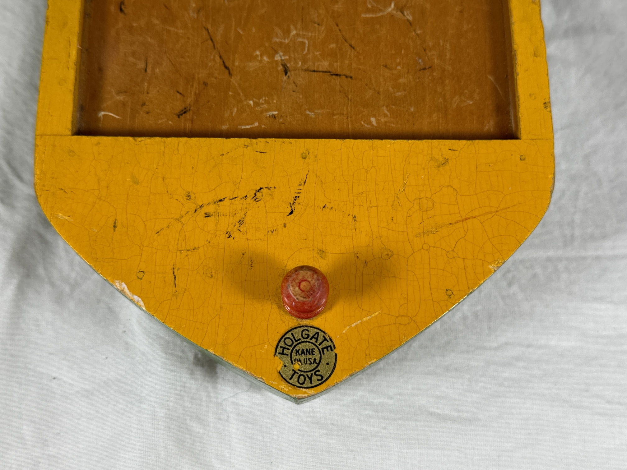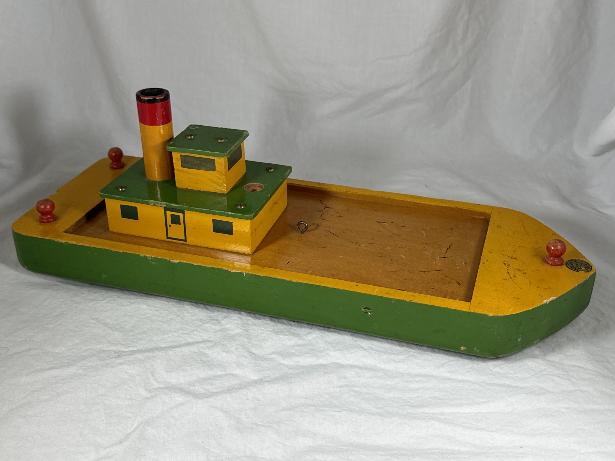 | Description | A type II Freight Lighter, in very good condition, but missing the derrick (crane) and cargo. There is a single Type 3 decal (dt3) on the bow, 95% intact. Visually similar to the Type I (see: Holgate #52 "Freight Lighter", with cargo), but the hull is very different, being assembled from four pieces of wood, instead of routed from a single piece. The upper deck and railing are made up of 4 pieces of wood, 1/4" thick. The railing/upper deck is also yellow, not red, and there are three bollards, all on the upper deck (versus one on the bow, on the lower deck). The hull is also 1/4" shorter in both directions, but just slightly taller. |