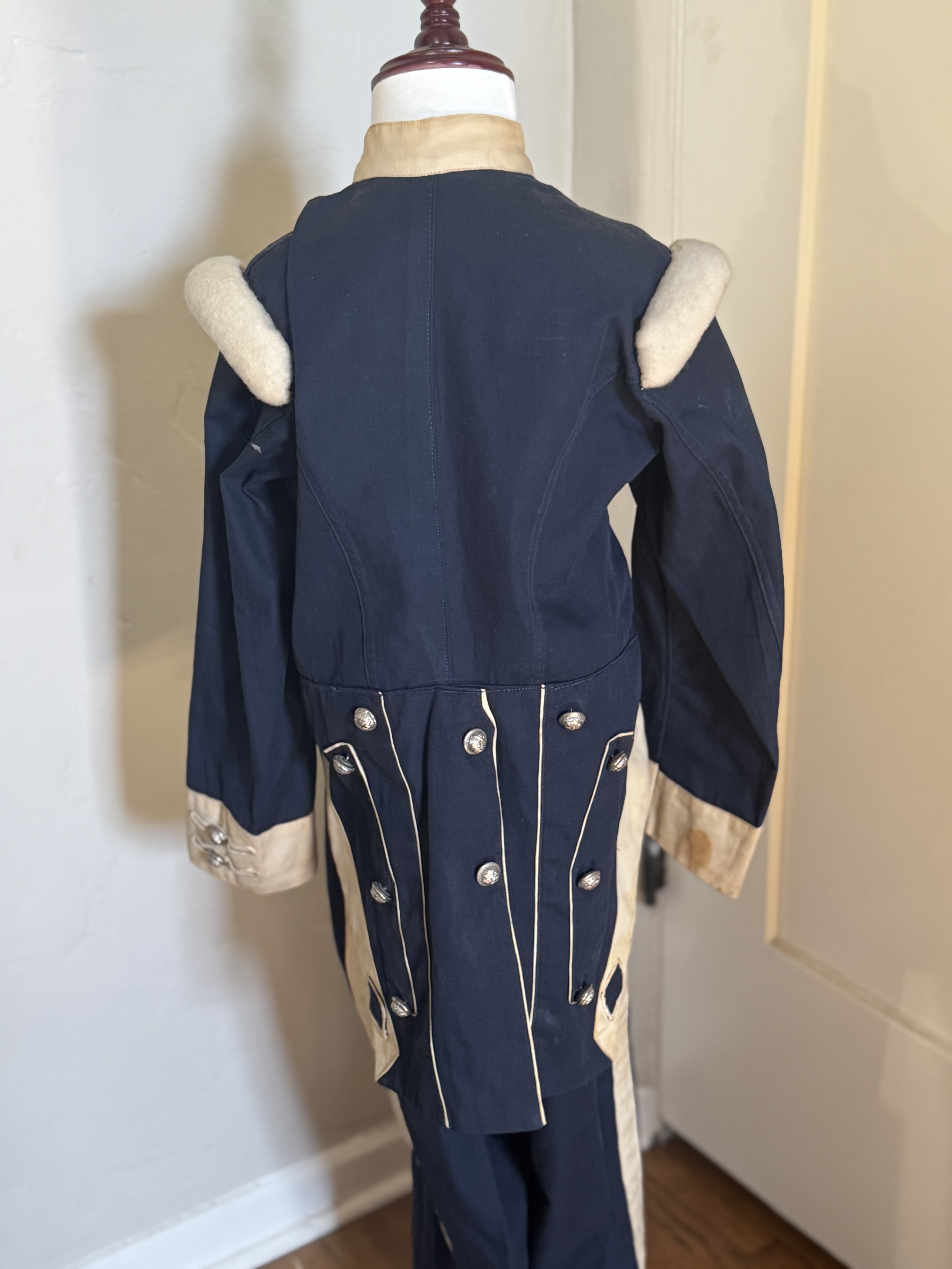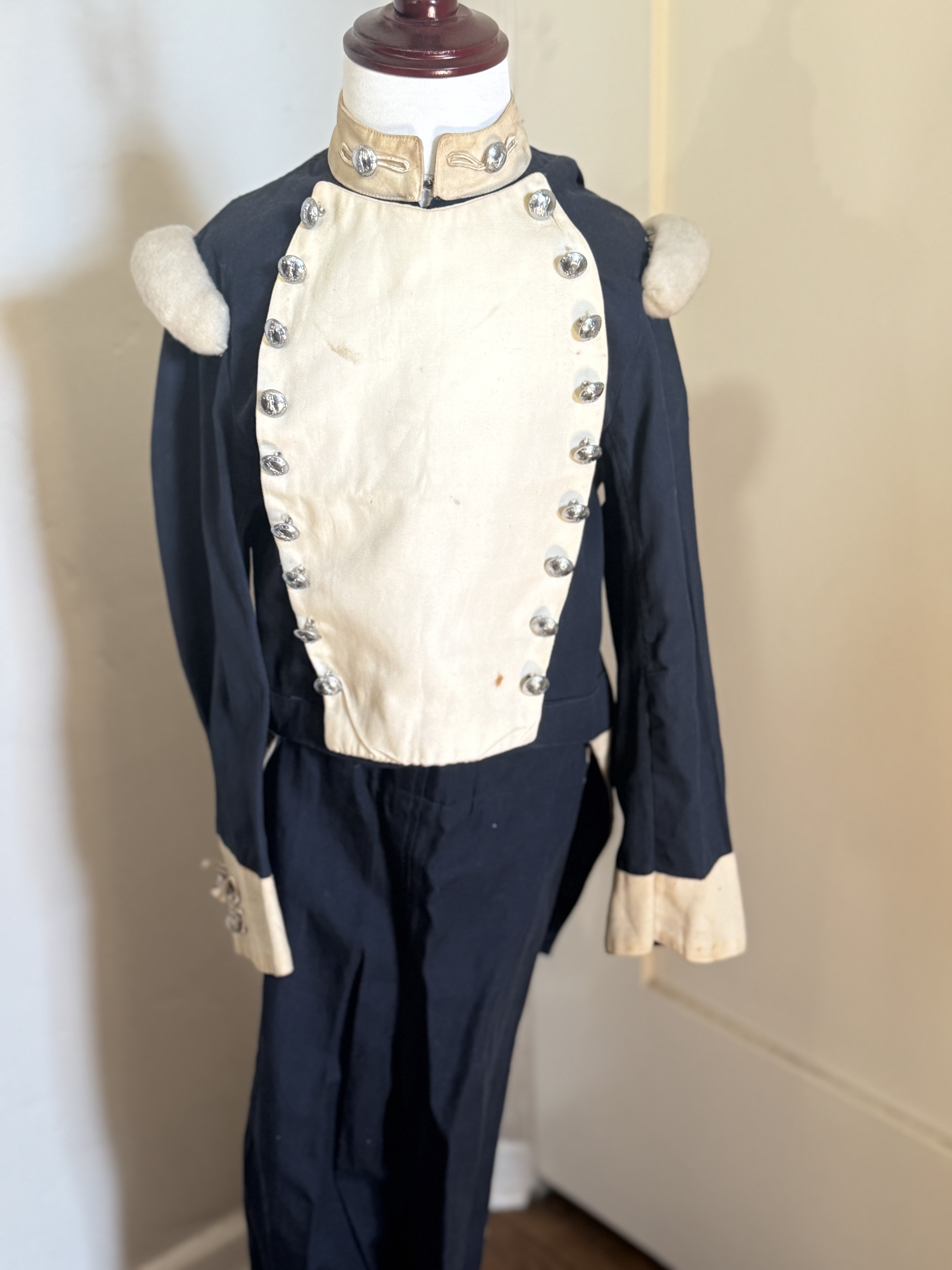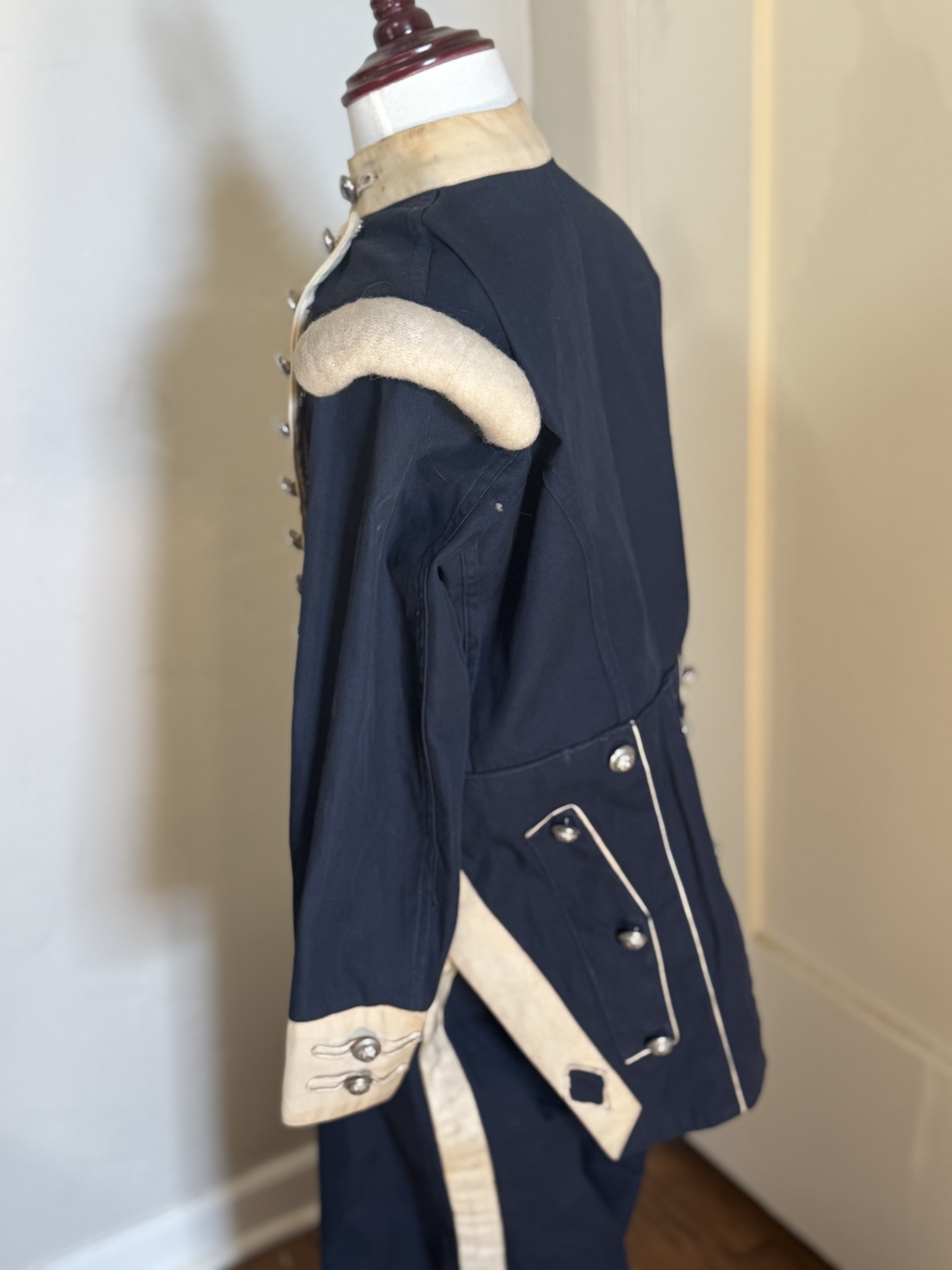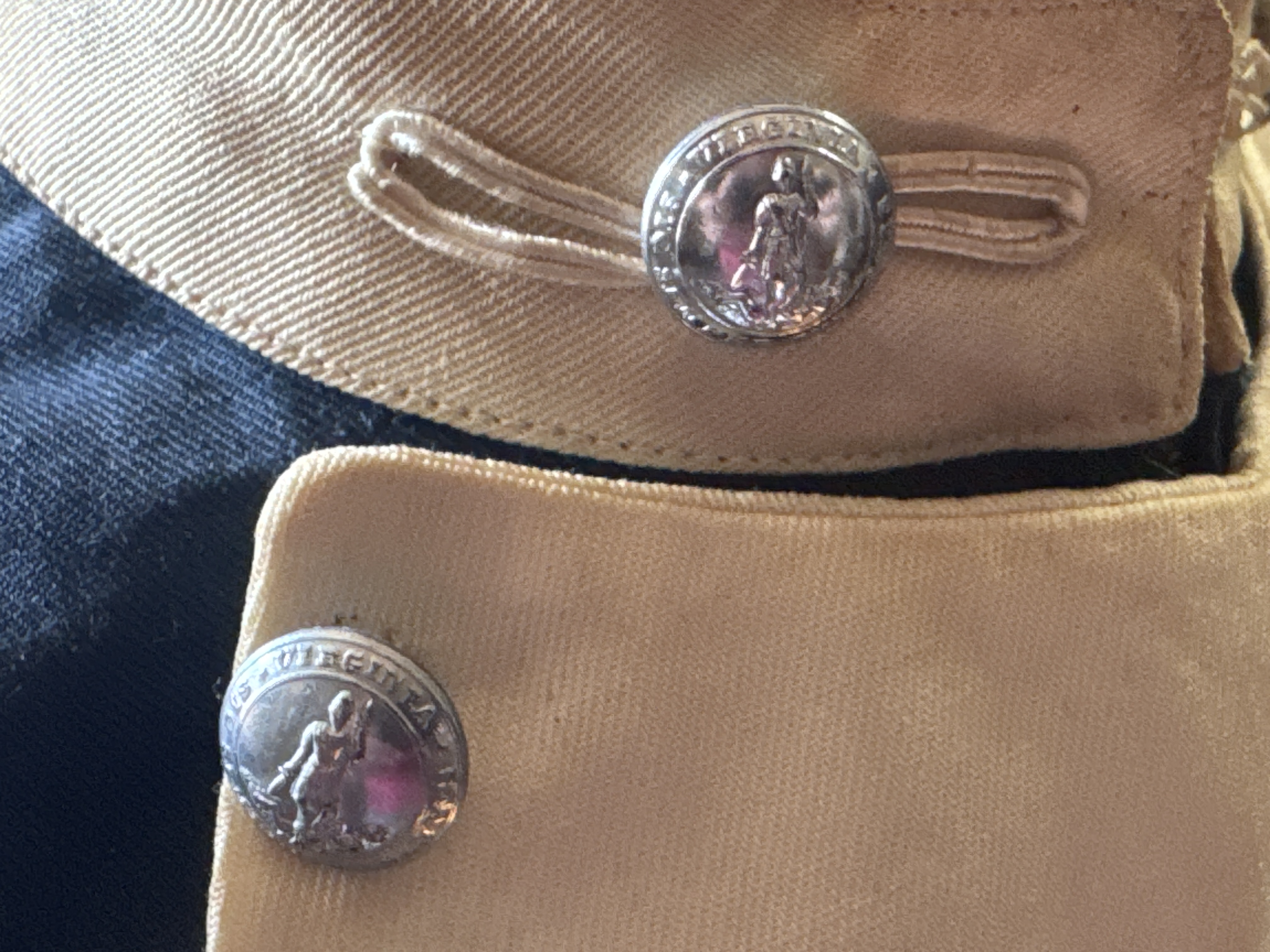 A uniform of blue cotton with white facings and strips. Silver-colored "SIC SEMPER TYRANNIS" Virginia buttons, three-piece, marked "HORSTMANN PHILADA.", with two dots on the last, very small, "A", followed by a large dot surrounded by three smaller dots on all but the top left corner.