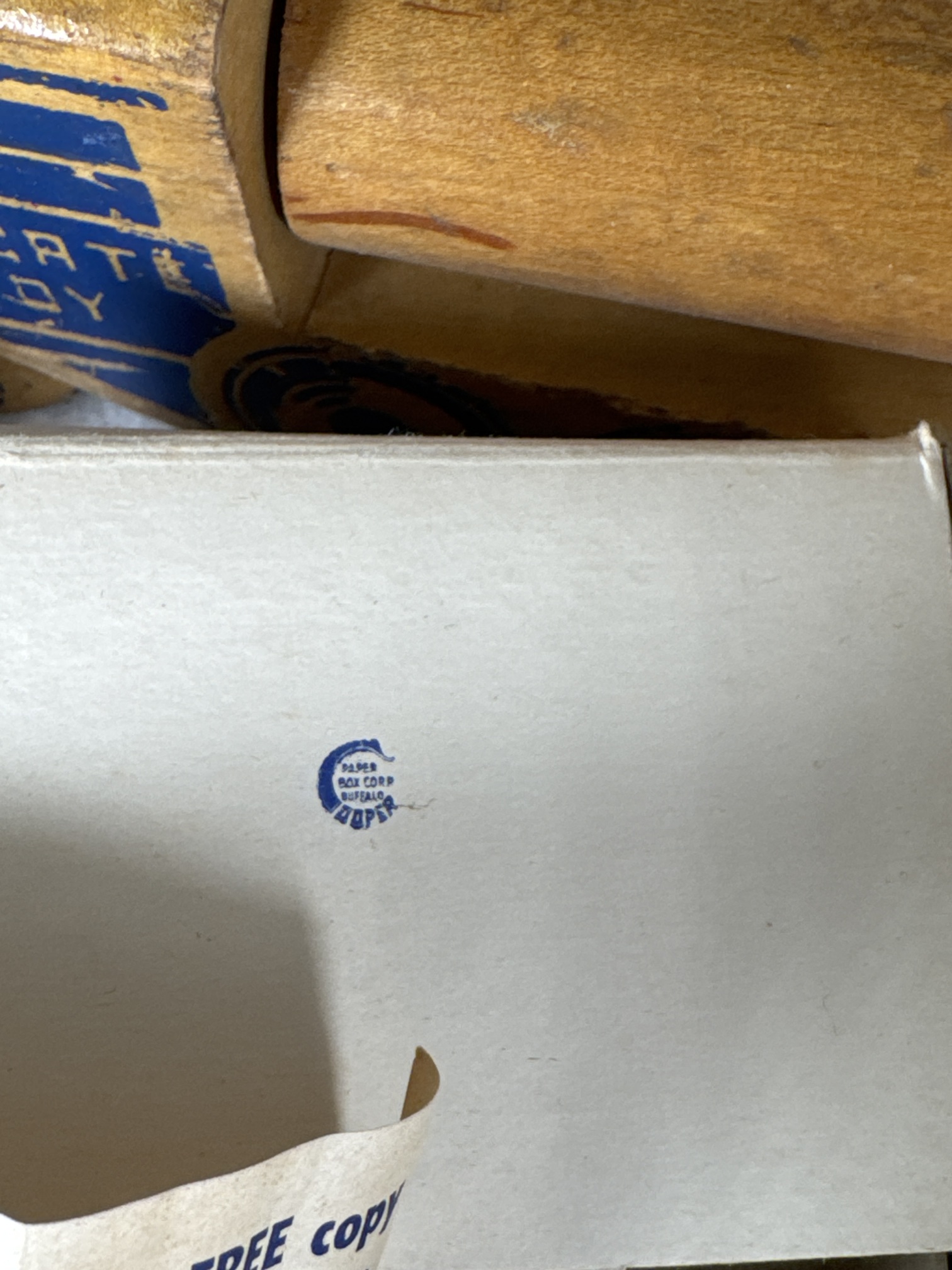 | Description | Two piece Baby Choo-Choo, with engineer with blue hat and painted face. Pull-string with green ball. Train is in good condition. Pull string is frayed and repaired. Late (wartime) version, with no decorative metal components, and pull-string inserted through a hole, not tacked. One piece white box with blue printing, including the three-trees logo and the Parents' Magazine logo. Price of $1.25 (underlined 25) written on left end of box. The box also includes a label to "stick on the back of a penny postal" in order to request a catalog. This is a complete version of Holgate #1037 "Baby Choo-Choo", with pull-string and ball. |